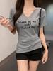 Camiseta negra de manga corta con hombros descubiertos para mujer, nueva camiseta de verano 2025 con estampado de letras y cuello redondo