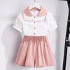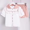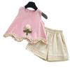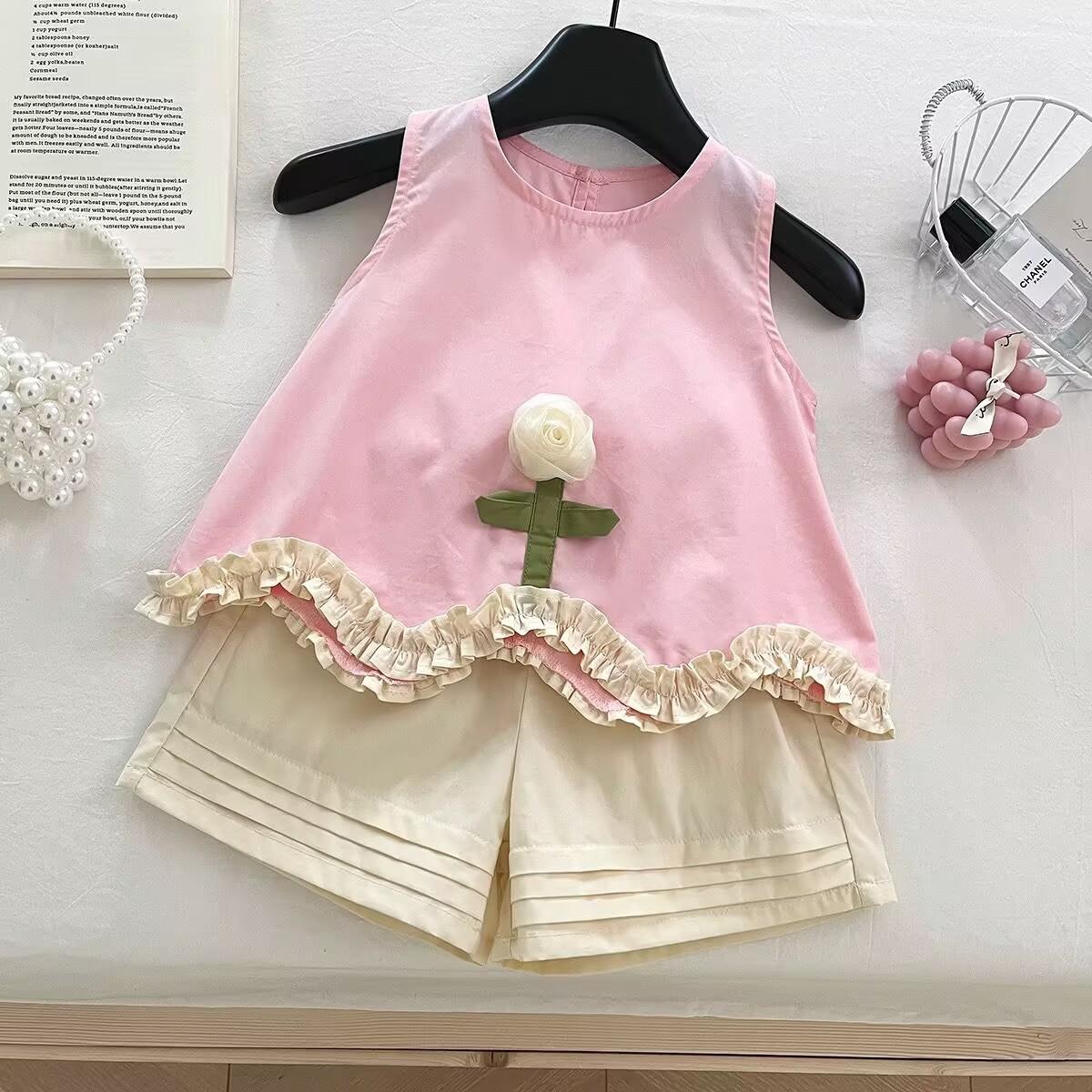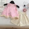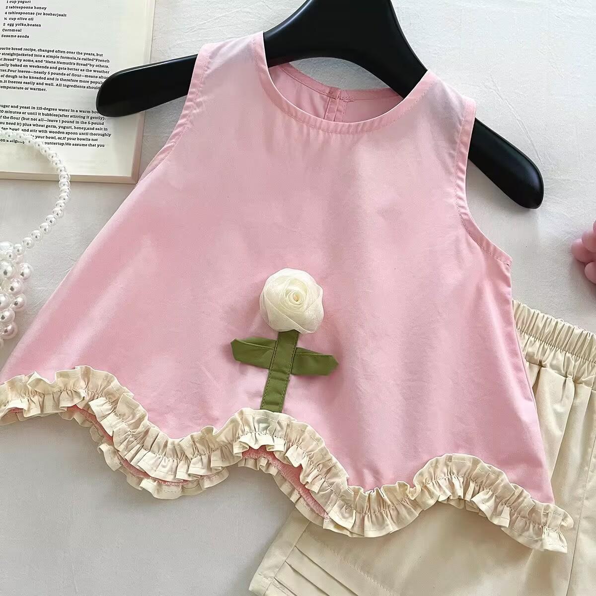 Traje de verano para niñas 2025, nuevo estilo coreano, chaleco sin mangas con flores, camisa y pantalones cortos de encaje, conjunto de dos piezas para niñas pequeñas