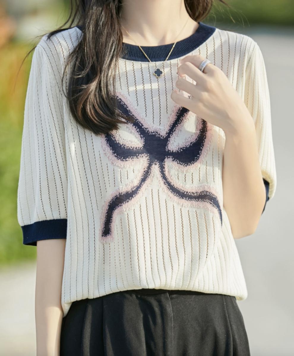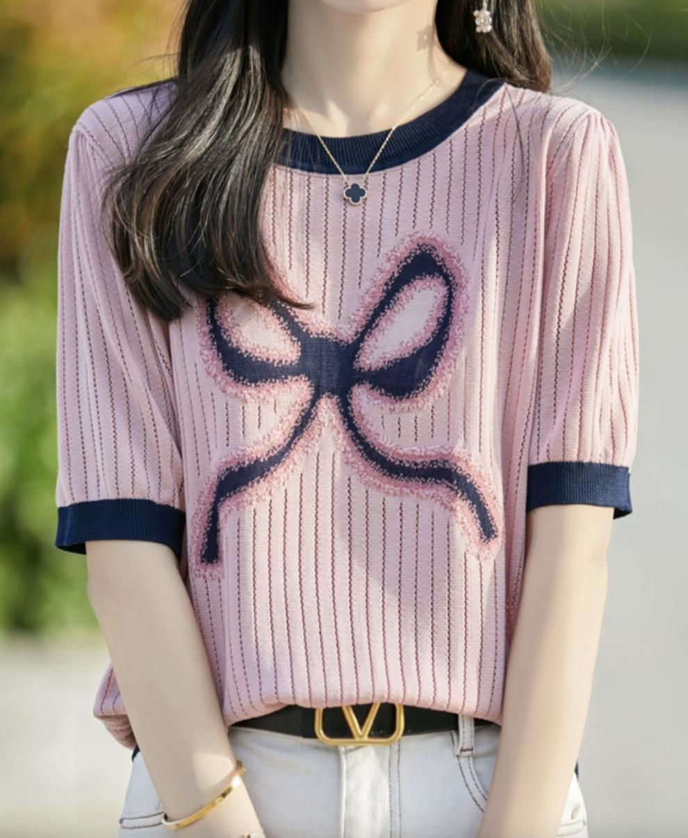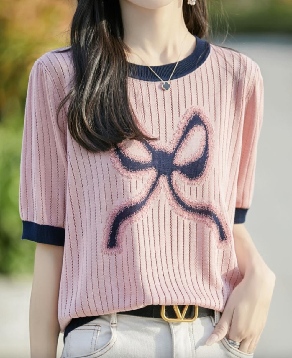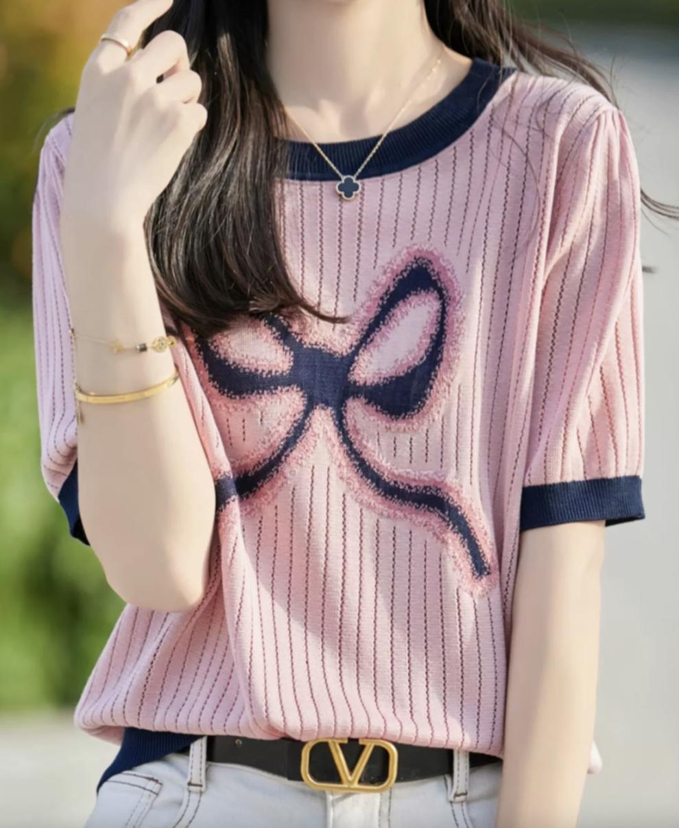 Compra Camiseta de Manga Corta para Mujer 2025 Nuevo Estilo Lazo Especial Talla Grande Verano para Mujer Delgada Holgada Tejido de Punto Seda de Hielo Top al por mayor en Joom.pro
