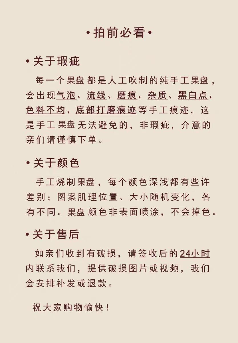 Cada plato de fruta está soplado a mano y parecerán platos de fruta hechos a mano.Burbujas, líneas de corriente, marcas de desgaste, impurezas, manchas blancas y negras: color desigual, marcas de pulido del fondo y otros rastros manuales, que son inevitables en los jarrones hechos a mano y no son defectos.Queridos amigos a quienes les importa, hagan sus pedidos con cuidado.