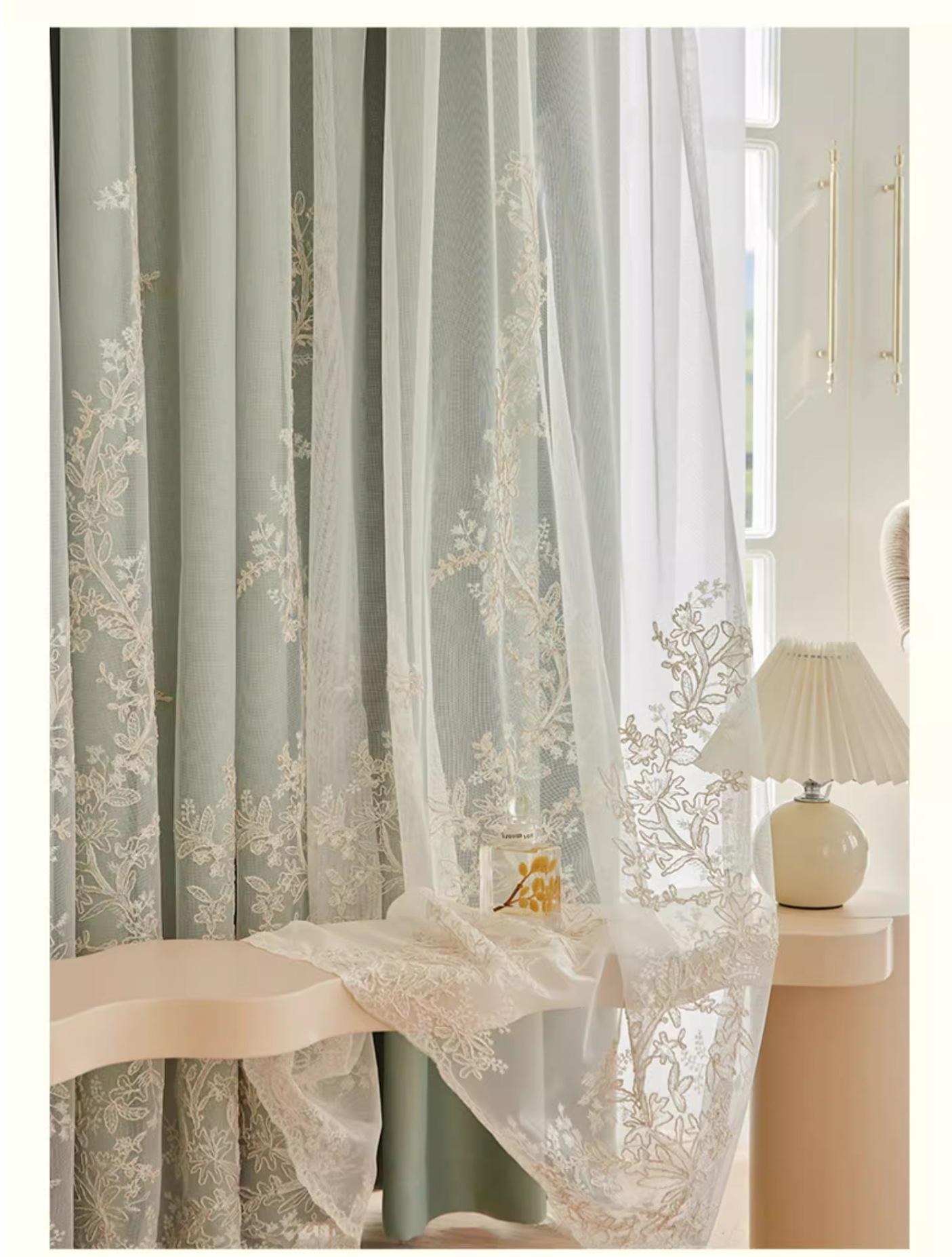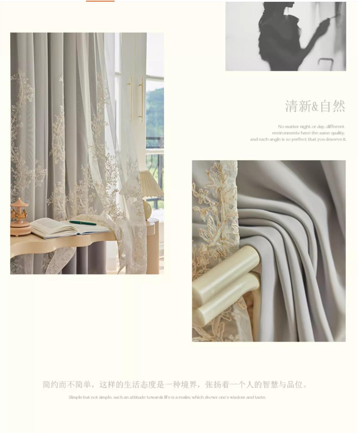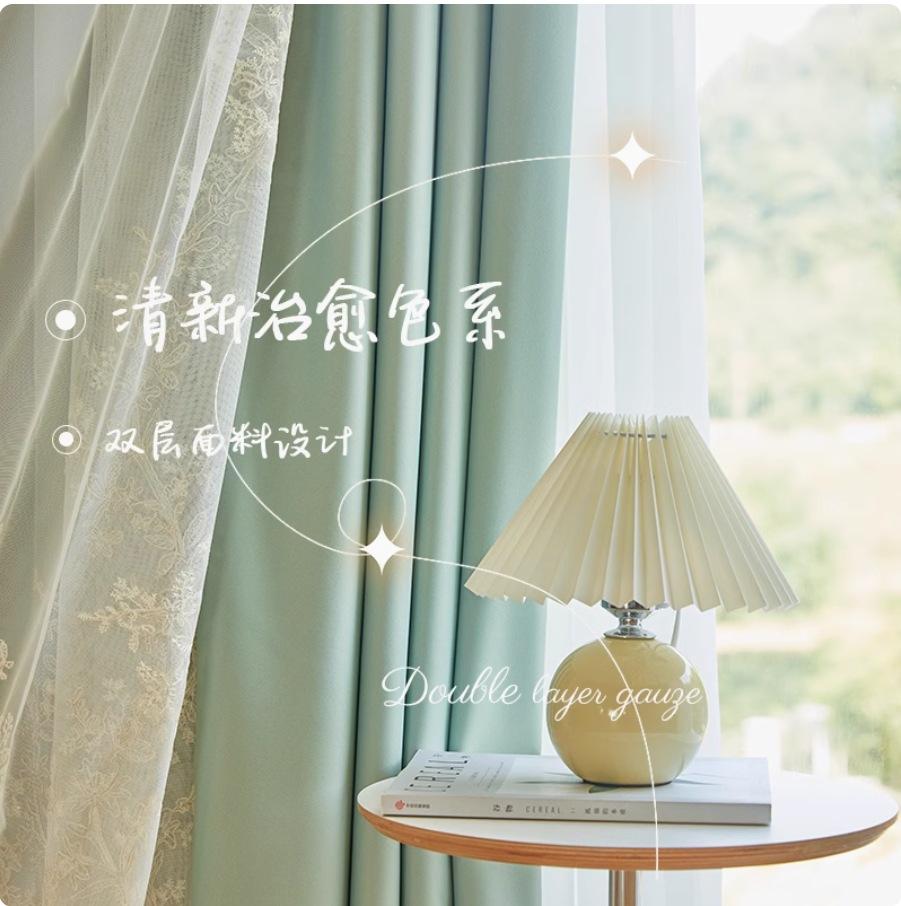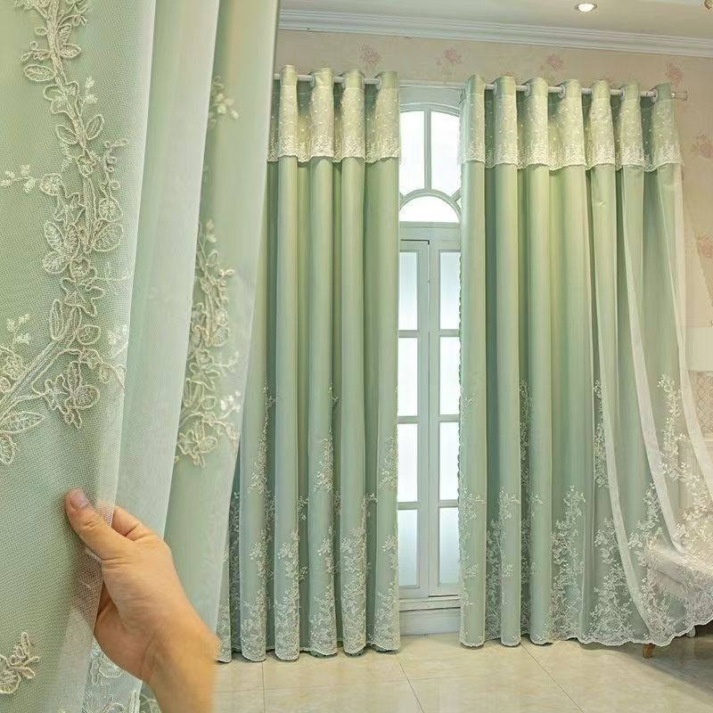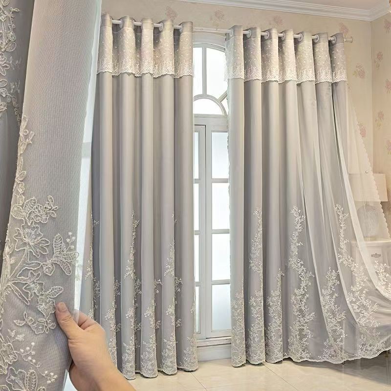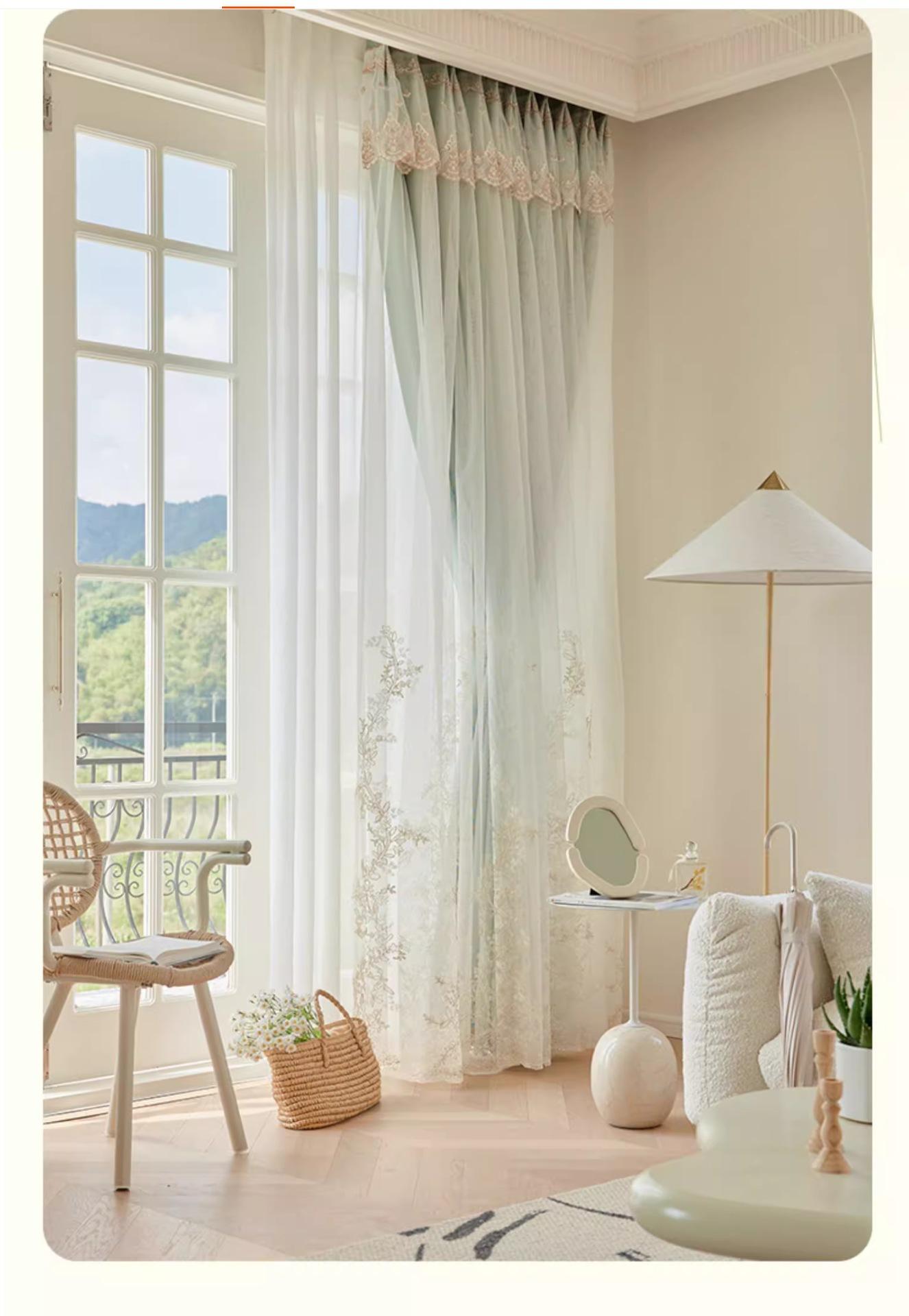 Cortina opaca completa con acabado nórdico simple para dormitorio, estilo princesa, doble capa de gasa bordada con gancho integrado.