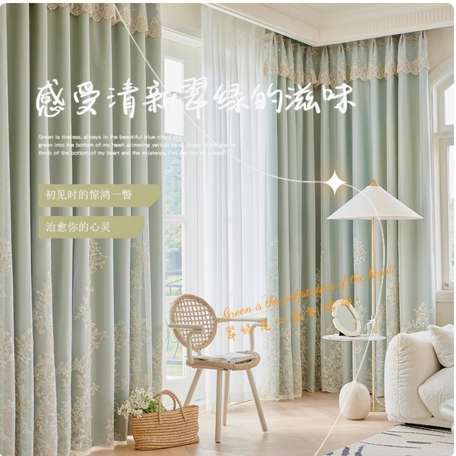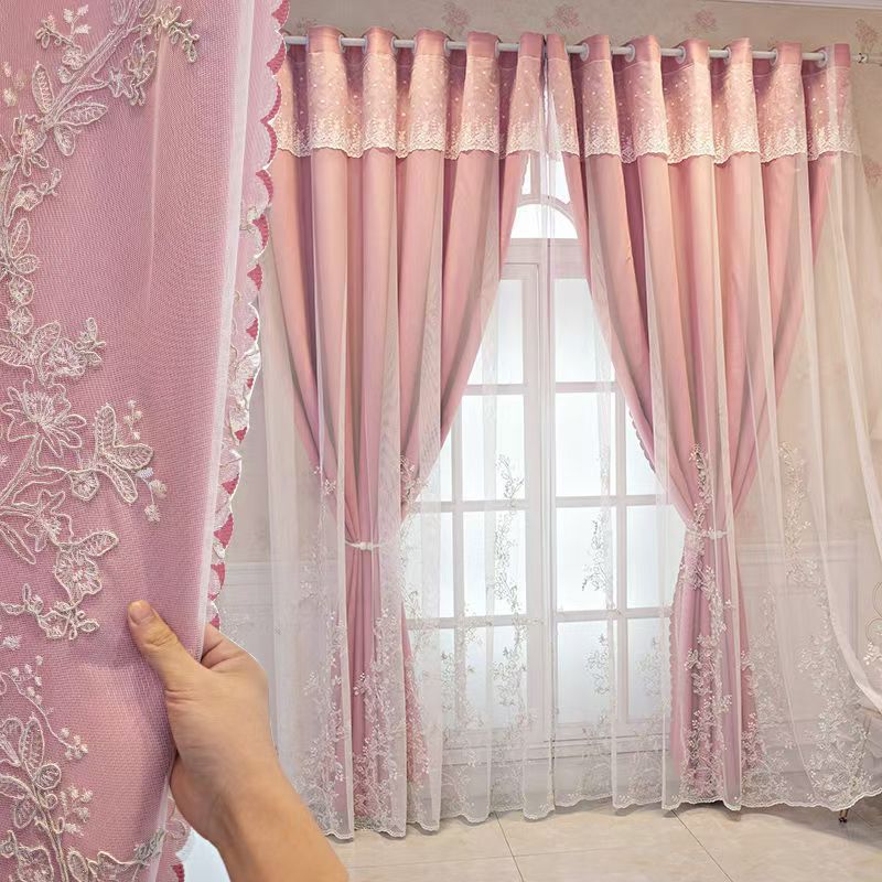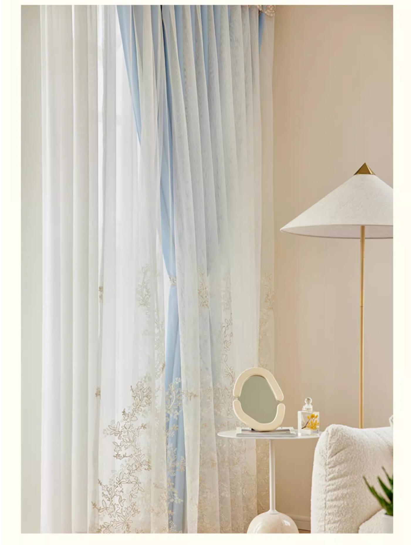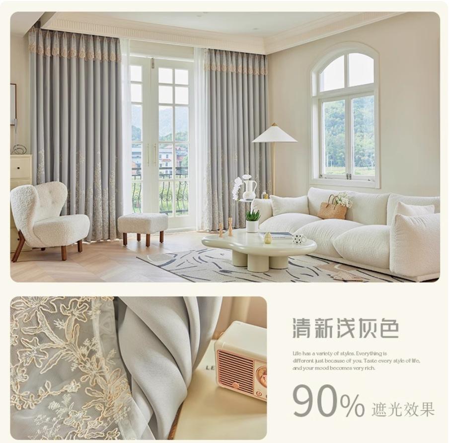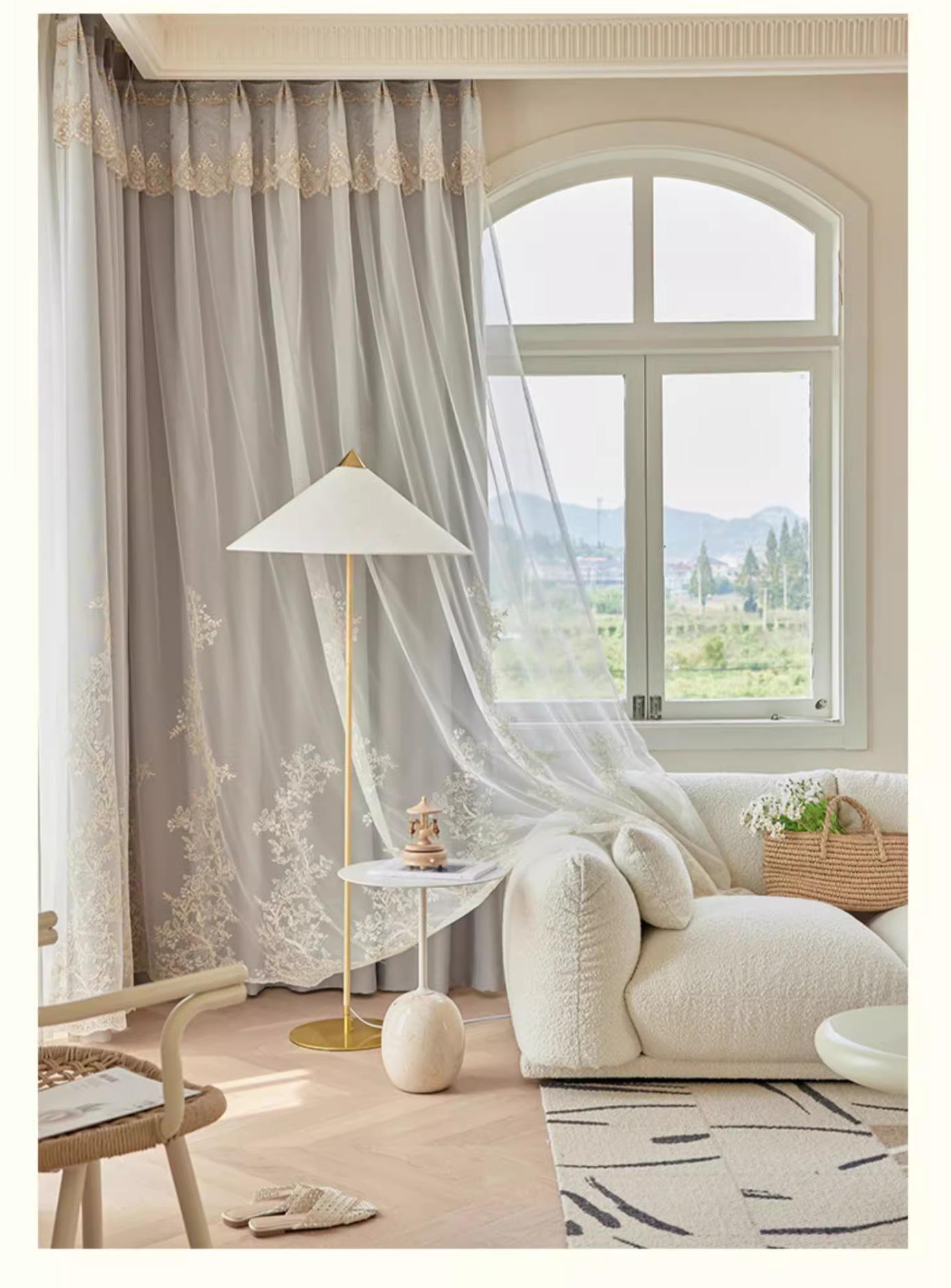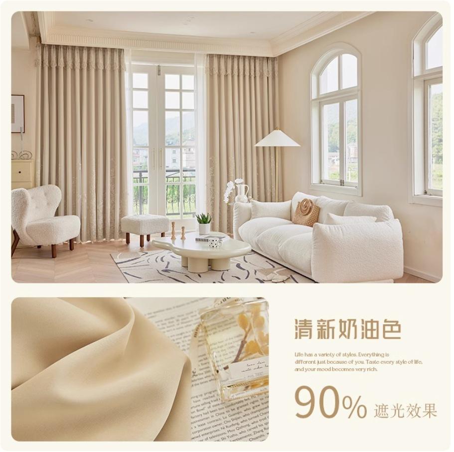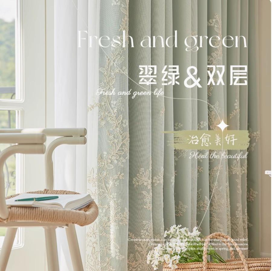 Cortina opaca completa con acabado nórdico simple para dormitorio, estilo princesa, doble capa de gasa bordada con gancho integrado.
