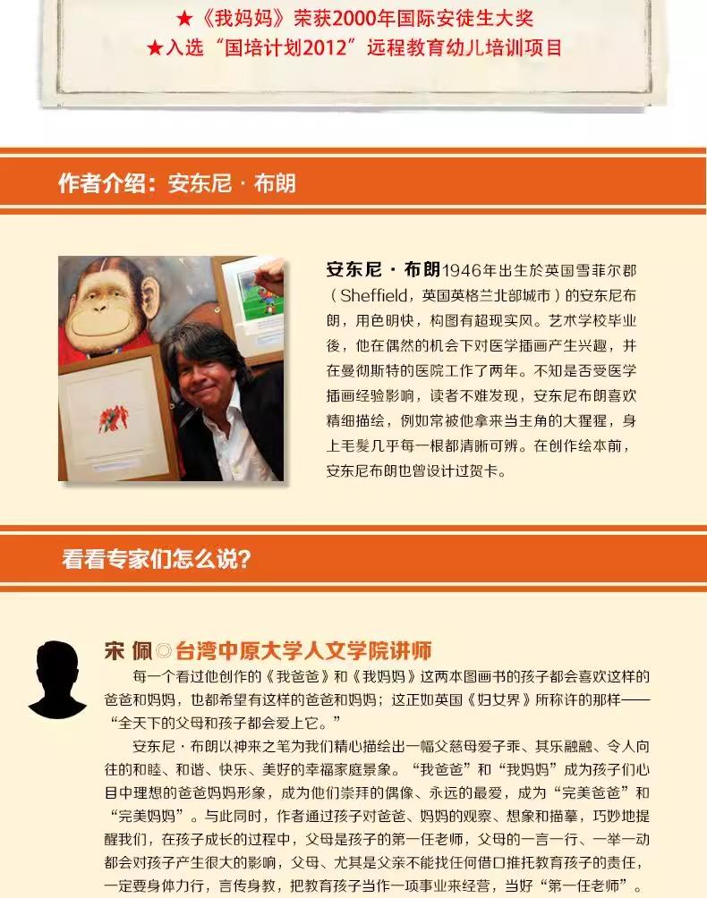 Mi papá Se podría decir que "Mi papá" es el homenaje del autor a todos los padres. Sin embargo, desde la perspectiva de Anthony Brown, este libro ilustrado también busca conmemorar a su propio padre. Anthony Brown dijo una vez: "Mi padre es una persona muy especial. Parece fuerte y seguro de sí mismo, pero también es tímido y sensible, un poco como el gorila que me encanta dibujar. Además de enseñarme a dibujar, también me animó a practicar varios deportes, como rugby, fútbol y críquet...". Este padre, alto y fuerte, a sus ojos, falleció repentinamente de una enfermedad cuando Anthony Brown tenía diecisiete años, lo cual lo afectó profundamente y le llevó muchos años superarla. Anthony Brown dijo que la bata a cuadros color canela, el pijama y los zapatos que vestía el padre en "Mi papá" eran todas prendas de su padre. Se guardaron en una caja durante muchos años y aún conservaban el olor de su padre. El estampado a cuadros de la bata no solo aparecía en su padre, sino también en la portada y en la tostada. ¡Quizás, en los ojos de Anthony Brown, la figura de su padre está en todas partes! Mi mamá "Mi mamá" está ilustrada por Anthony Brown (Reino Unido)