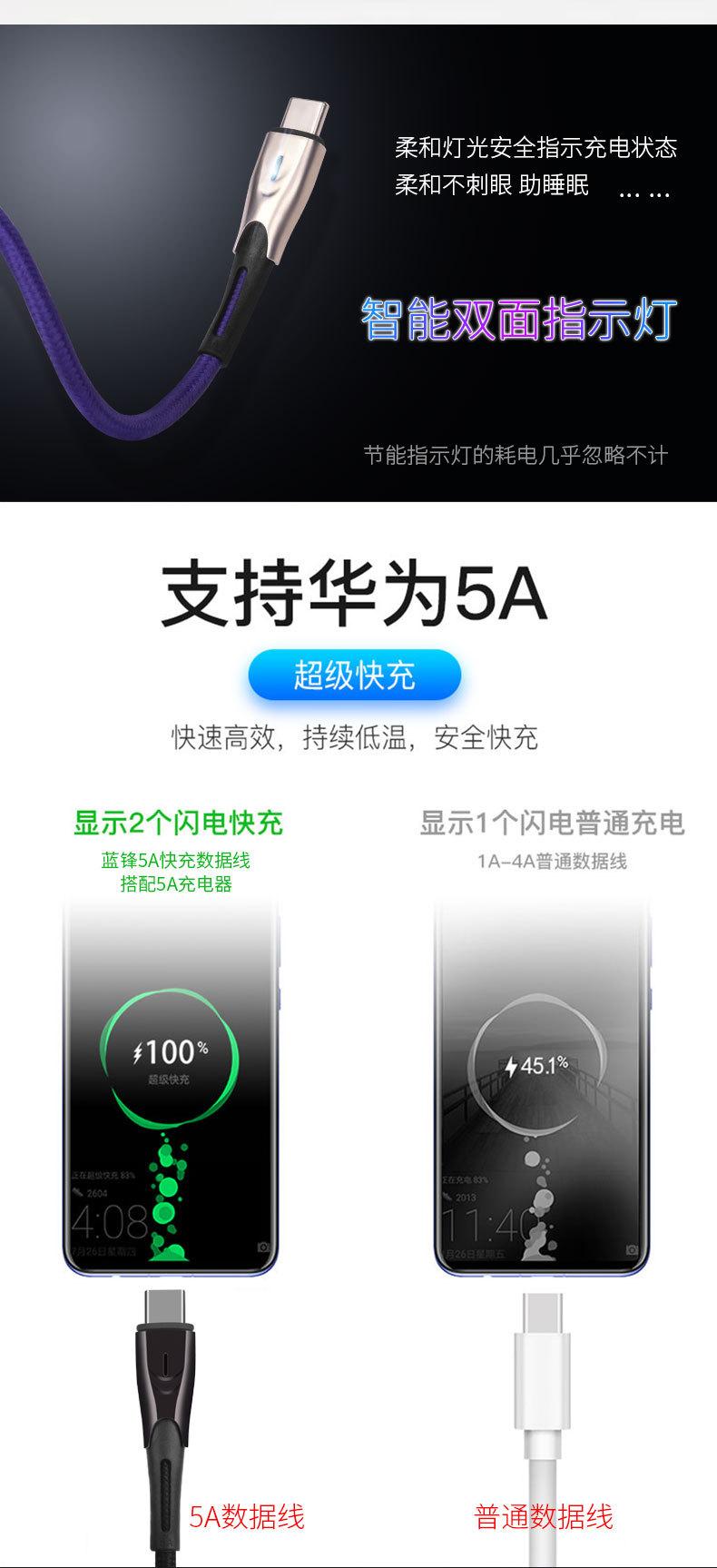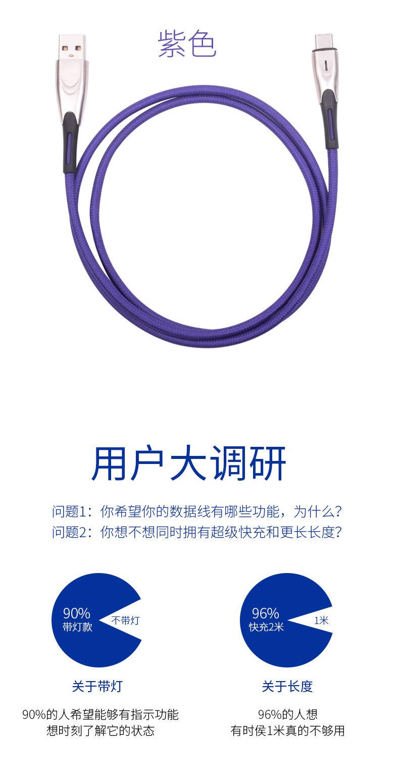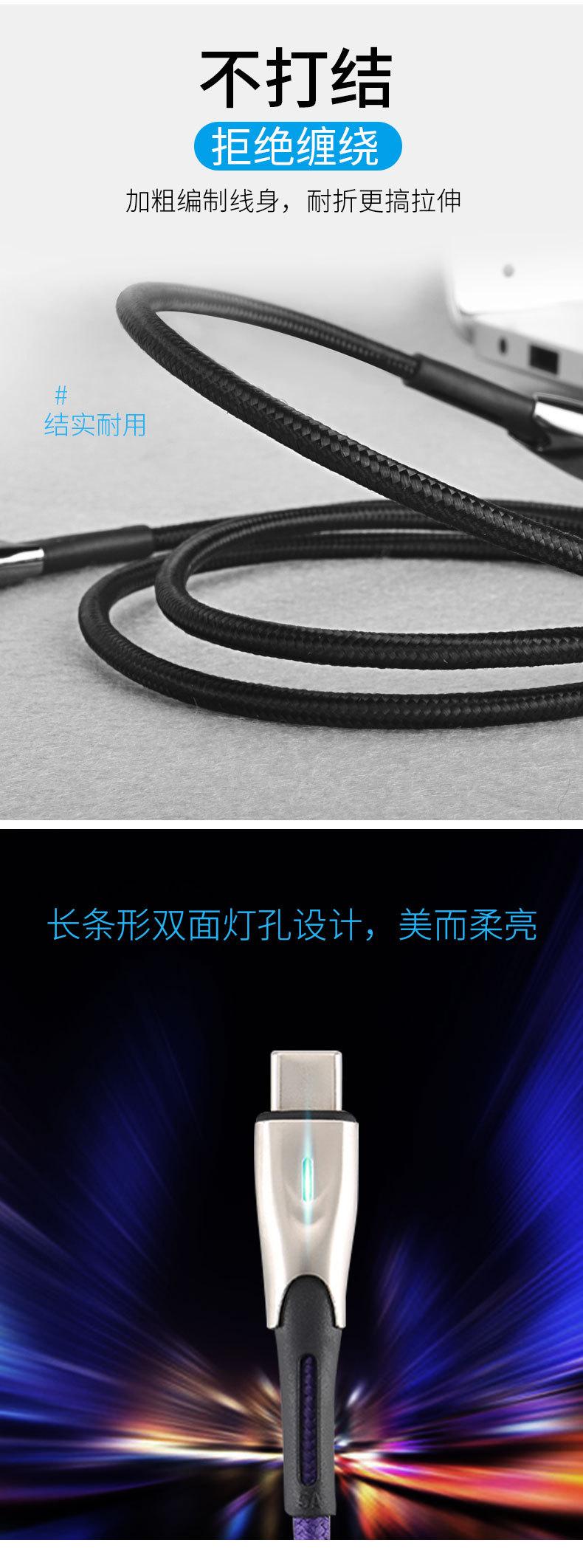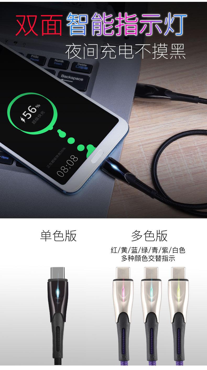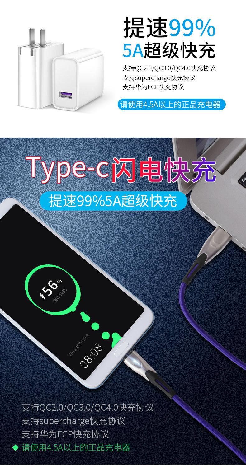 Cable de datos tipo C de carga rápida 5A de fábrica con luz indicadora, cable de datos para teléfono móvil de carga súper rápida de aleación de zinc.