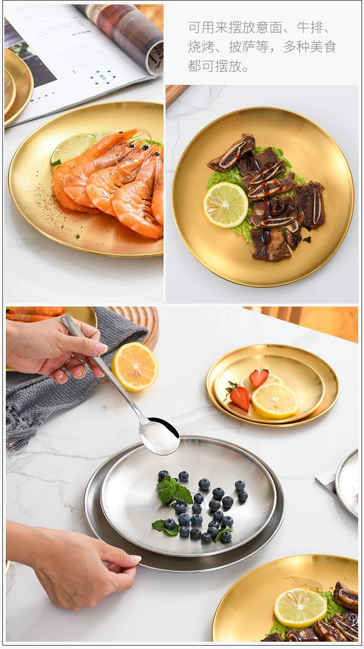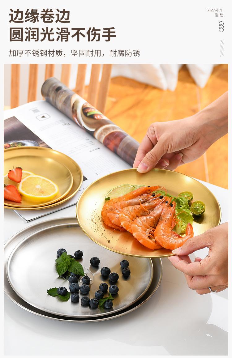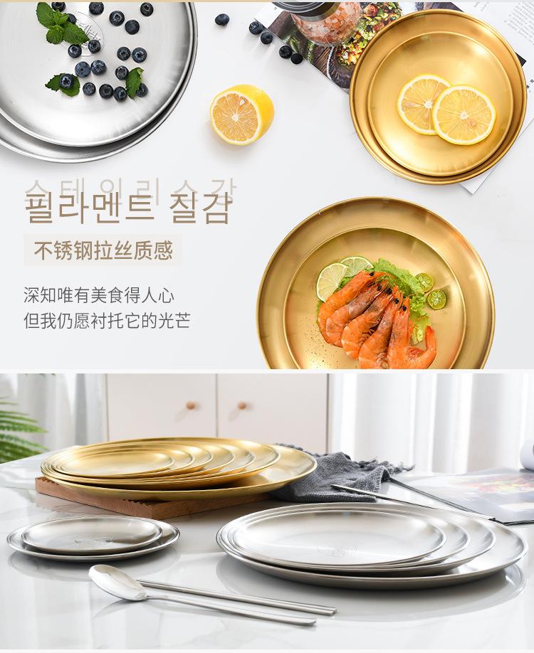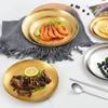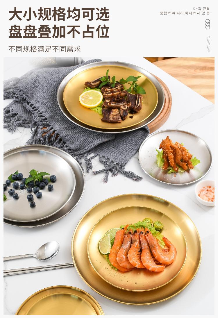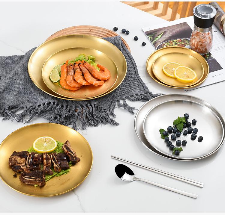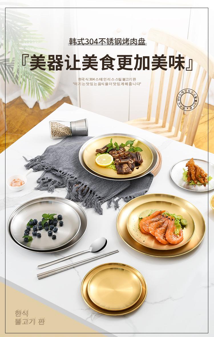 Bandeja gruesa de acero inoxidable estilo coreano con forma de disco dorado, plato para fruta, plato para pastel, plato comercial para hueso, plato para barbacoa, plato poco profundo