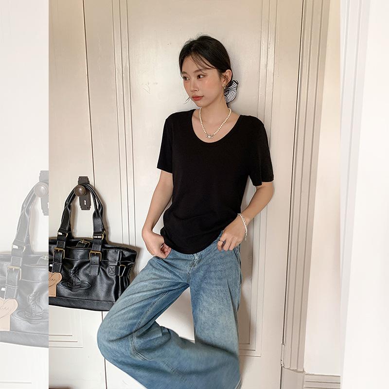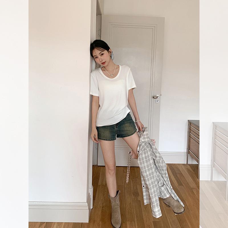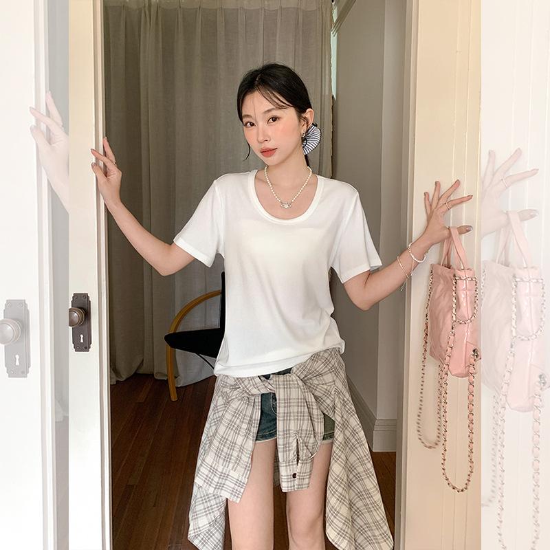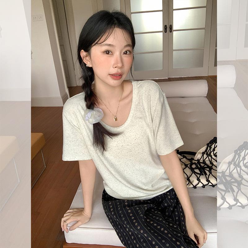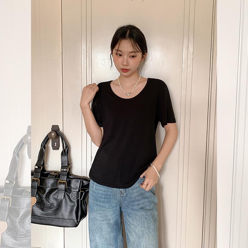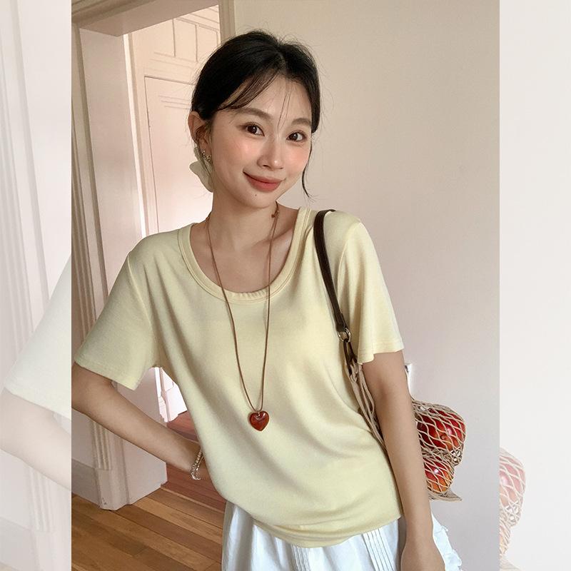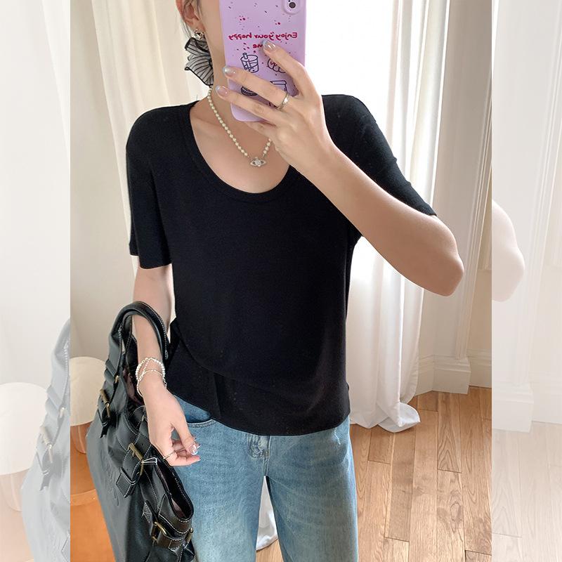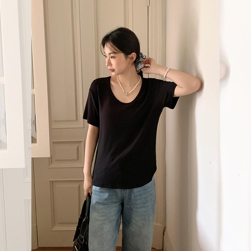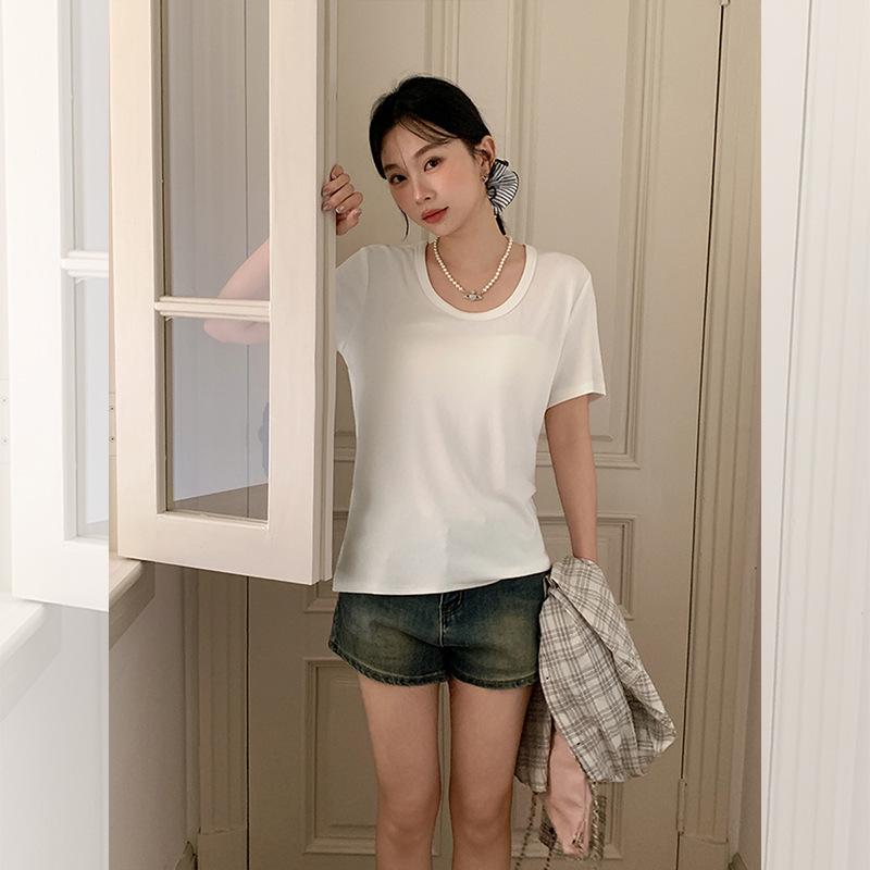Camiseta de manga corta con cuello en U y hombros descubiertos para mujer, selección estricta de moda de verano 2025, nueva camiseta sencilla de color liso, holgada y ajustada que combina con todo.