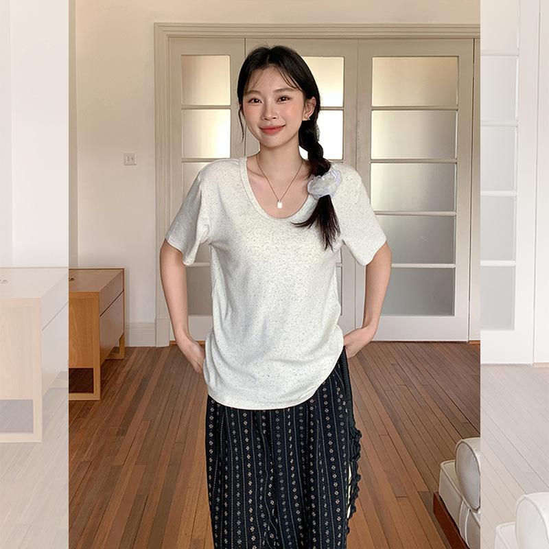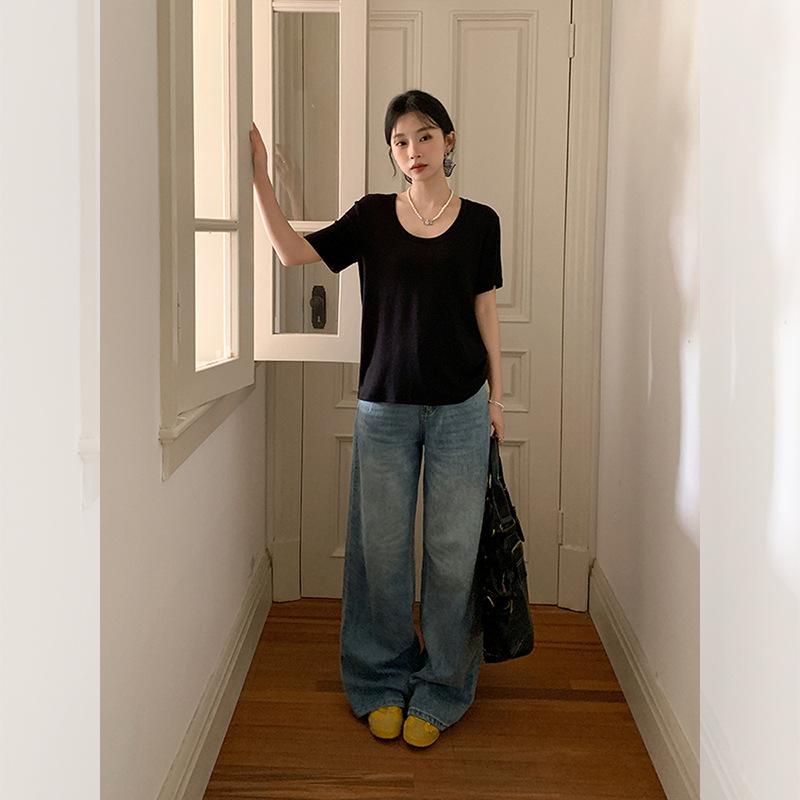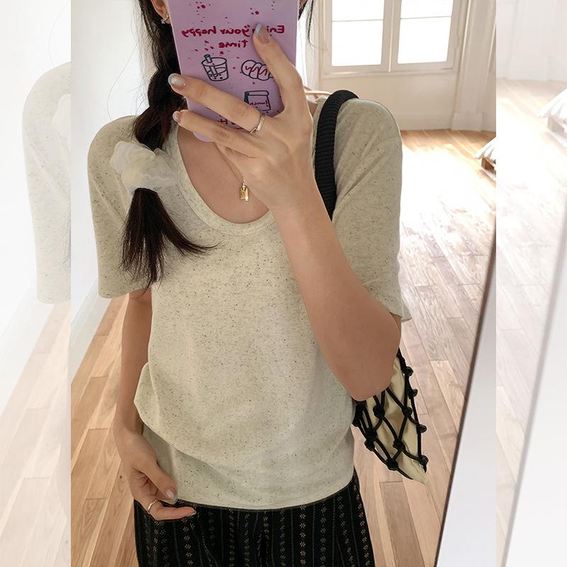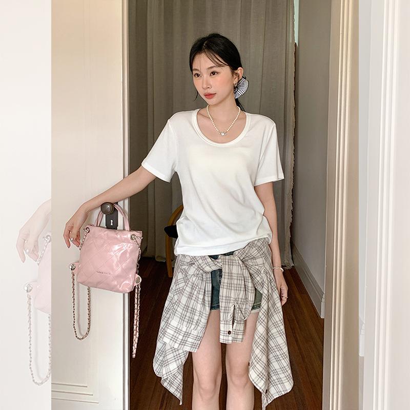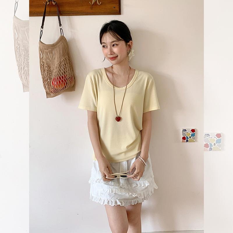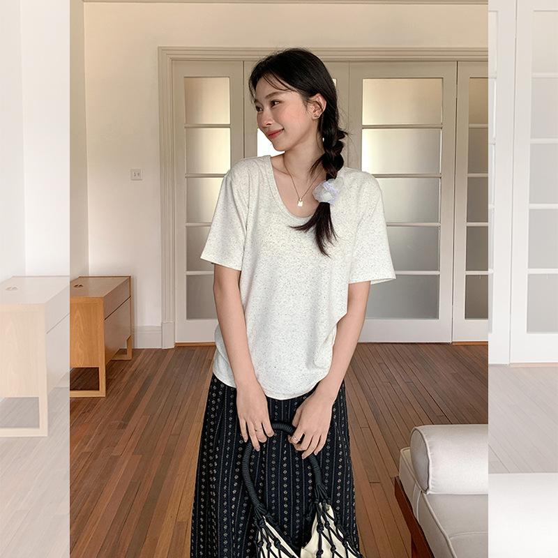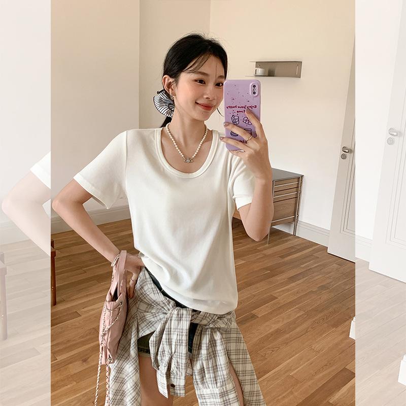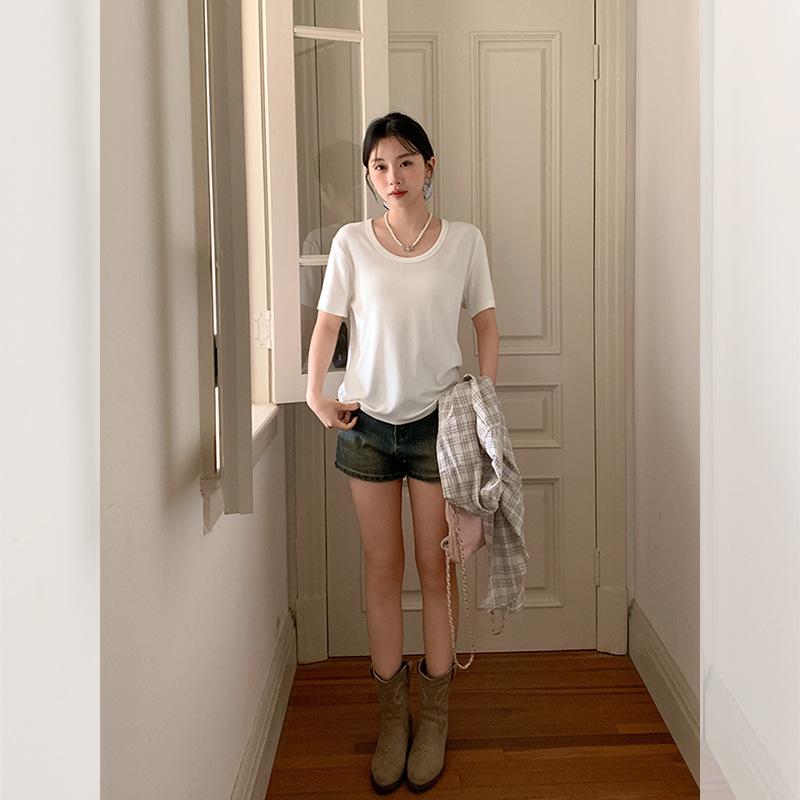 Camiseta de manga corta con cuello en U y hombros descubiertos para mujer, selección estricta de moda de verano 2025, nueva camiseta sencilla de color liso, holgada y ajustada que combina con todo.