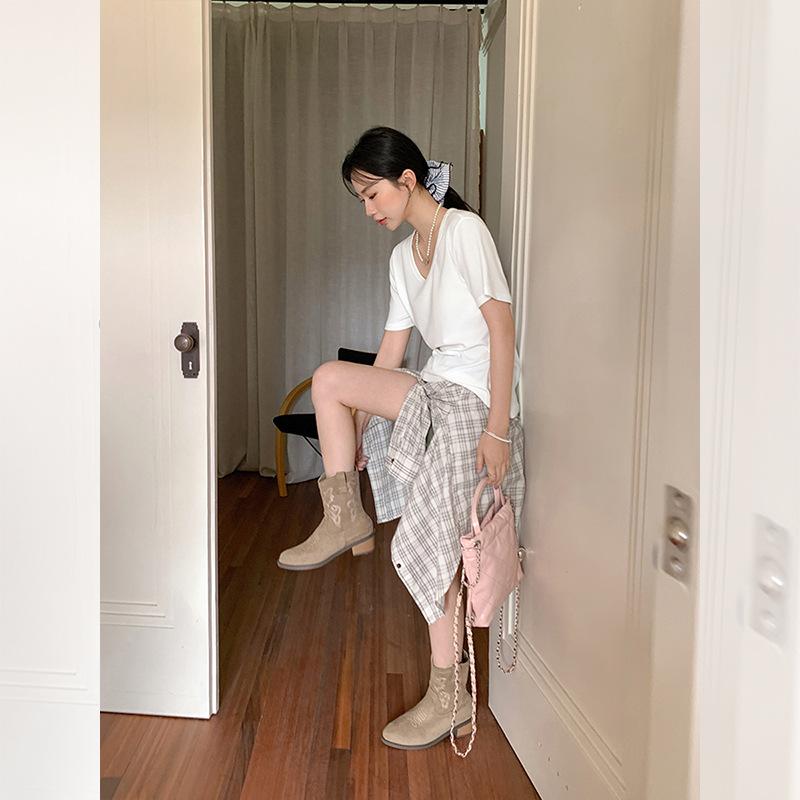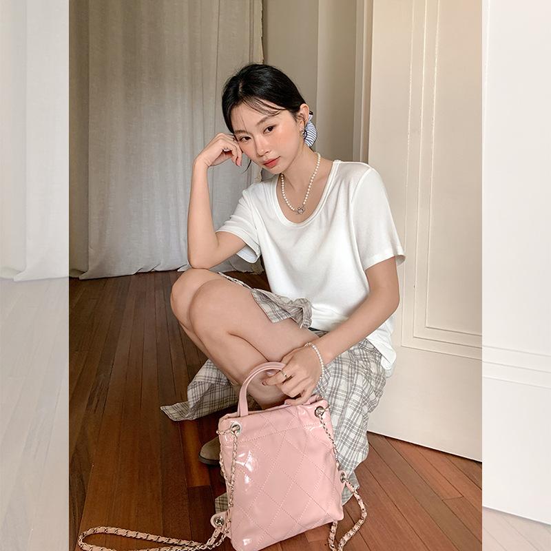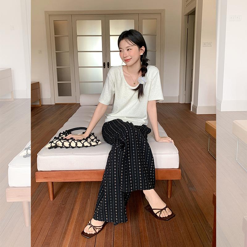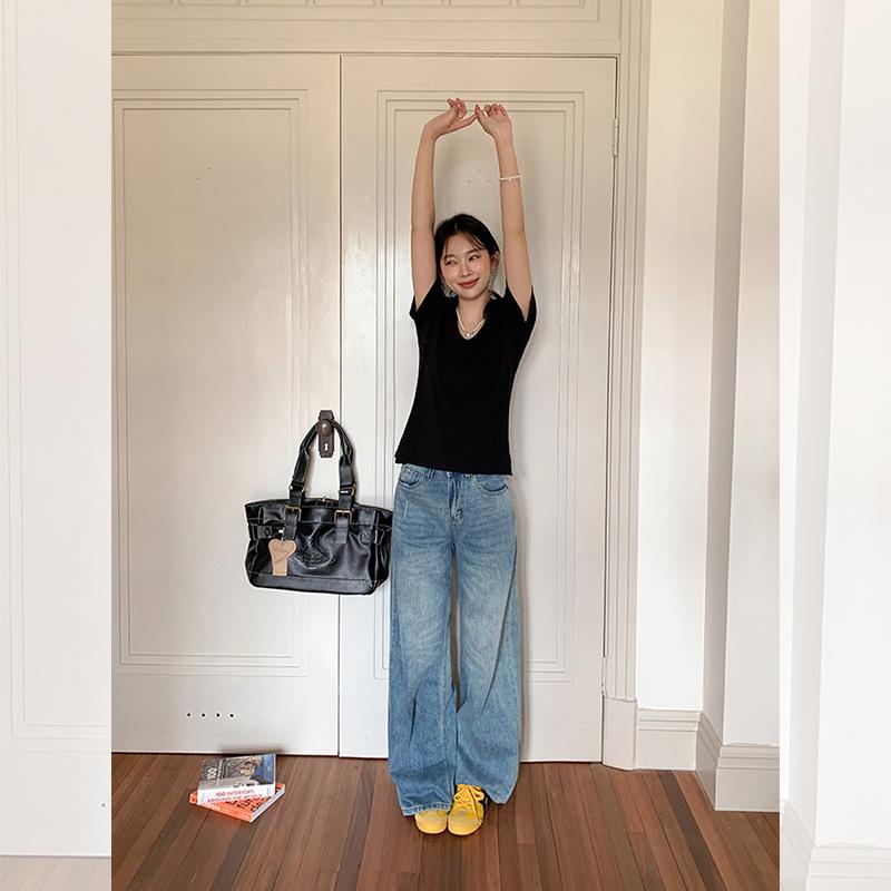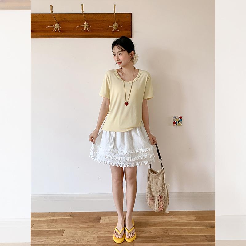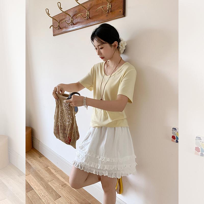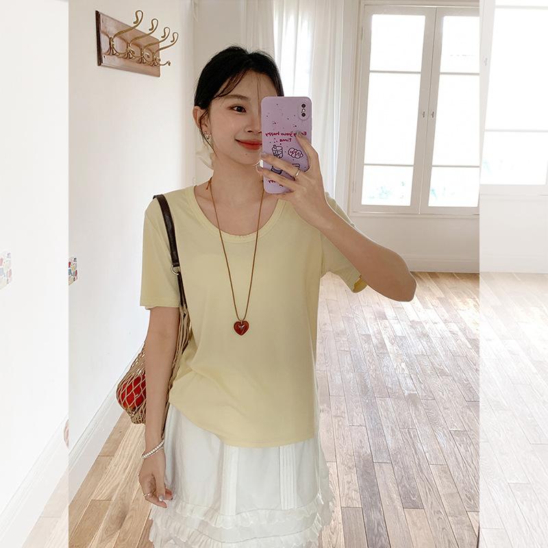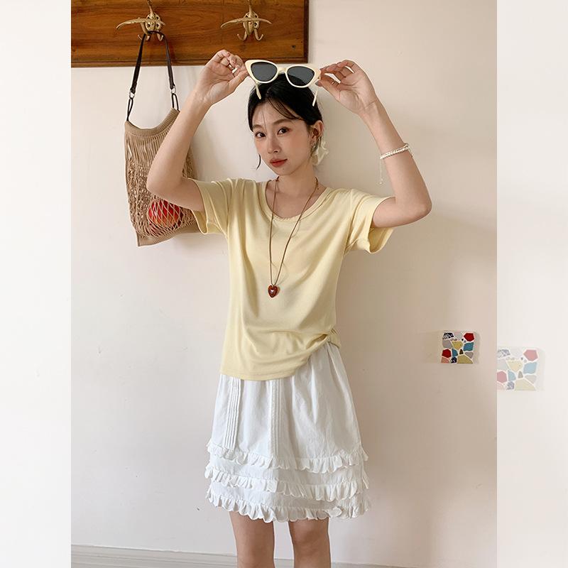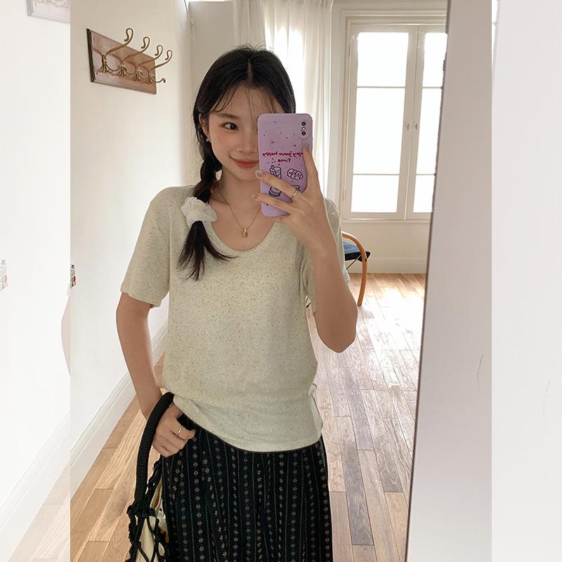 Camiseta de manga corta con cuello en U y hombros descubiertos para mujer, selección estricta de moda de verano 2025, nueva camiseta sencilla de color liso, holgada y ajustada que combina con todo.