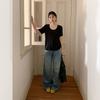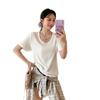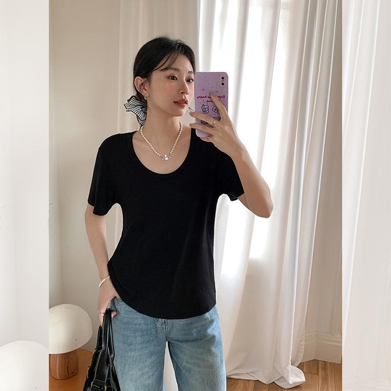 Compra Camiseta de manga corta con cuello en U y hombros descubiertos para mujer, selección estricta de moda de verano 2025, nueva camiseta sencilla de color liso, holgada y ajustada que combina con todo. al por mayor en Joom.pro