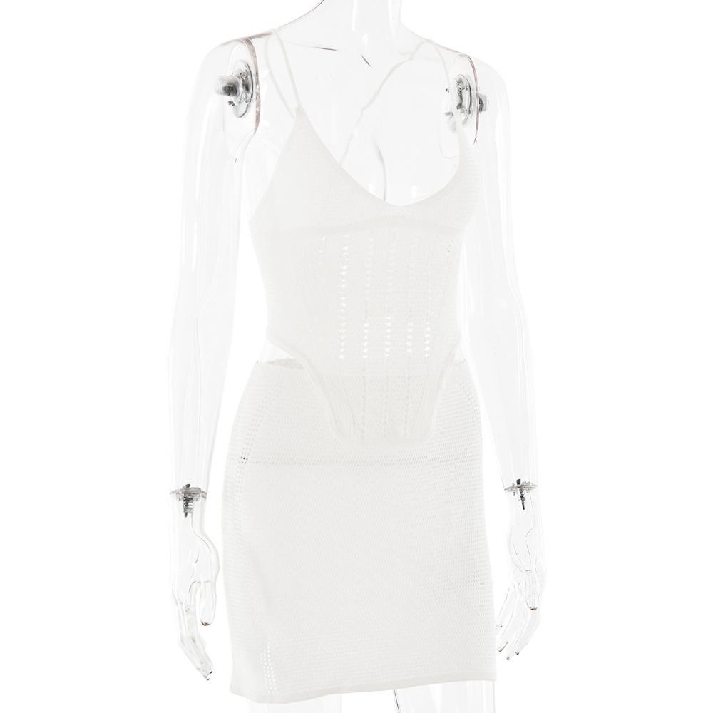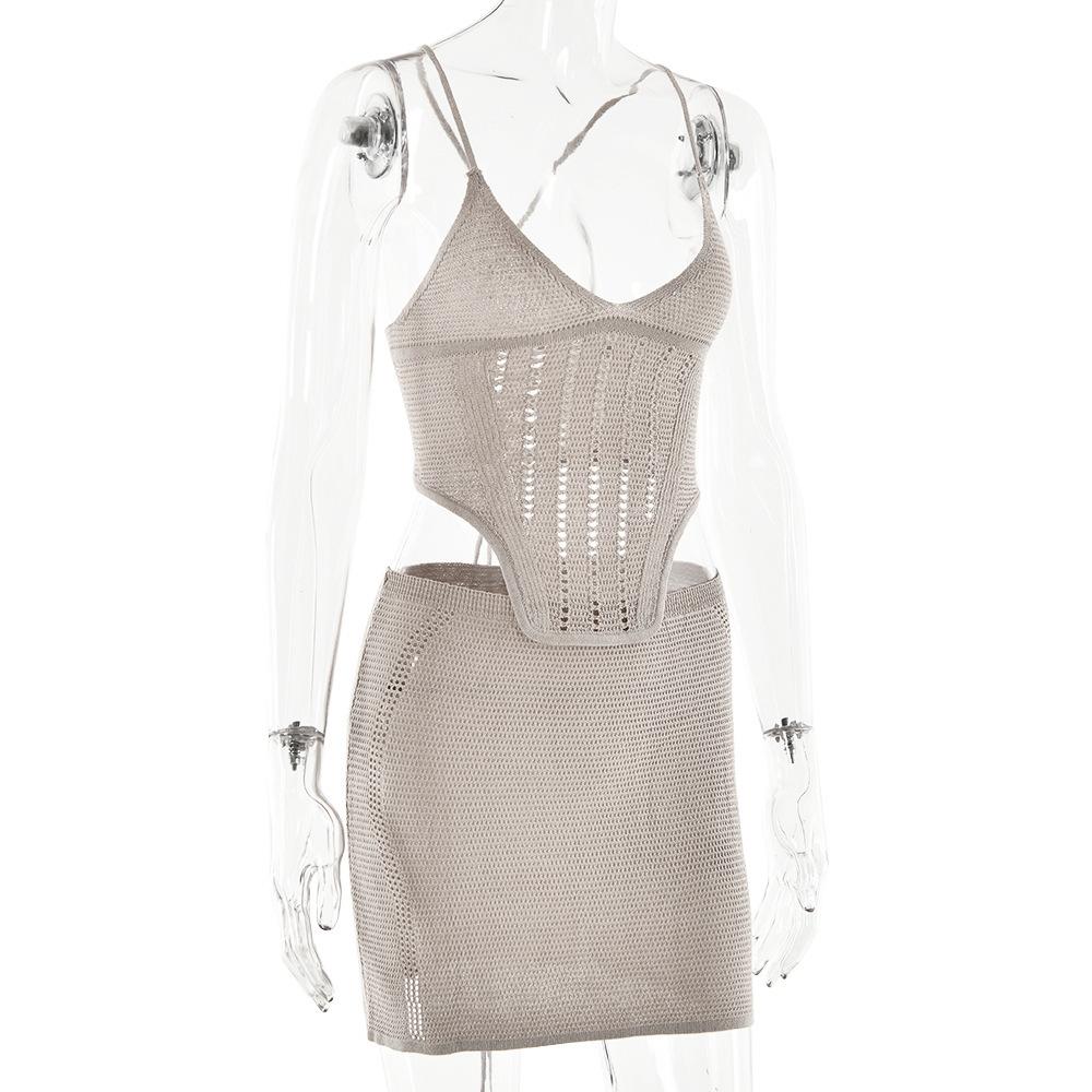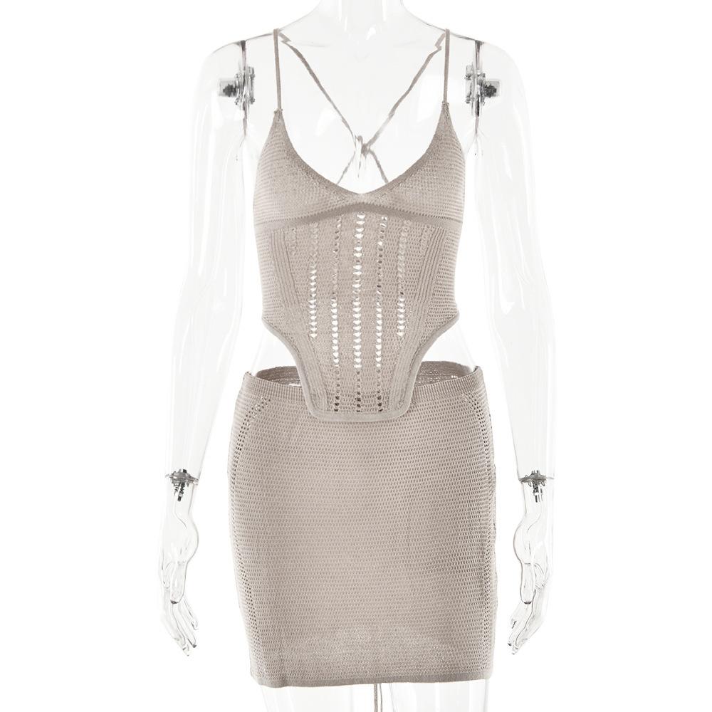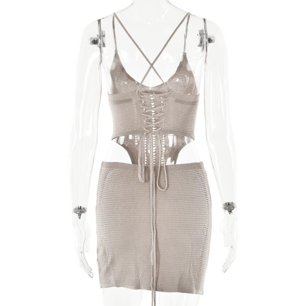 2048 Europeo y Americano Transfronterizo Verano Nuevo Dos Piezas Sexy Moda Tirantes Espalda Descubierta Falda Corta Traje de Punto Exportación