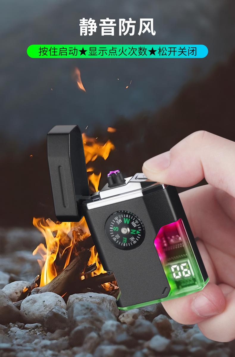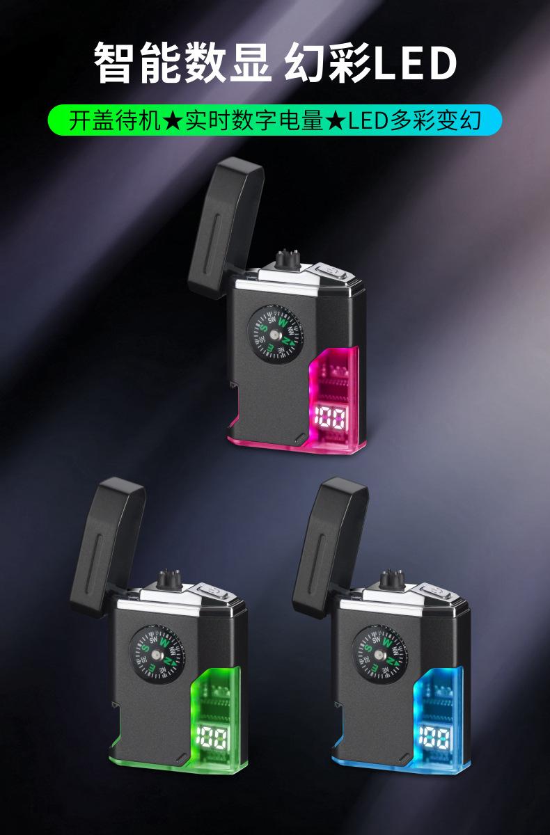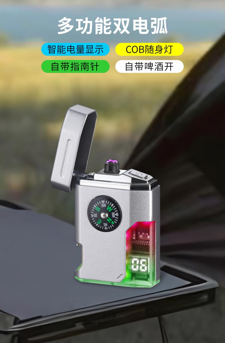 Nuevo encendedor de carga de doble arco, a prueba de viento, con brújula para exteriores, abridor de botellas, luz portátil, pantalla de energía