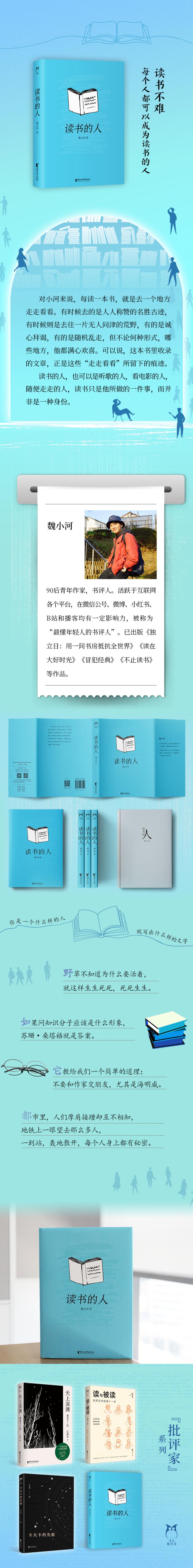 Sobre el autor Wei Xiaohe es un joven escritor nacido en la década de 1990 y crítico de libros. Es activo en varias plataformas de Internet y tiene cierta influencia en las cuentas oficiales de WeChat, Weibo, Xiaohongshu, Bilibili y podcasts. Es conocido como "el crítico de libros que mejor entiende a los jóvenes". Ha publicado obras como "Día de la Independencia: Resistiendo al Mundo con un Estudio", "Leer en los Buenos Tiempos", "Ofendiendo a los Clásicos" y "Más que Leer".