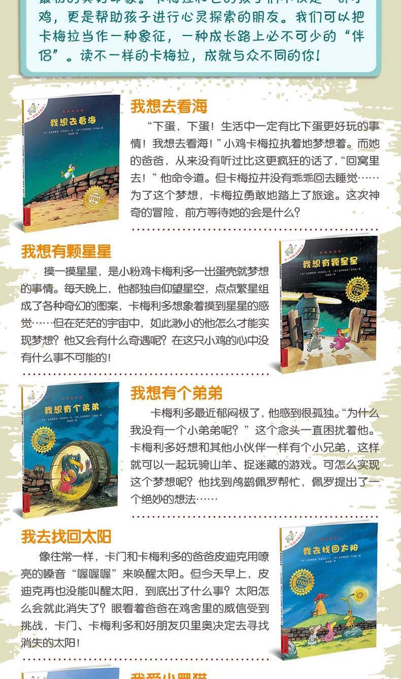 Una chica francesa, Carmela, llegó a China en 2006. Su historia desató un fervor lector entre los niños y alcanzó un récord de ventas de 10.000 ejemplares diarios. Un grupo de chicas únicas, una historia innovadora tras otra. «Carmela, una chica diferente» conmovió la infancia de los niños, los acompañó en su crecimiento e iluminó sus sueños... "Diferente Carmela" sirve de puente para conectar a los niños con el mundo, permitiendo que diferentes culturas dejen una buena primera impresión en sus corazones. Carmela y sus hijos no son solo un grupo de pollitos, sino también amigos que ayudan a los niños a explorar sus corazones. Podemos considerar a Carmela como un símbolo, etc.