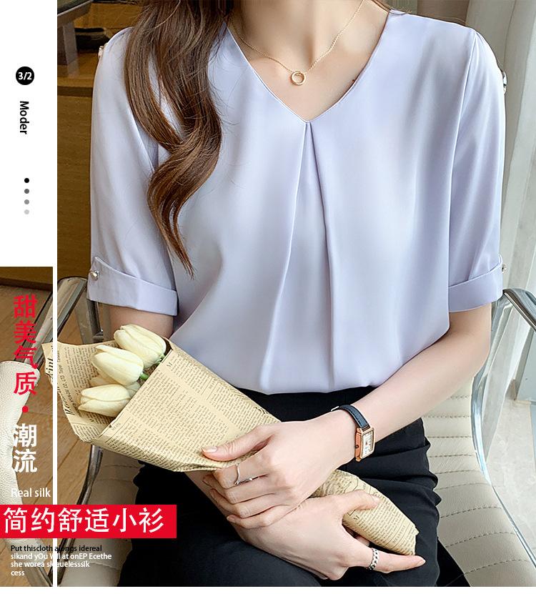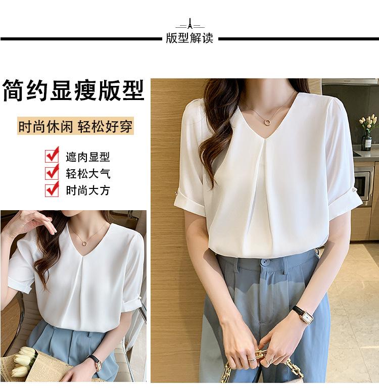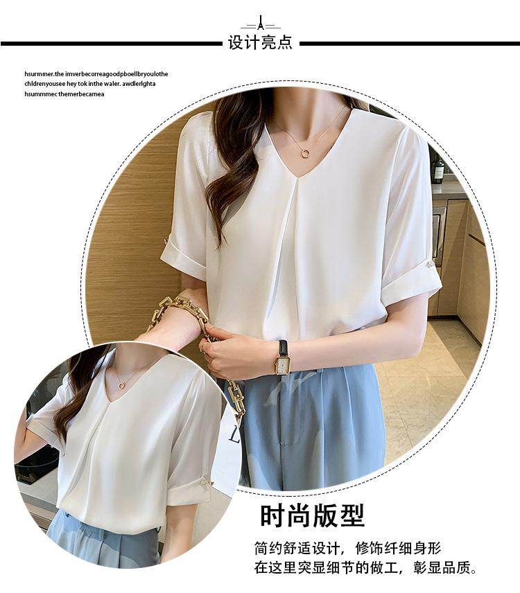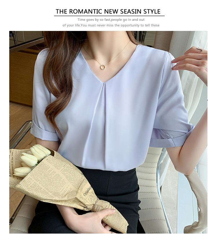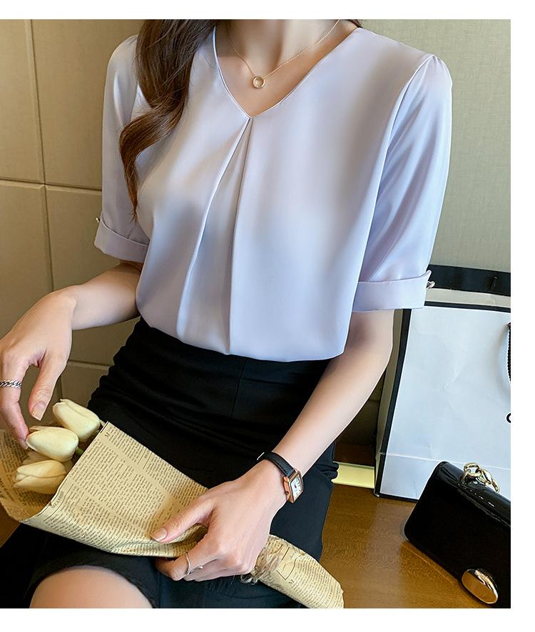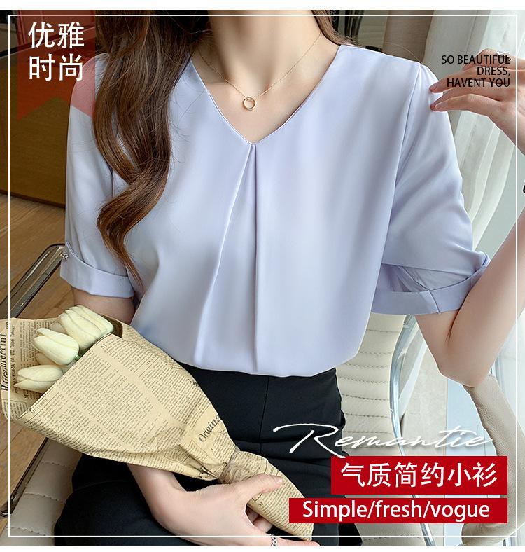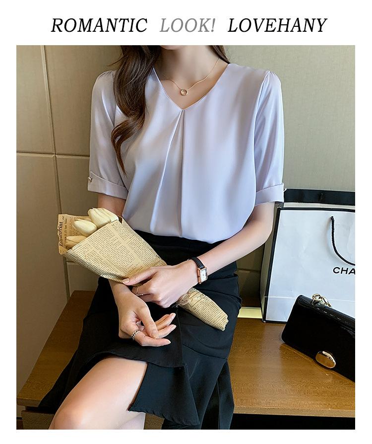 Compra Camisa de gasa con cuello en V francés para mujer, diseño fino de verano, camisa holgada de satén de manga corta, elegante ropa profesional al por mayor en Joom.pro