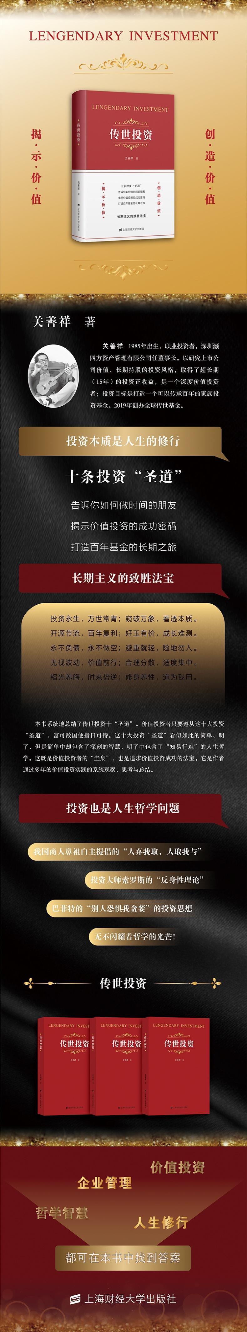 Guan Shanxiang, nacido en 1985, es un inversor profesional y el presidente de Shenzhen Hao Sifang Asset Management Co., Ltd. Con un estilo de inversión que estudia el valor de las empresas cotizadas y mantiene acciones a largo plazo, ha logrado rendimientos de inversión positivos a ultralargo plazo (15 años) y es un inversor de valor profundo; su objetivo de inversión es construir un fondo de inversión familiar que pueda ser transmitido por cien años. Fundó el Fondo Global Heritage en 2019. Fundó el Fondo Global Heritage en 2019. En 1997 (a la edad de 12 años), iba a menudo a la sala de operaciones con su padre, que era operador de bolsa. Desde entonces, le fascinó la inversión de interés compuesto en acciones y ha hecho de la inversión en valor en acciones su carrera de por vida. Alcanzó la libertad financiera a los 28 años a través de la inversión en acciones e inició oficialmente la inversión a tiempo completo. La inversión es solo un juego. Si se comprende la naturaleza humana y se dominan las reglas, se puede generar riqueza, transmitir los logros y alcanzar los sueños a lo largo de cien años.