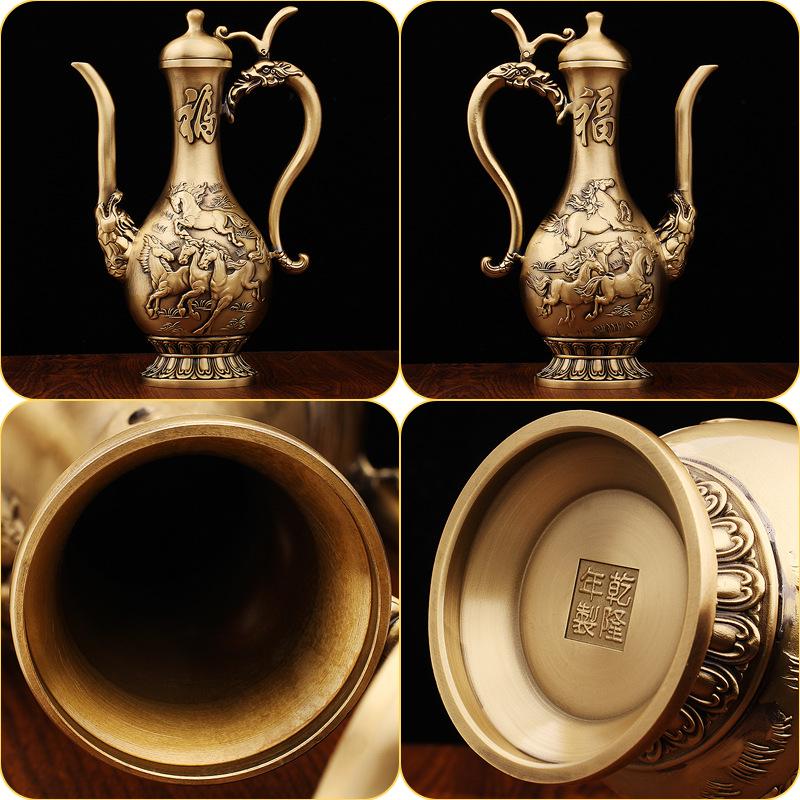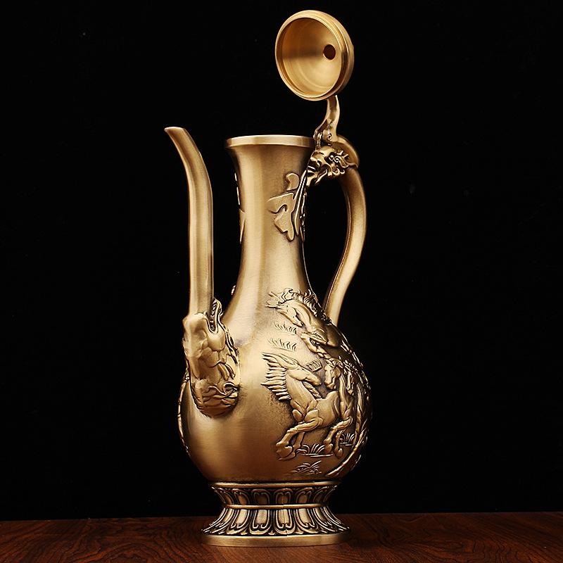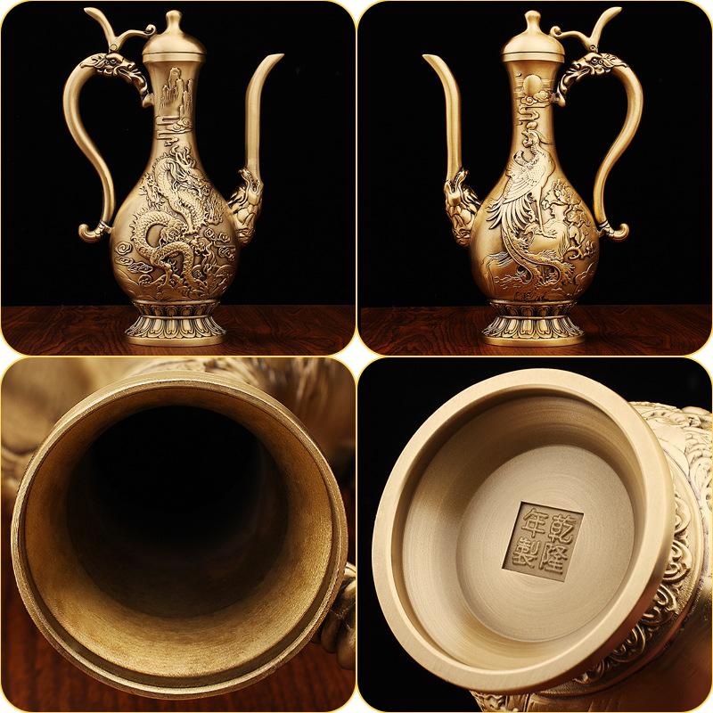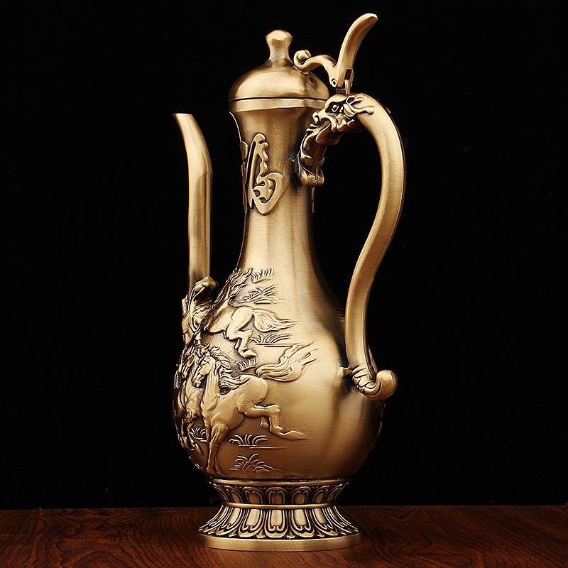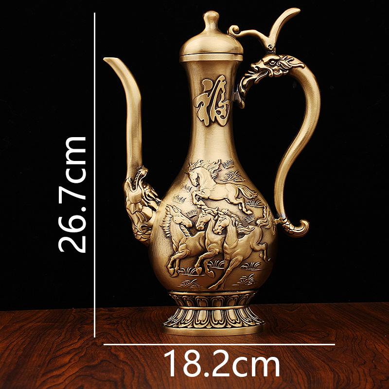 Latón de alta gama estilo europeo Dragón y Fénix Ocho corceles Jarra de cadera Vintage Creativo Artículos para vino para el hogar Adornos de cobre puro Artesanías de metal