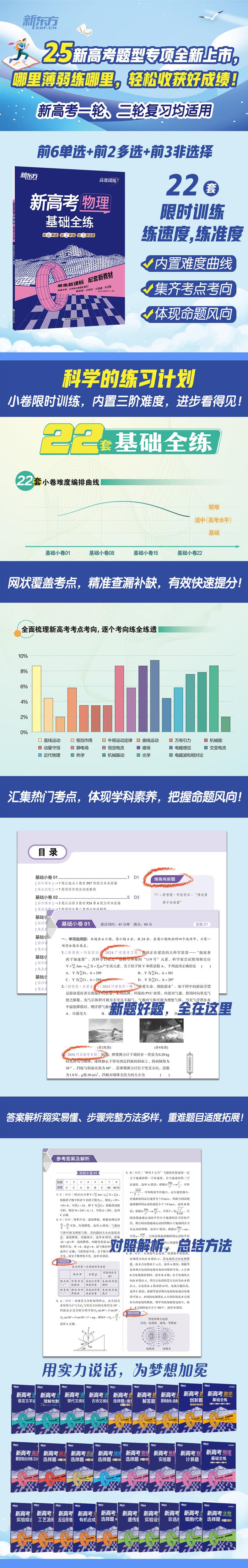 "Física para el Nuevo Examen de Admisión a la Universidad. Práctica Básica Completa" es un producto especial de práctica intensiva, cuidadosamente creado por el Centro de Enseñanza e Investigación New Oriental, para la preparación y el repaso del examen de admisión a la universidad. Esta serie de libros se centra en los nuevos estándares curriculares y en los nuevos libros de texto de apoyo. De acuerdo con la tendencia en la formulación de preguntas del nuevo examen de admisión a la universidad y los conceptos e ideas reflejados en las preguntas del examen de años anteriores, se seleccionan rigurosamente preguntas de alta calidad, como preguntas clásicas del examen de admisión a la universidad de los últimos cinco años, preguntas de simulación de las 100 mejores escuelas del año pasado, preguntas de exámenes conjuntos de las principales ciudades y preguntas básicas sólidas. El contenido de las preguntas se centra en fortalecer el examen de habilidades clave y la comprensión de la materia, presta atención a la selección de preguntas para nuevas situaciones y garantiza que la aplicabilidad, innovación, apertura y flexibilidad de las preguntas cumplan con los requisitos del nuevo examen de admisión a la universidad, guiando a los candidatos para reducir la memorización y la resolución mecánica de preguntas, y para mejorar su capacidad de aplicar lo aprendido. Siga las reglas de revisión de los candidatos y realice una capacitación básica en forma de pequeños volúmenes para el examen de admisión a la universidad de física: "primeras 6 preguntas de opción única, primeras 2 de opción múltiple, primeras 3 sin opción". Esfuércese por presentar las nuevas tendencias en la formulación de preguntas del examen de admisión a la universidad y aborde exhaustivamente los métodos de prueba y las direcciones de los tipos de preguntas de física. El análisis presenta un proceso detallado de resolución de problemas, sin omitir pasos, ideas completas y puede ayudar a los candidatos a extraer conclusiones de un ejemplo. Los estudiantes pueden mejorar sus calificaciones en preguntas básicas de física mediante una capacitación eficiente y específica para cada pregunta y soluciones refinadas.