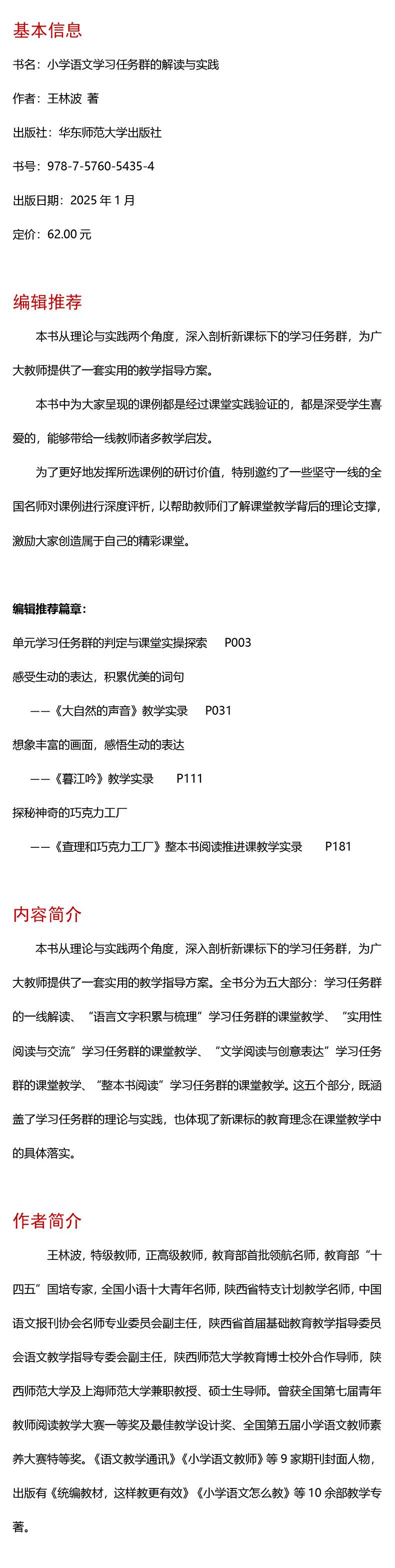 Este libro analiza profundamente los grupos de tareas de aprendizaje bajo los nuevos estándares curriculares desde las perspectivas teórica y práctica, y proporciona un conjunto de programas prácticos de orientación didáctica para profesores. El libro está dividido en cinco partes: interpretación de primera línea de los grupos de tareas de aprendizaje, enseñanza en el aula del grupo de tareas de aprendizaje de "acumulación y clasificación de lenguaje y texto", enseñanza en el aula del grupo de tareas de aprendizaje de "lectura práctica y comunicación", enseñanza en el aula del grupo de tareas de aprendizaje de "lectura literaria y expresión creativa", y enseñanza en el aula del grupo de tareas de aprendizaje de "lectura de libros completos". Estas cinco partes no solo cubren la teoría y la práctica de los grupos de tareas de aprendizaje, sino que también reflejan la implementación específica de los conceptos educativos de los nuevos estándares curriculares en la enseñanza en el aula.