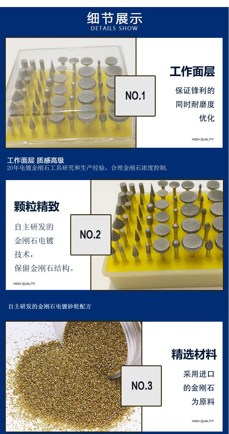 Las puntas de diamante están hechas de electrodeposición de diamante de alta calidad y se utilizan principalmente para rectificado; procesamiento y reparación de moldes; tallado de piedra, grabado, trazado de líneas, rectificado, ahuecado; tallado de jade; tallado de vidrio; limpieza de rebabas y soldaduras de fundiciones, forjados y soldaduras; rectificado dental; biselado y procesamiento de ranuras de varias piezas mecánicas, limpieza de tuberías, acabado de la superficie interior de piezas mecánicas; grabado y rectificado en clínicas dentales, etc.