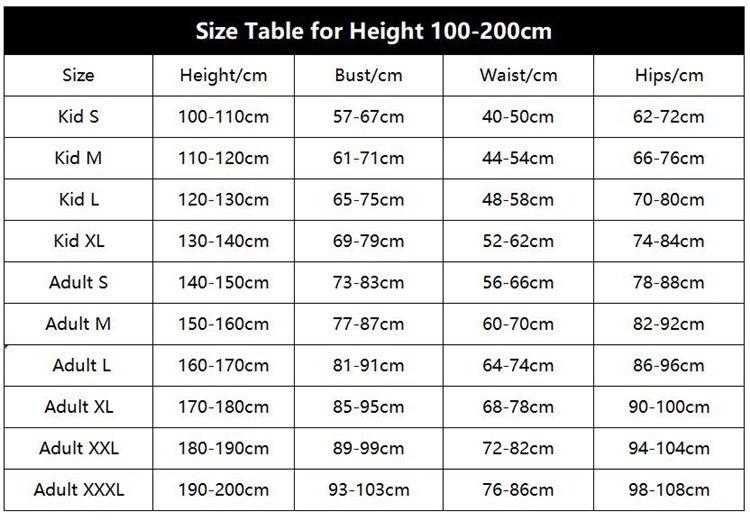 Child S(100-110), Child M(110-120), Child L(120-130), Children XL(130-140), Adult S(140-150), Adult M(150-160)...