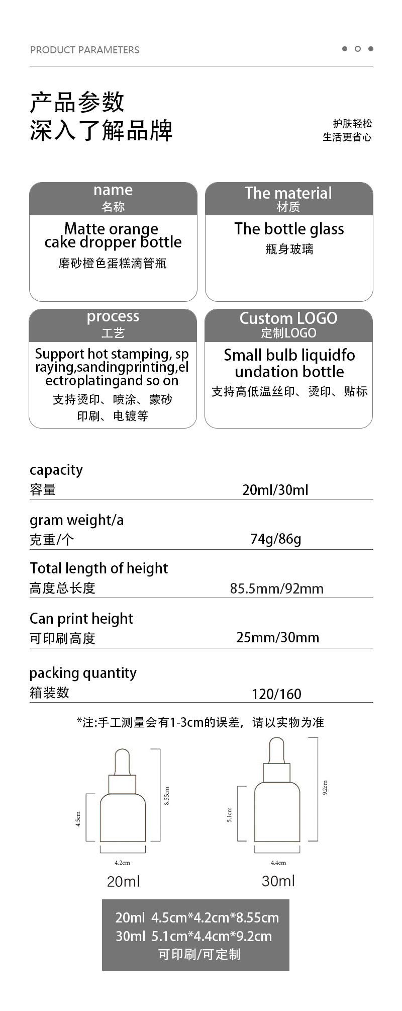 20ml frosted orange cake bottle with matte gold ring frosted white plastic tip, 30ml frosted orange cake bottl...