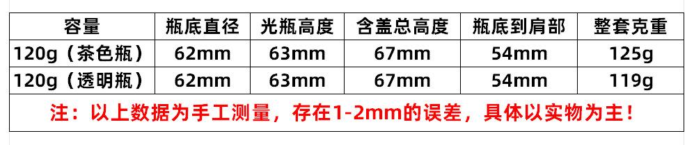 120g; brown bottle + hand-drawn pad + black lid; glass, 120g; transparent bottle + hand-drawn pad + black lid; glass