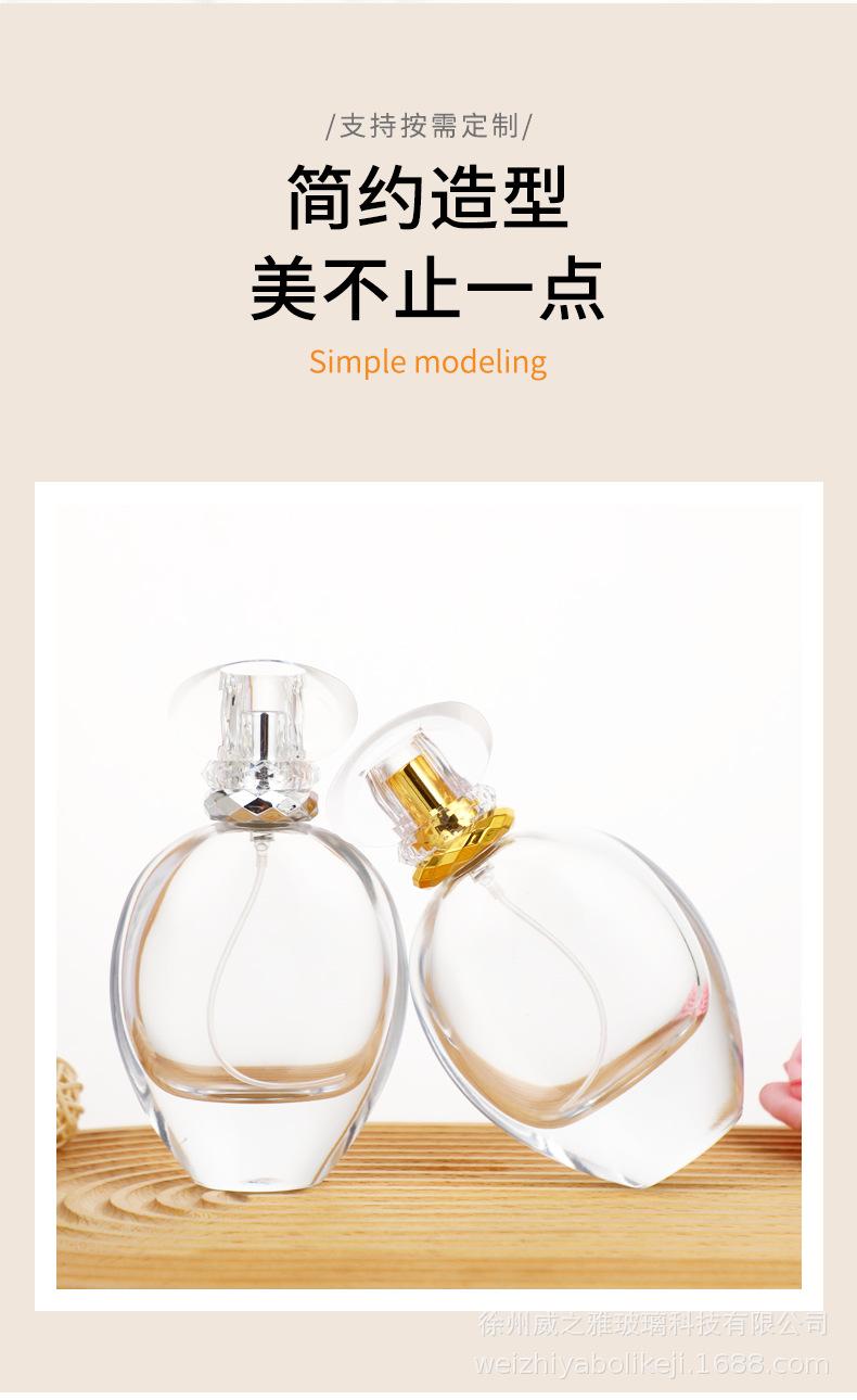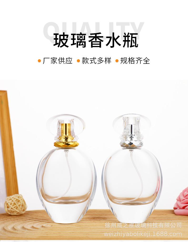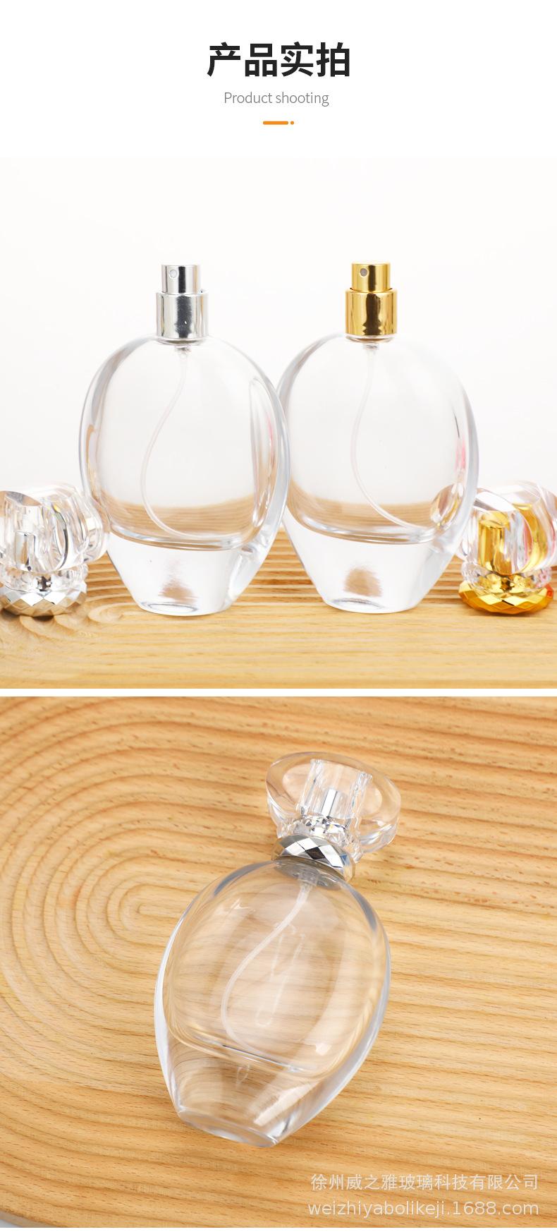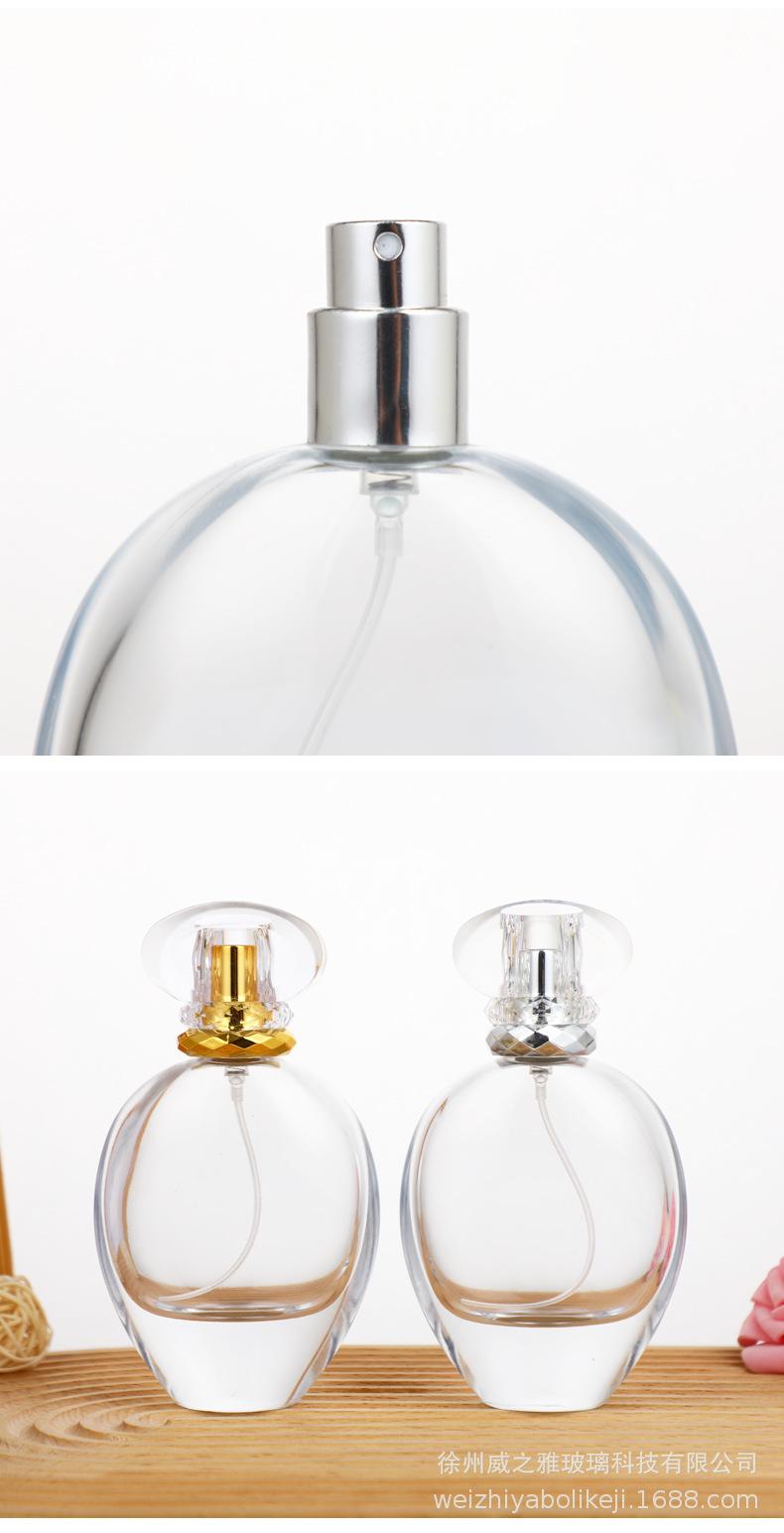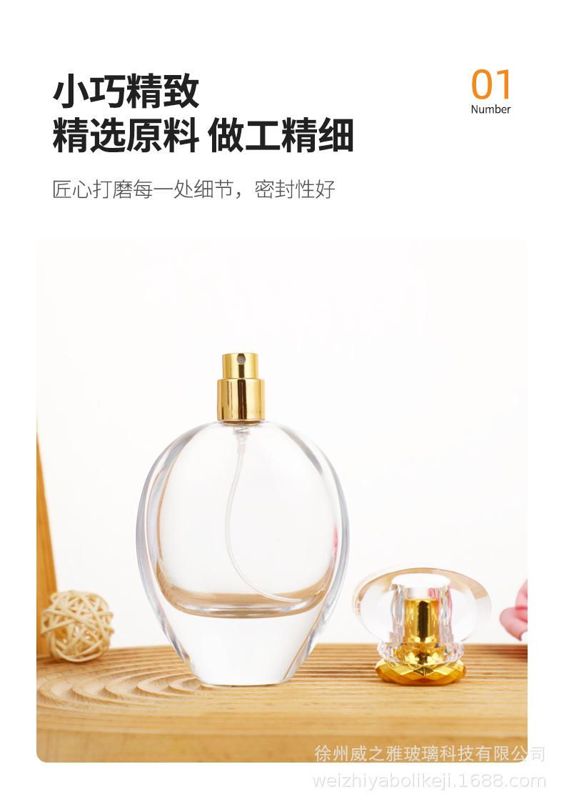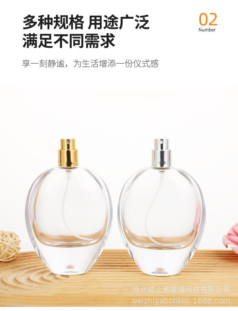 Botella de perfume redonda y plana de 75 ml, con forma de bayoneta de alta calidad, portátil, con atomizador cosmético, disponible al por mayor.