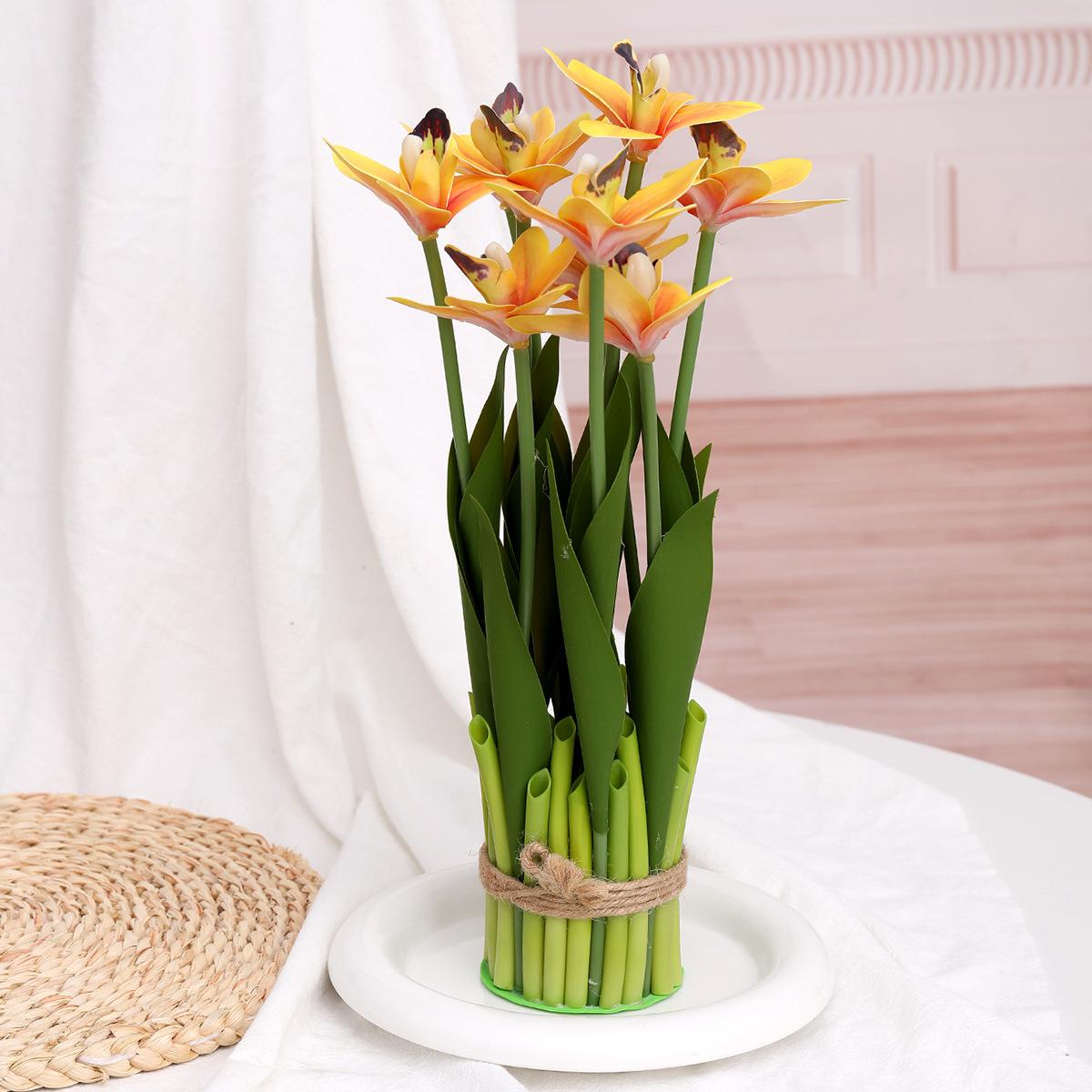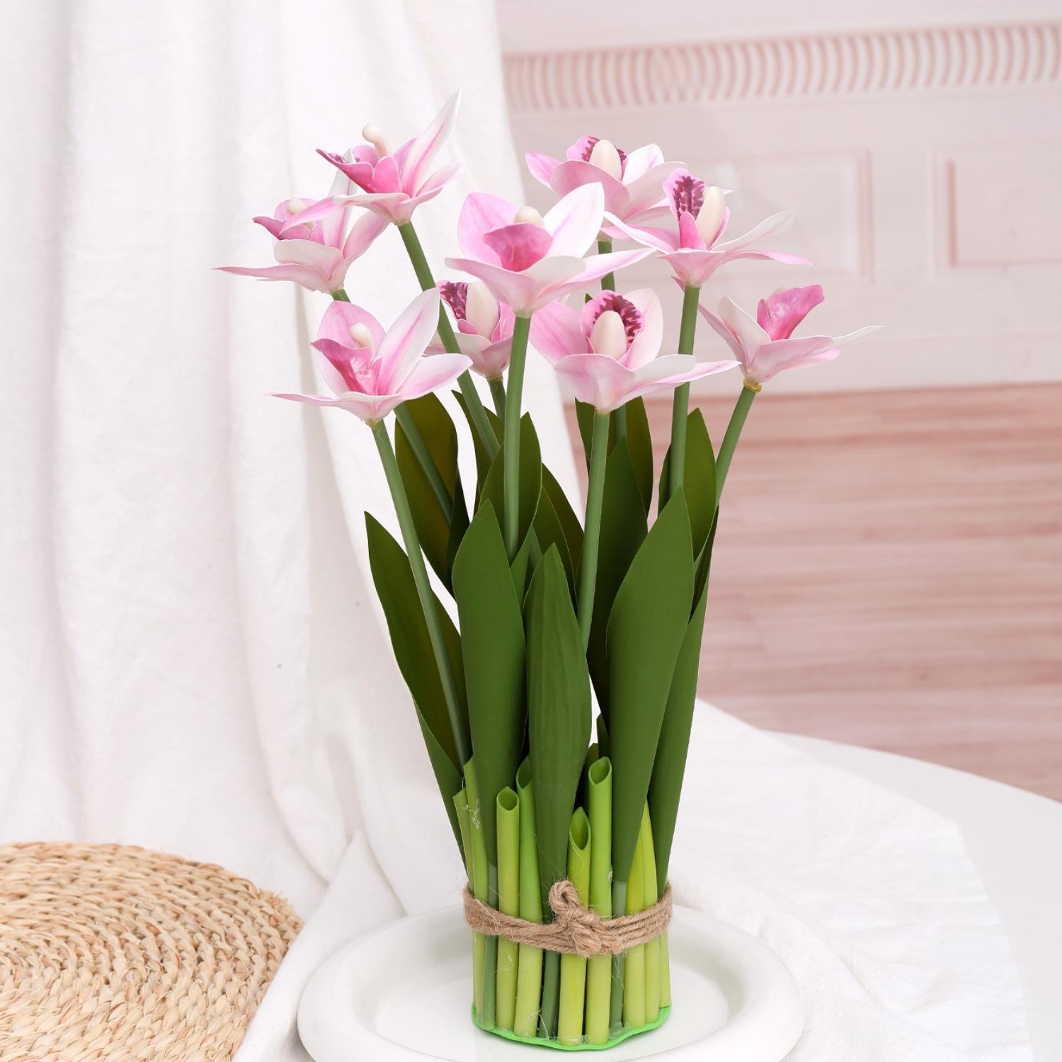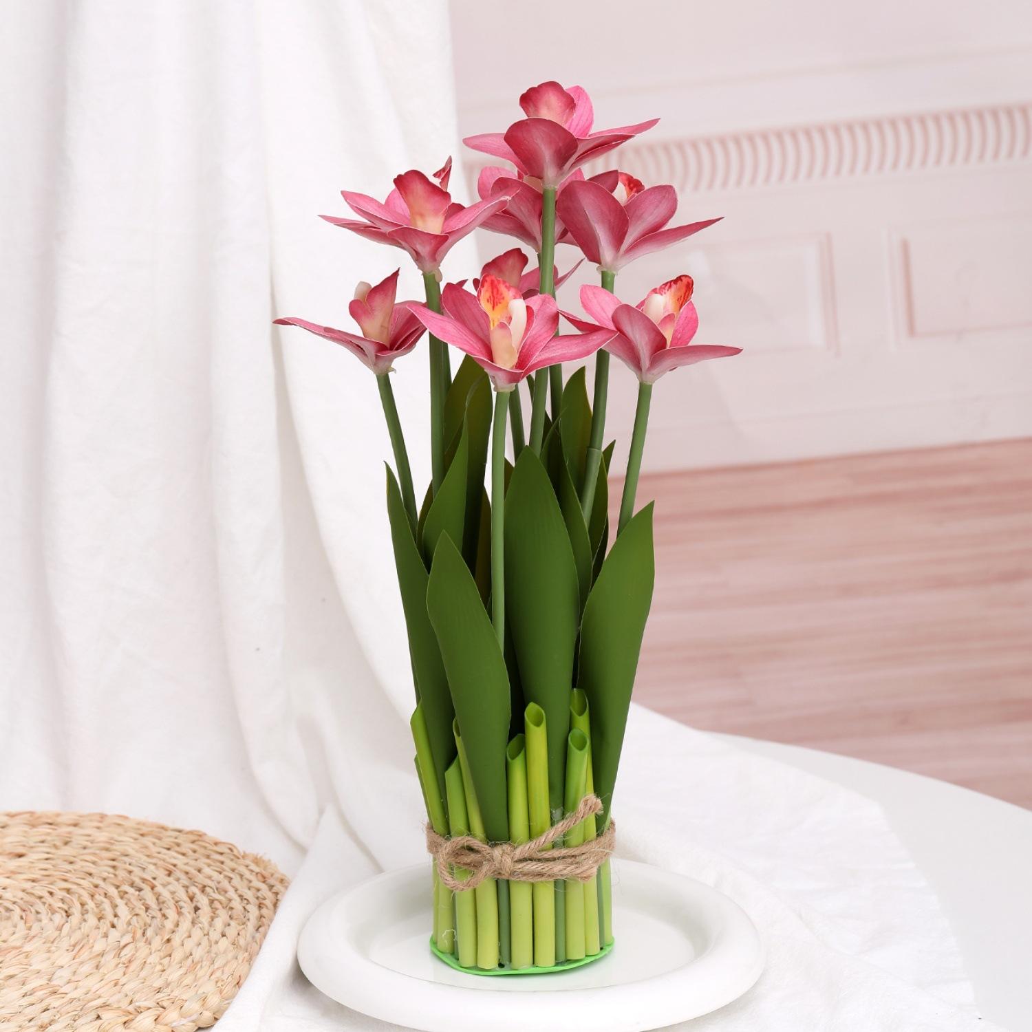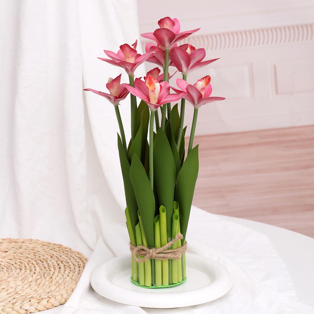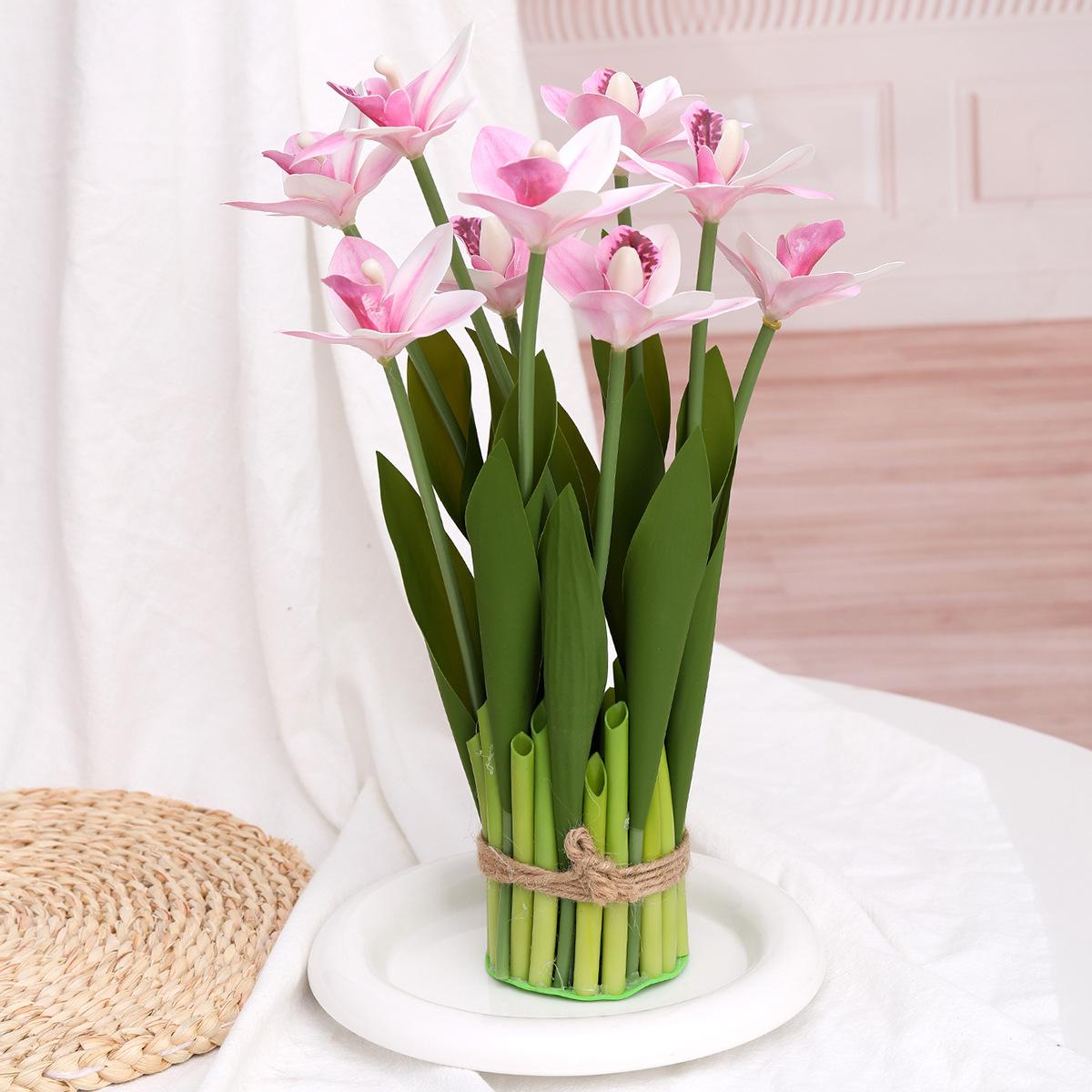 Flores artificiales con hojas de cymbidium, película 3D, orquídea, exhibición de sala de estar, arreglo floral, decoración del hogar, flores falsas