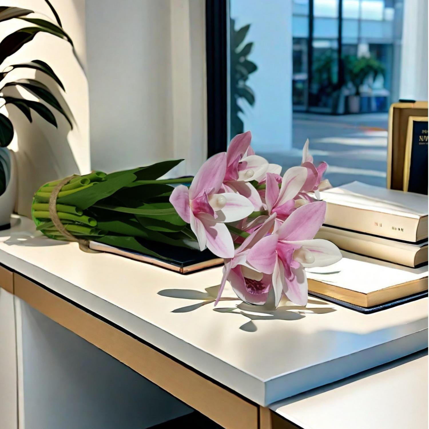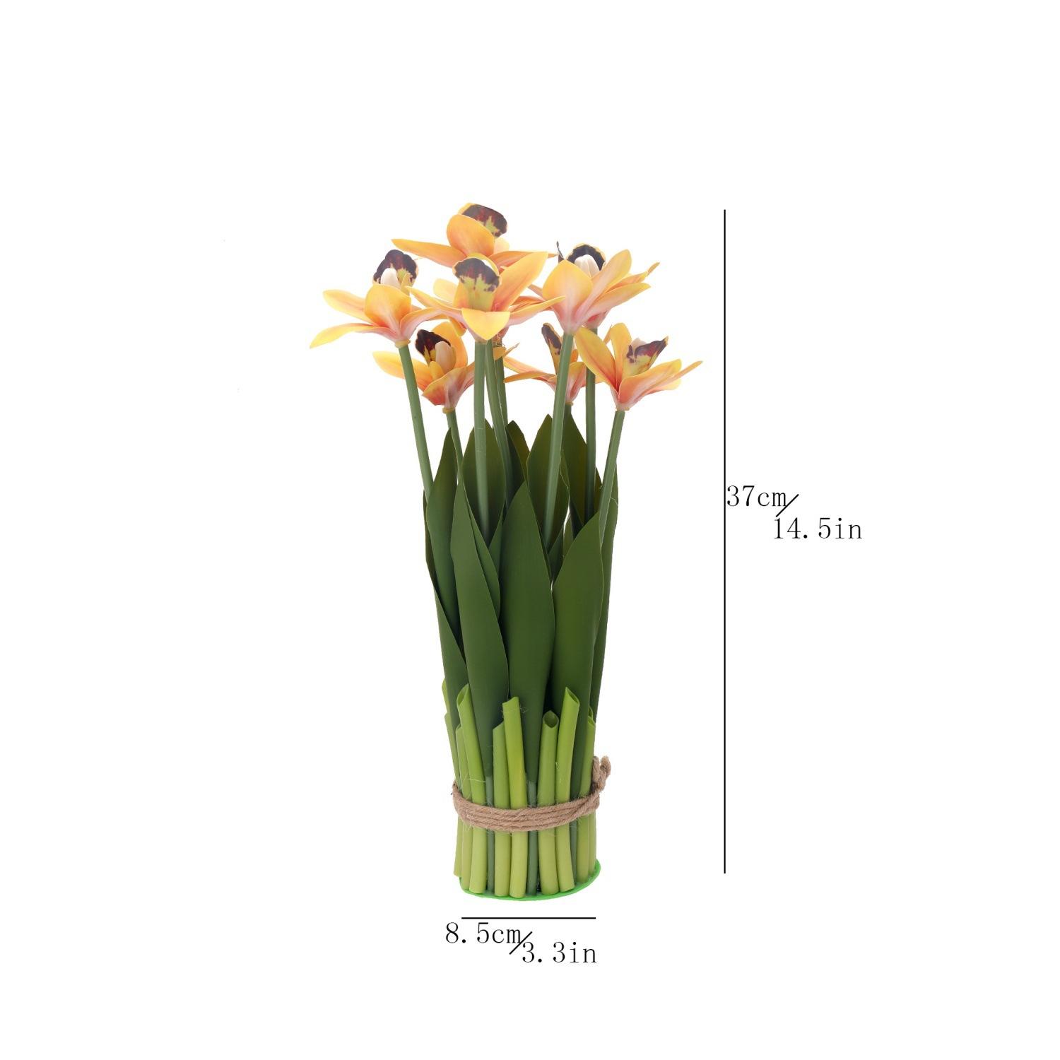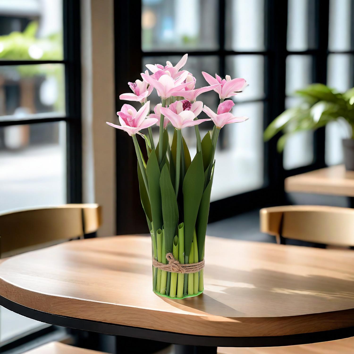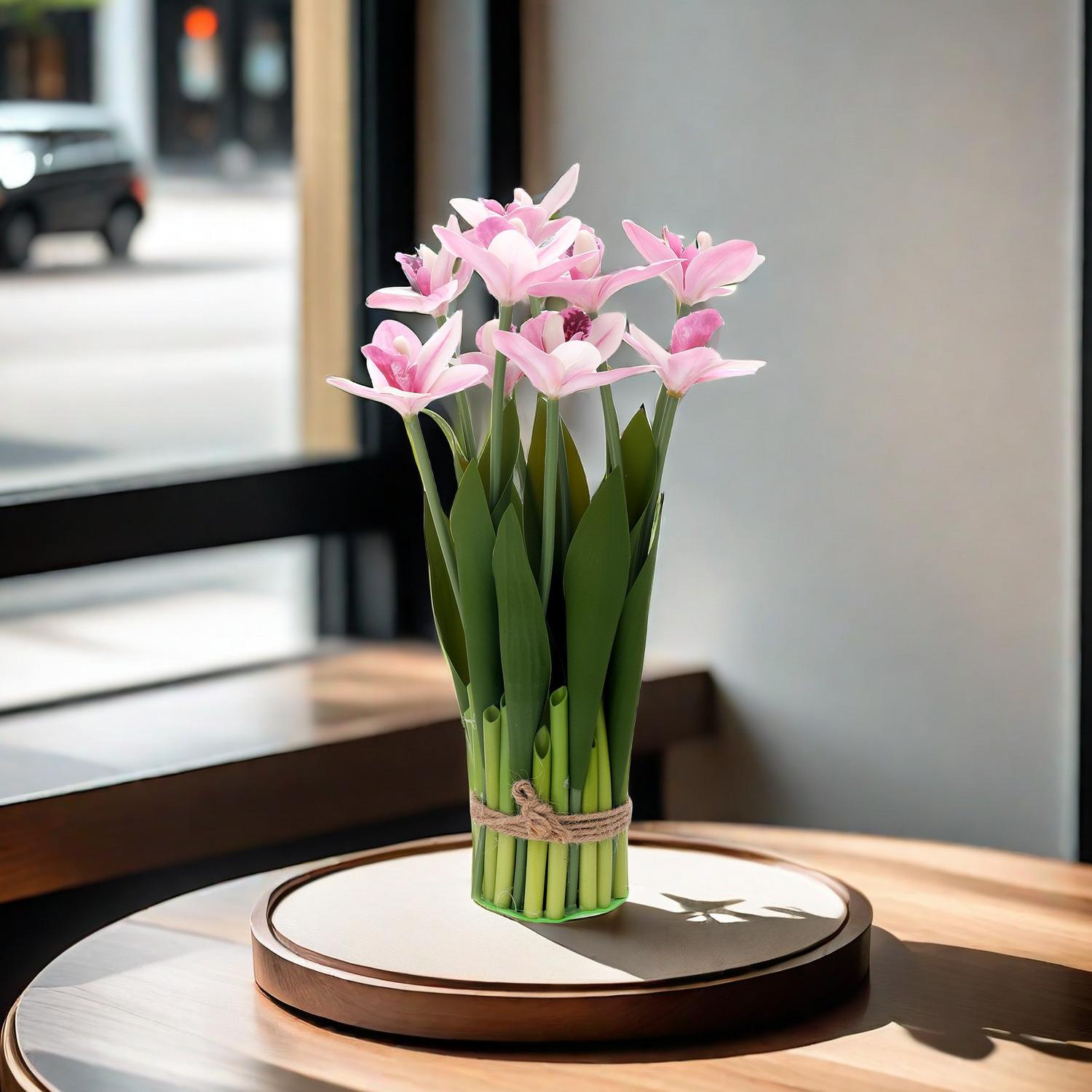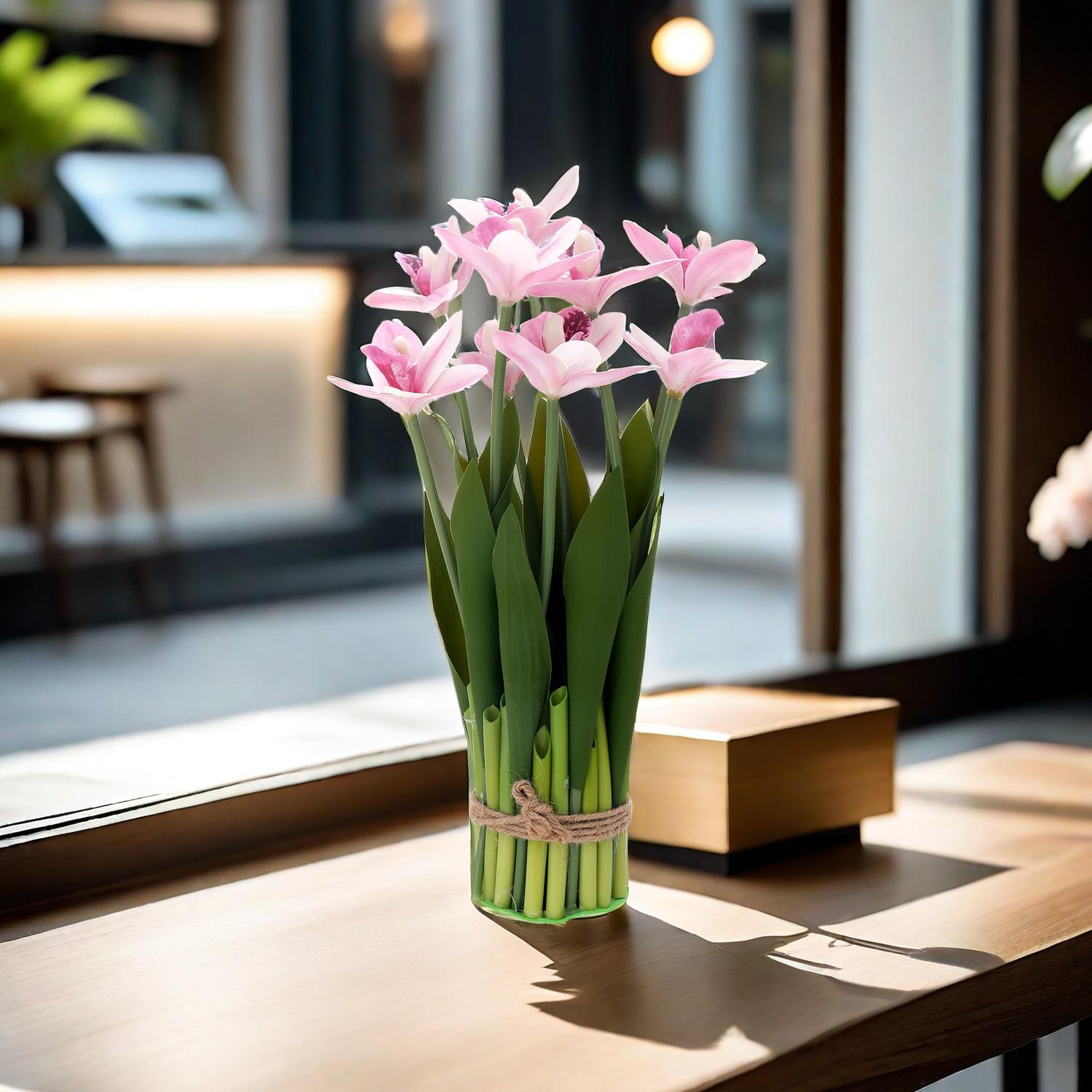 Flores artificiales con hojas de cymbidium, película 3D, orquídea, exhibición de sala de estar, arreglo floral, decoración del hogar, flores falsas