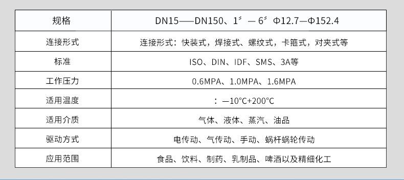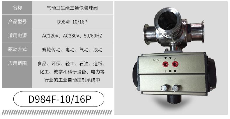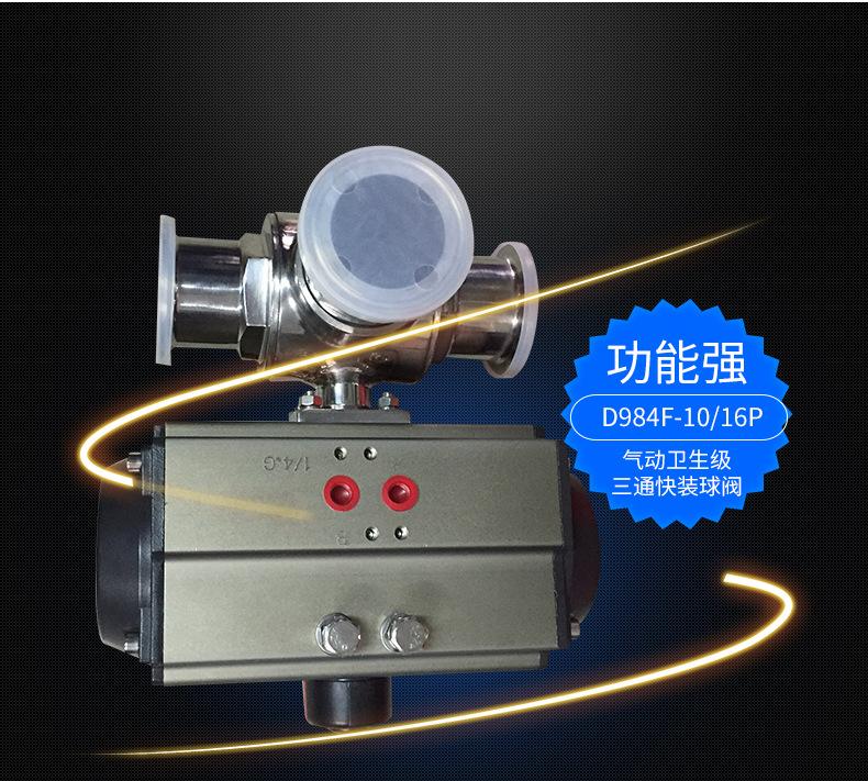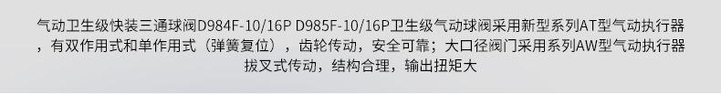 neumáticosaludVálvula de bola de tres vías de instalación rápidaD984F-10/16P D985F-10/16PVálvula de Bola Neumática SanitariaAdoptar nueva serieENTipo actuador neumático, doble efecto y simple efecto (retorno por resorte), transmisión por engranajes, seguro y confiable; las válvulas de gran diámetro adoptan serieAWEl actuador neumático adopta transmisión tipo horquilla, estructura razonable y gran par de salida.
