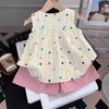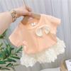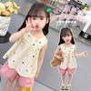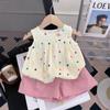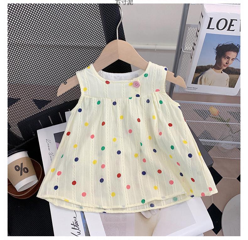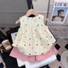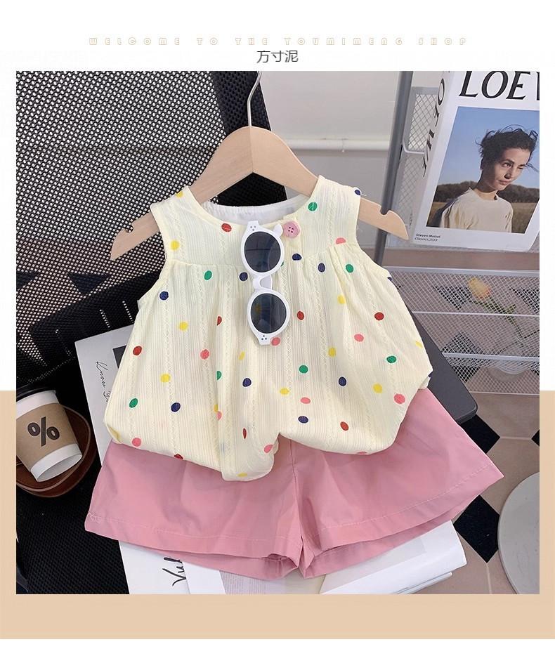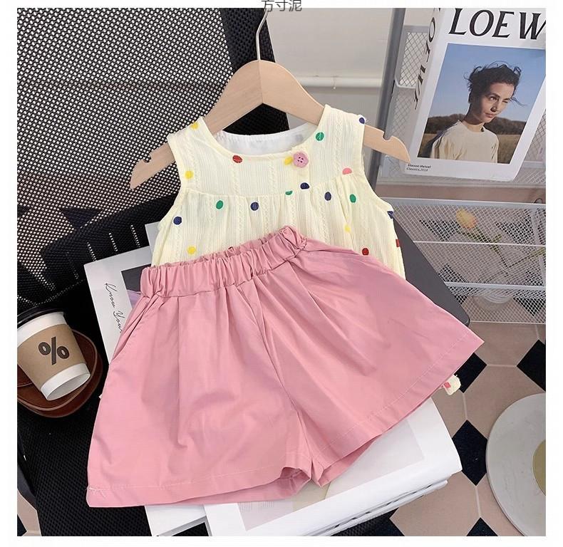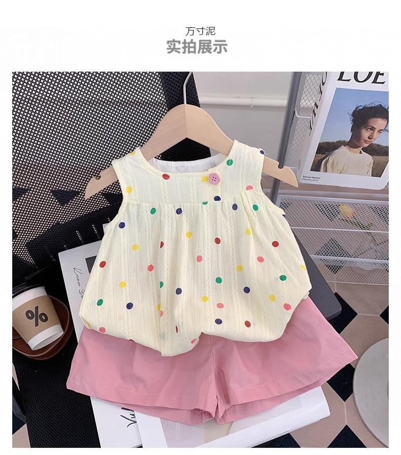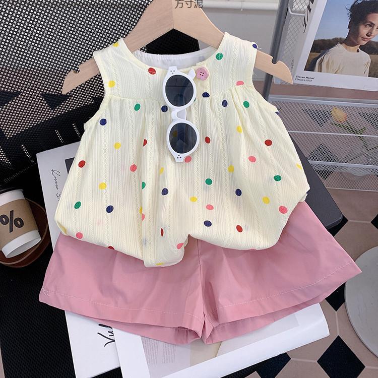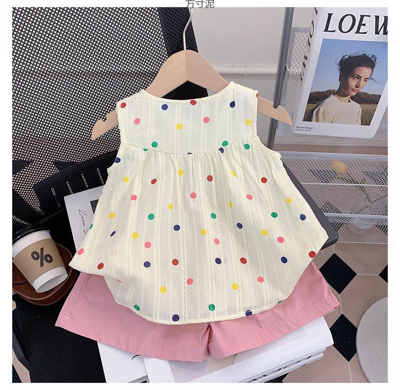 Ropa para niños al por mayor, traje de niñas de verano 25, nuevo conjunto de dos piezas con chaleco de lunares coreanos y pantalones rosas
