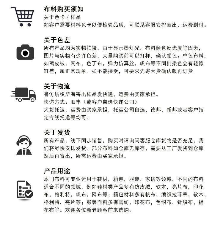 La empresa textil Guangzhou Huadu District Shiling Weiyu distribuye y vende al por mayor tejidos de PP, algodón y lino, tejidos teñidos con hilo, tejidos con purpurina, estampados, con cuentas y otros tejidos, algodón y lino, tejidos teñidos con hilo, tejidos con purpurina, estampados, con cuentas y otros tejidos, y goza de una alta posición entre los consumidores. La empresa ha establecido relaciones de cooperación estables y a largo plazo con muchos minoristas y agentes. La empresa textil Guangzhou Huadu District Shiling Weiyu es sólida, concede importancia al crédito, cumple los contratos, garantiza la calidad del producto y se ha ganado la confianza de los clientes con sus características empresariales multivariedad y el principio de pequeños beneficios pero rápida rotación.