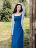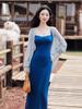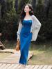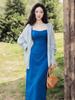 Vestido azul de tirantes de alta gama Verano 2025 Nuevo estilo Vestido largo pequeño con traje cárdigan de protección solar