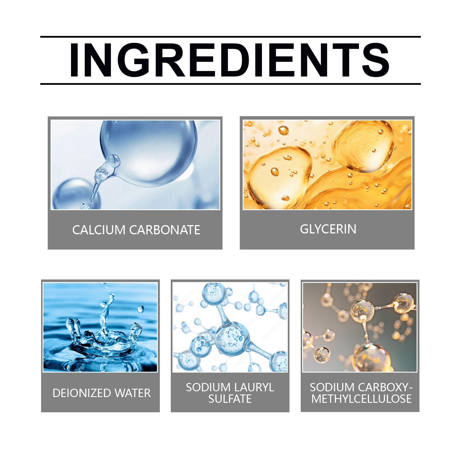 Calcium carbonate, glycerin, deionized water, sodium lauryl sulfate, sodium carboxymethylcellulose