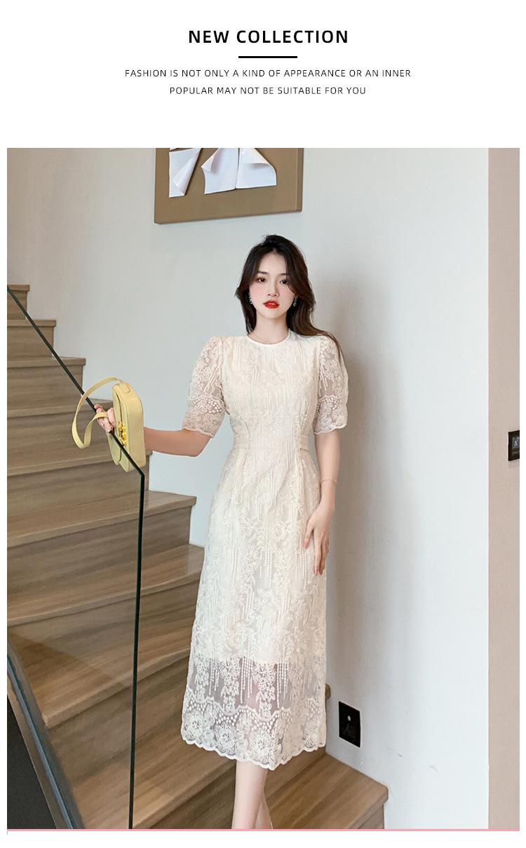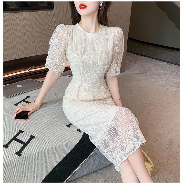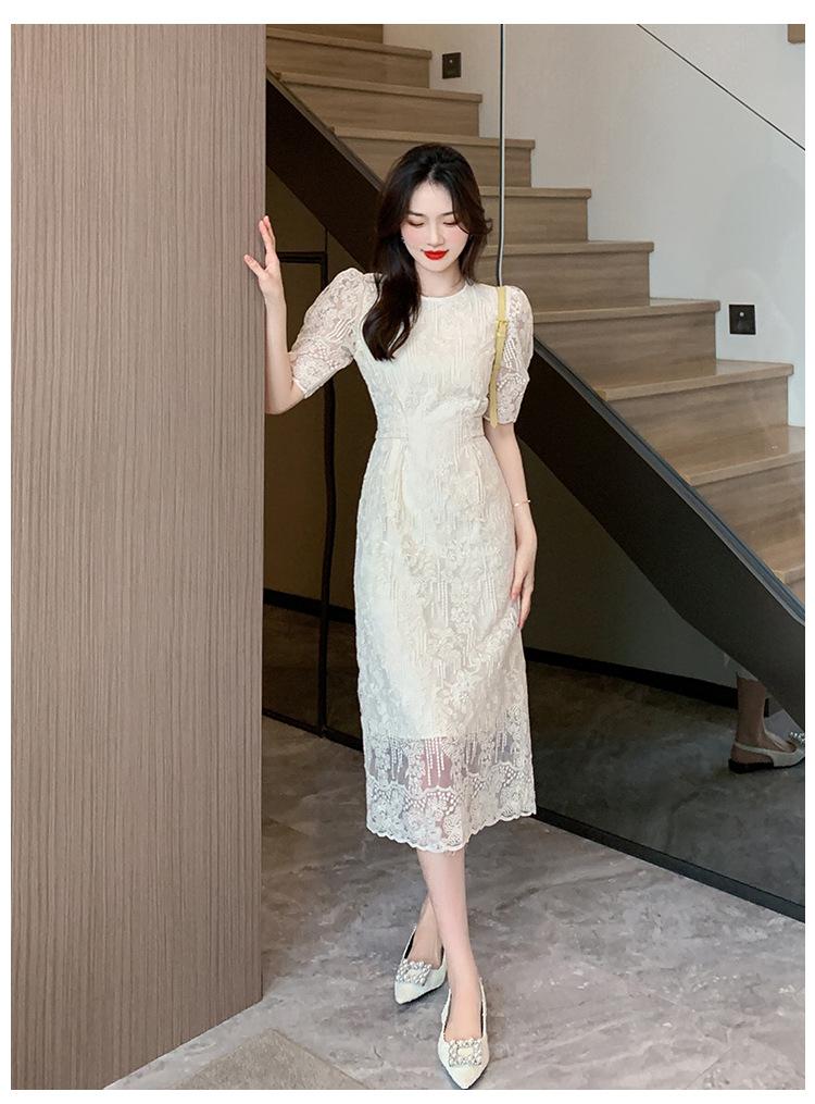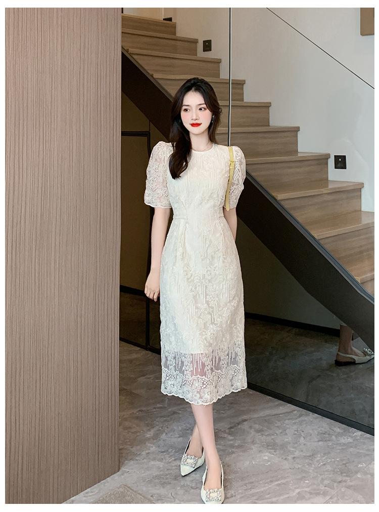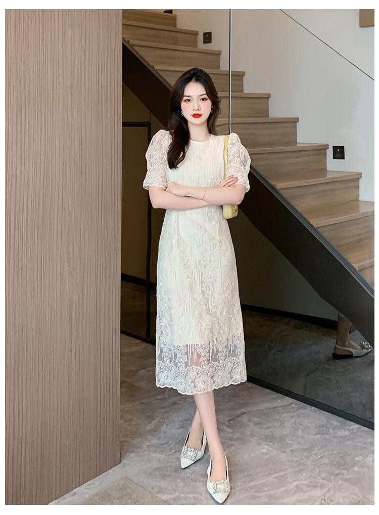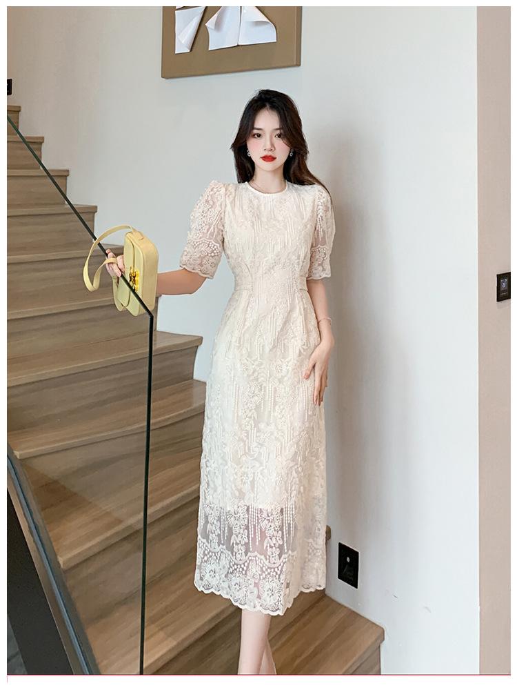 Compra Vestido de encaje francés de tiro real para mujer verano 2023 Nuevo diseño de manga abullonada falda larga 937 al por mayor en Joom.pro