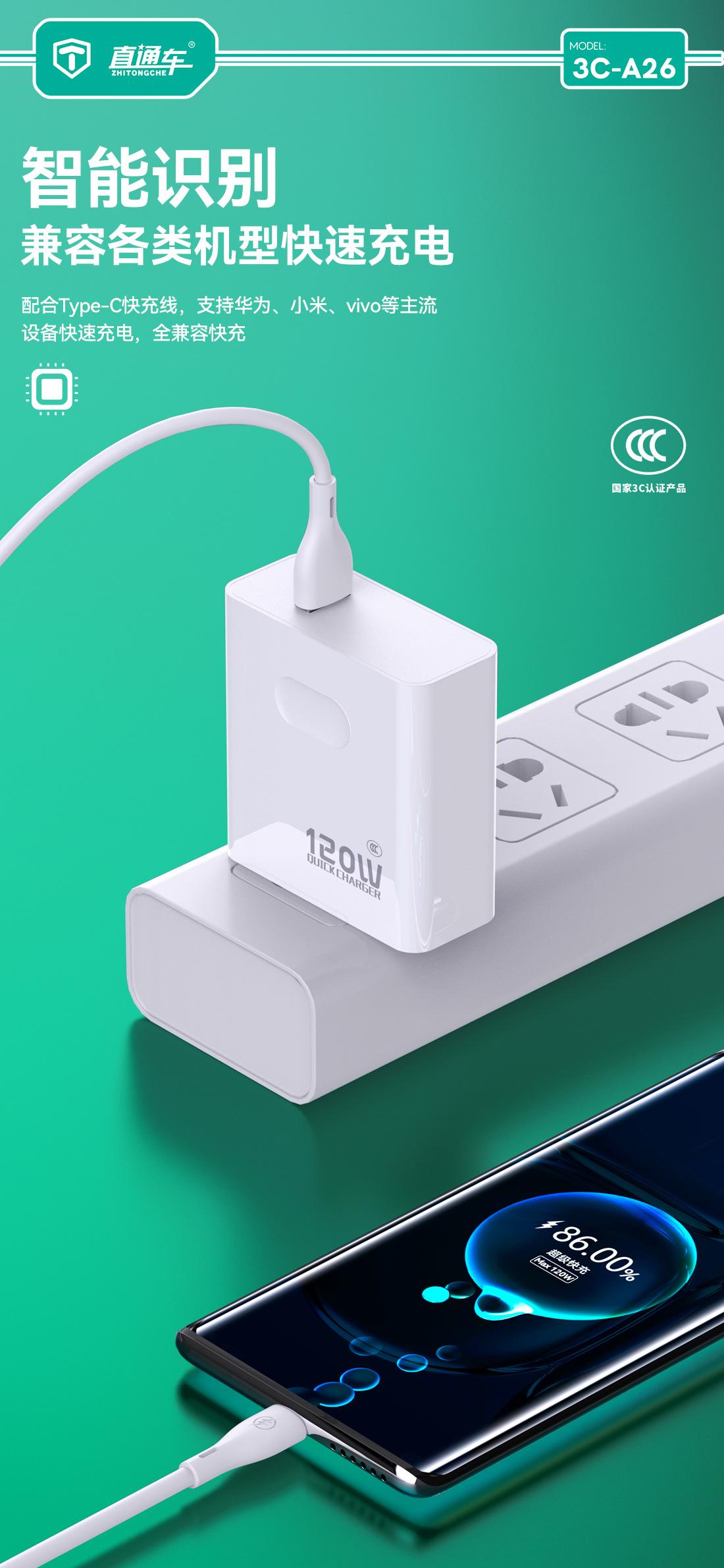 Cargador de 120 W con certificación 3C, compatible con Android, Apple, tipo C, Huawei, cable de datos de carga rápida de 66 W y cabezal.