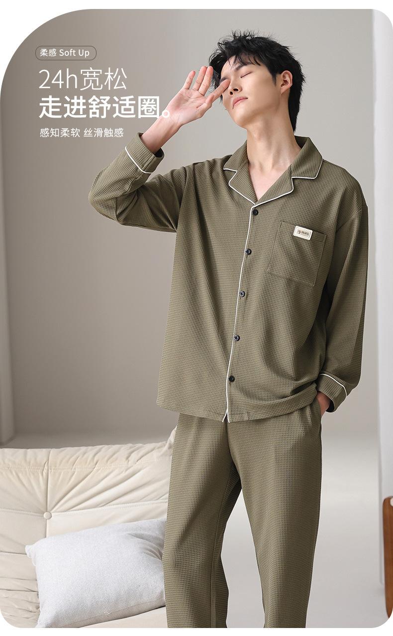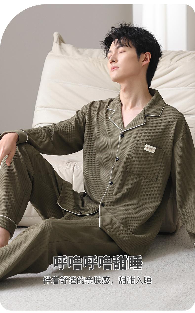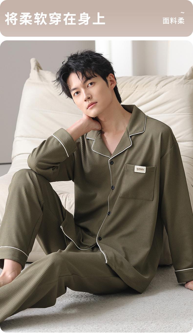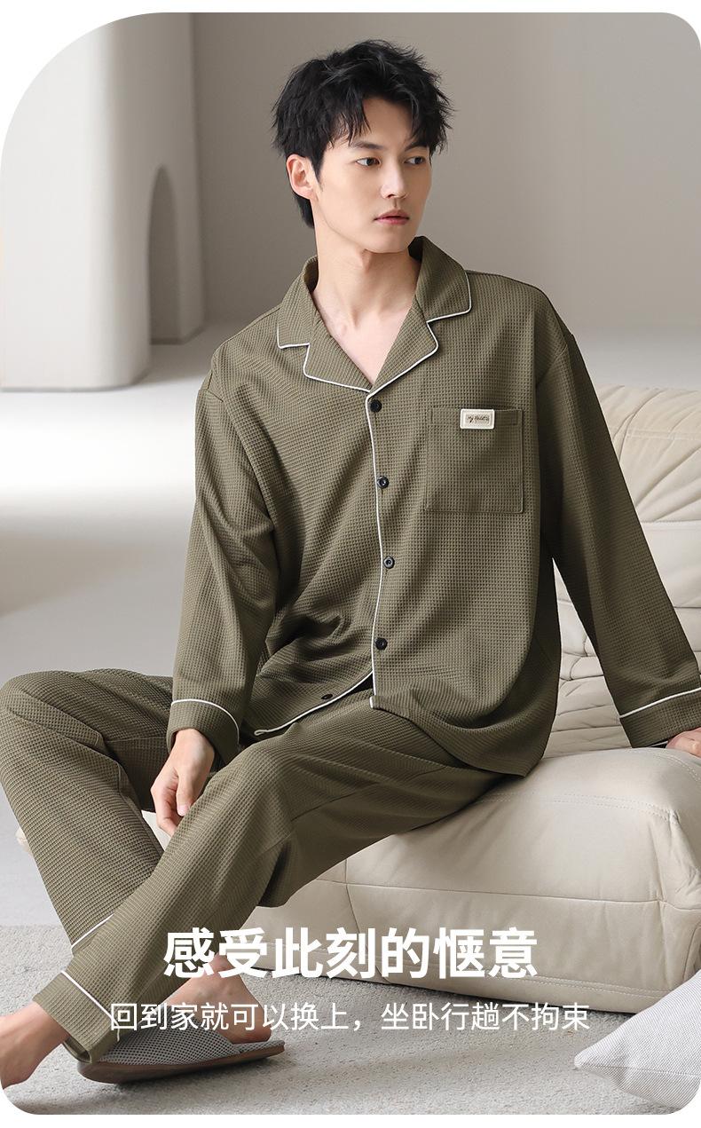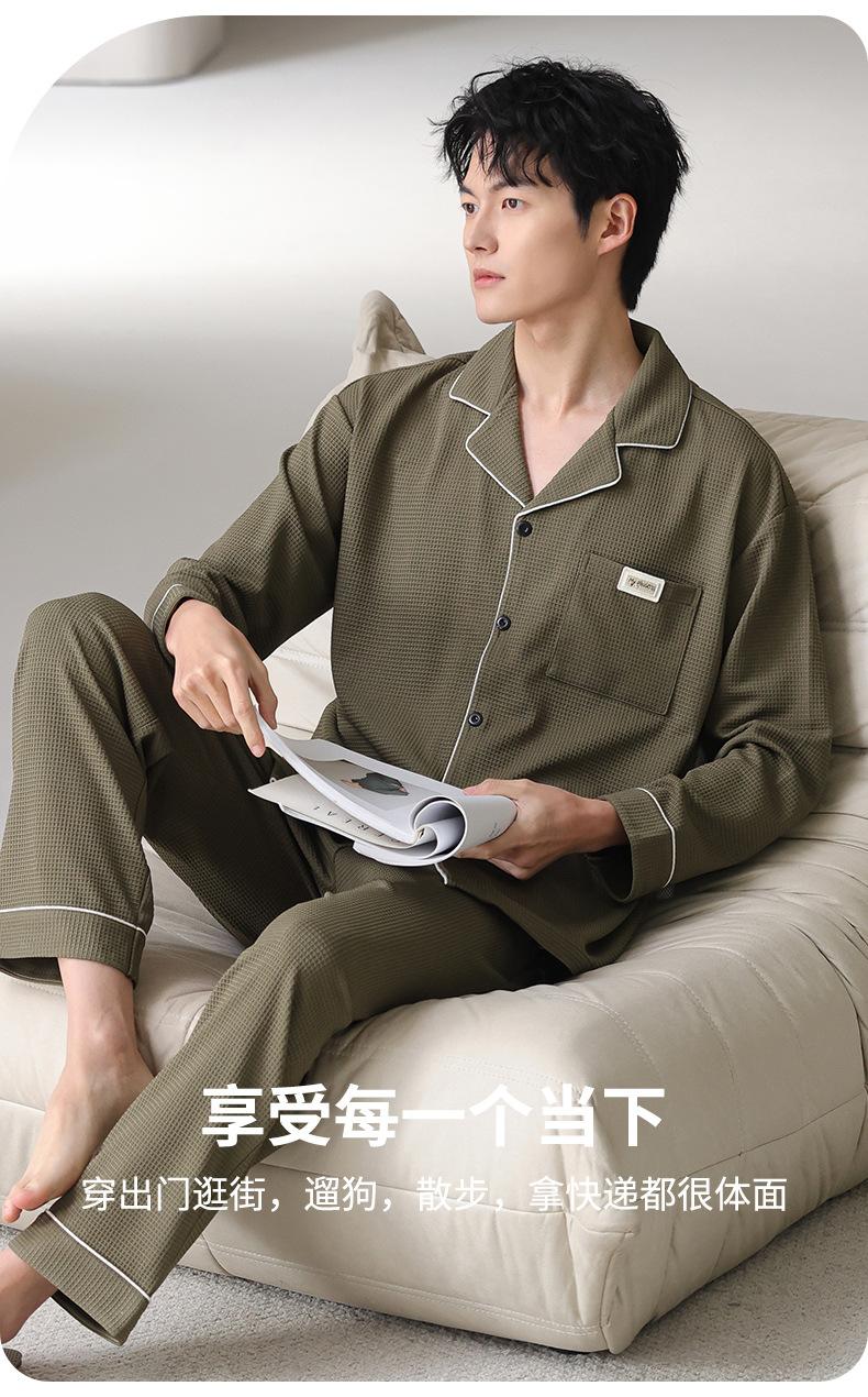 Pijama de Algodón Puro para Hombre Primavera y Otoño Waffles Algodón Puro Talla Grande Cárdigan Manga Larga Traje Ropa de Casa para Exterior Estilo de Hombre