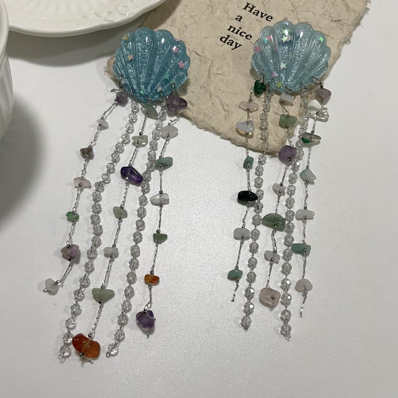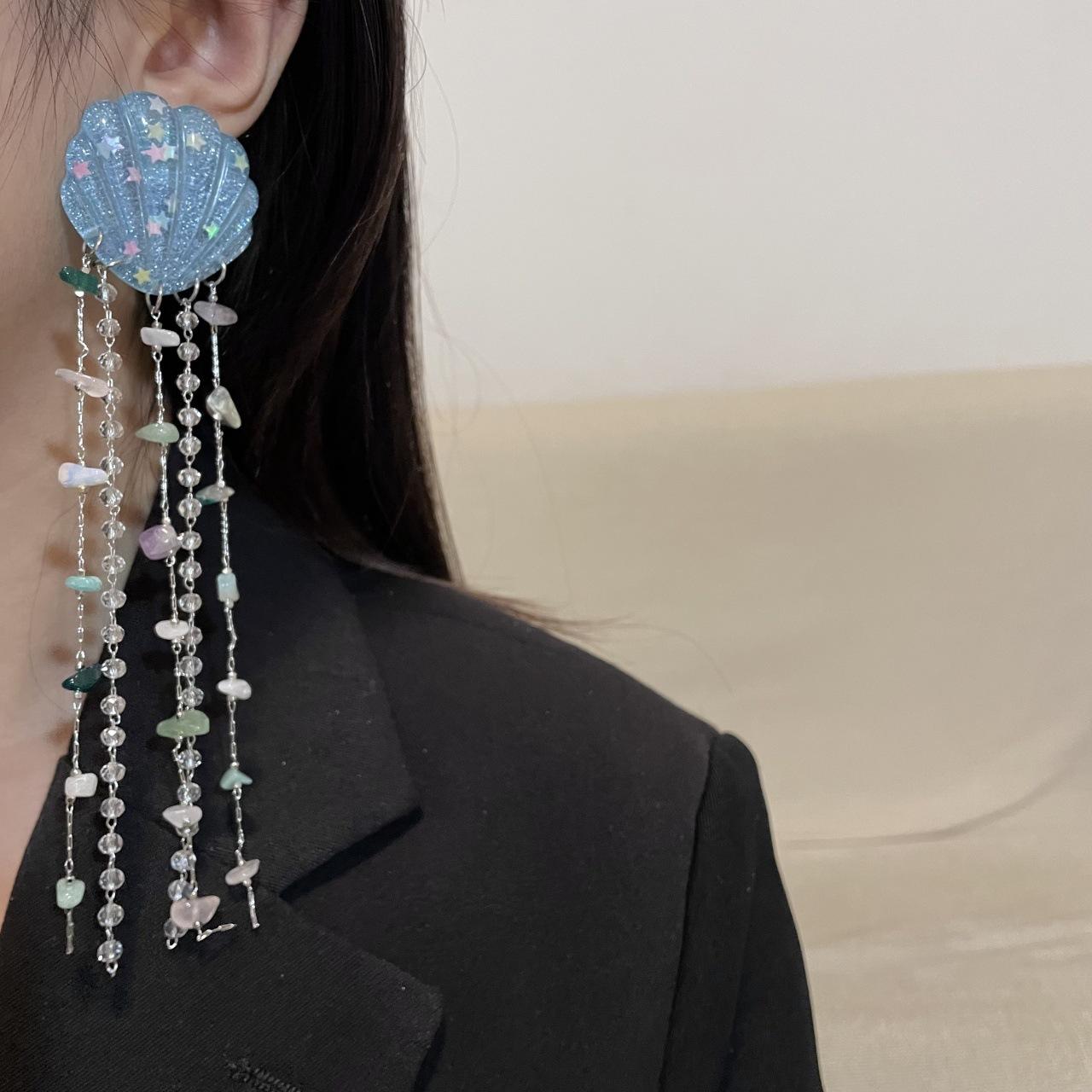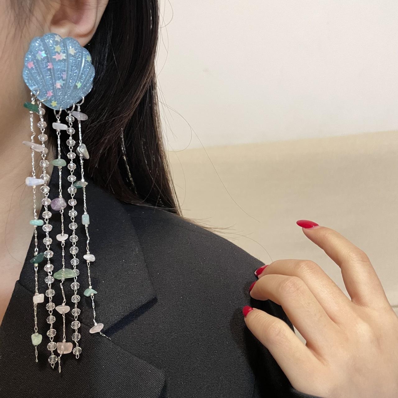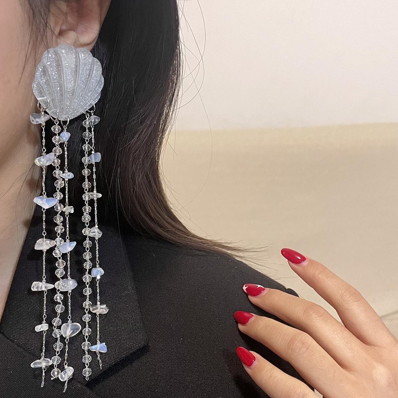 Aretes Largos de Borla de Cristal de Concha de Vida Marina Pequeños Frescos y Elegantes Elegantes de Alta Gama Exagerados Aretes Únicos