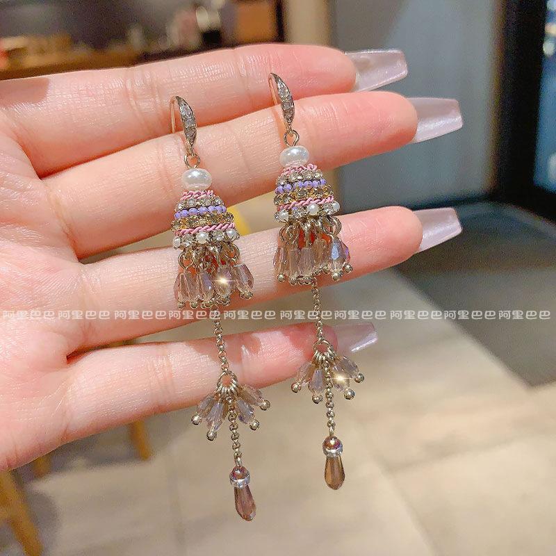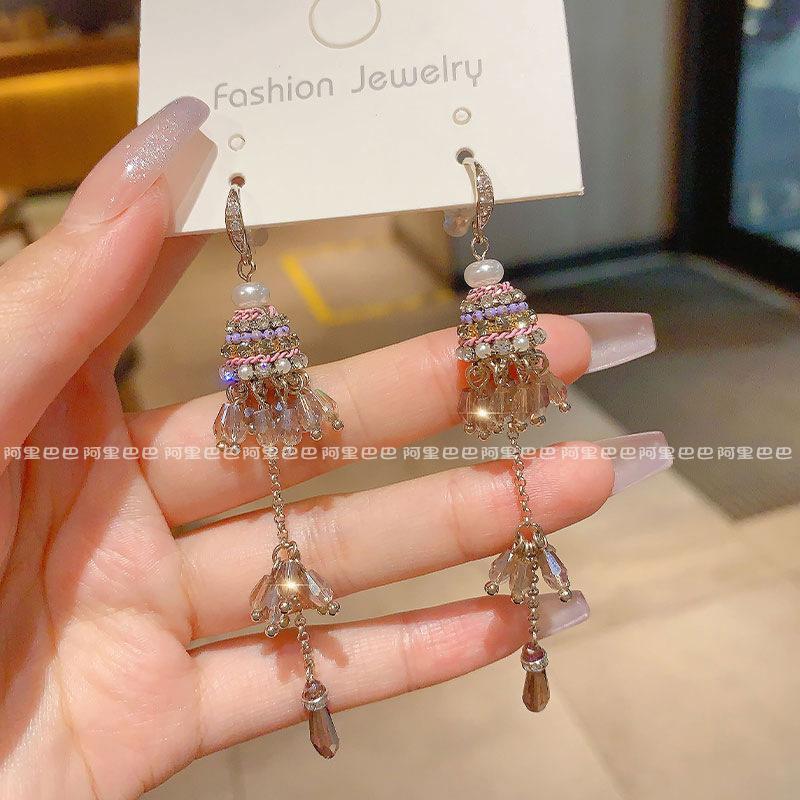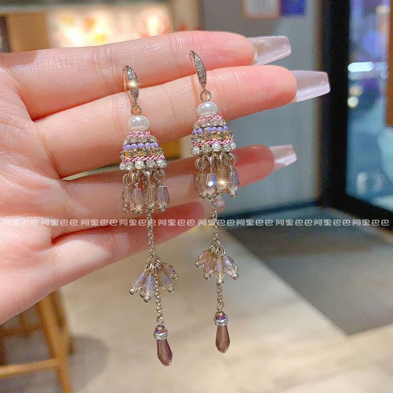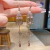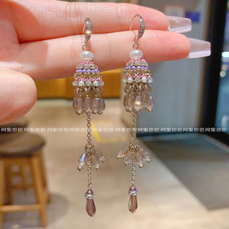 Pendientes de cristal con borlas retro de diseño de alta gama en color rosa, 2024. Elegantes pendientes personalizados de celebridades de Internet para mujer.
