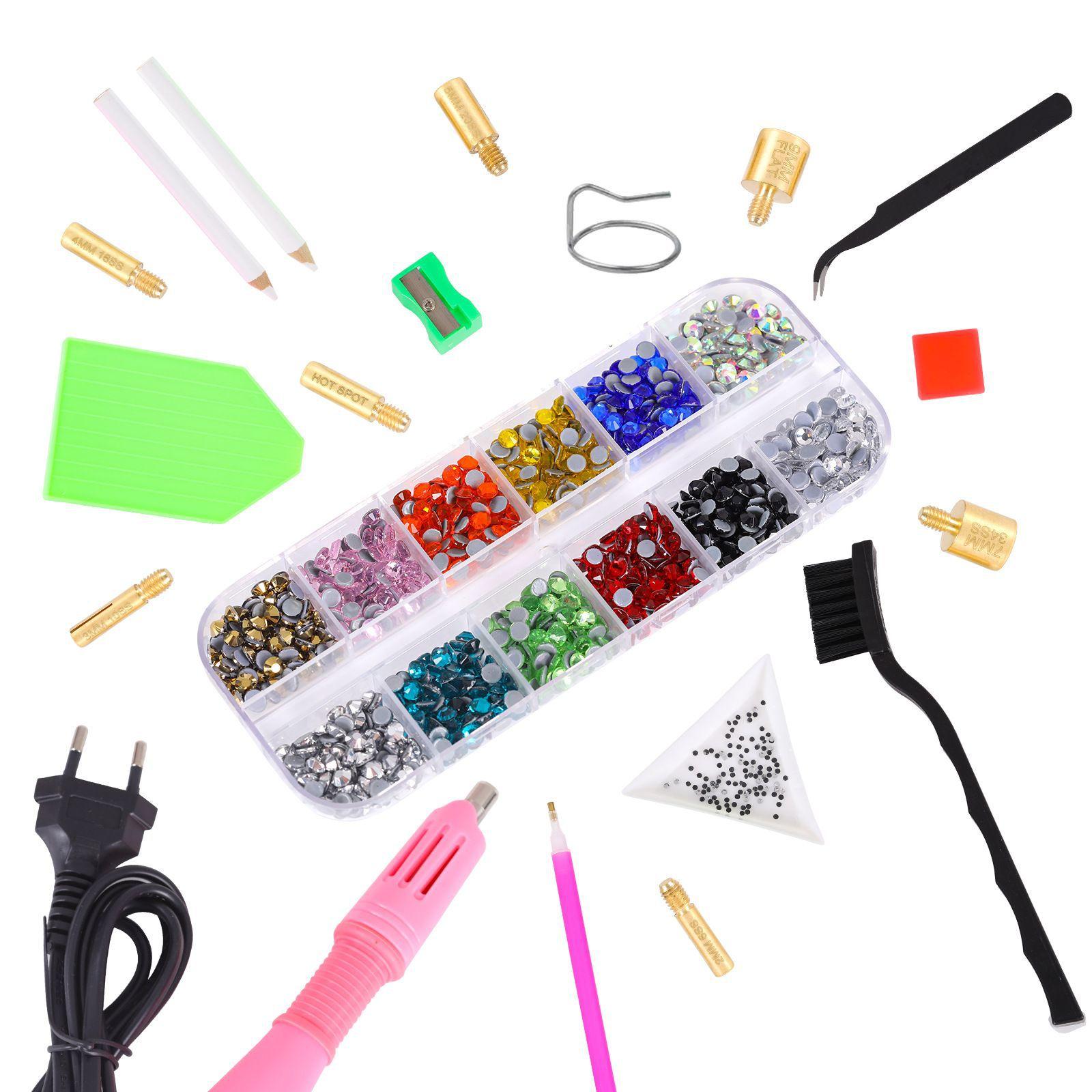 Detalles del producto: juego de taladro caliente (juego de taladro caliente rosa/morado*1, cabezales de taladro caliente*7, marco de soporte*1, cepillo*1, pinzas*1, bolígrafo de puntos blanco*2, bandeja*1, bolígrafo de puntos*1, pegamento*1, plato triangular*1, sacapuntas*1)