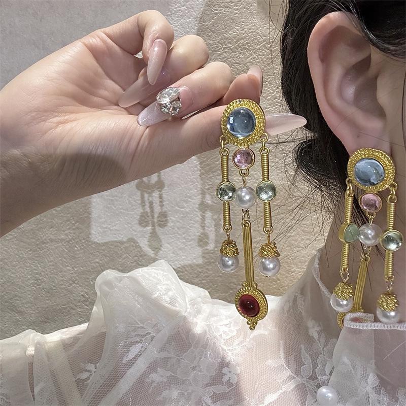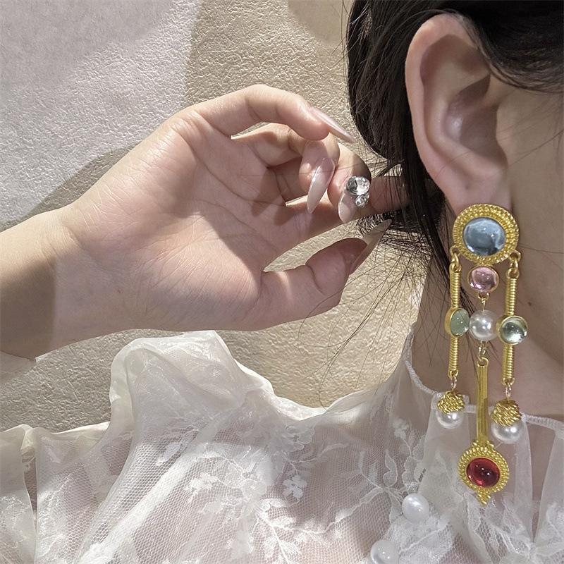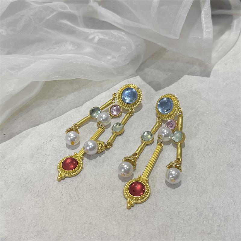 Pendientes vintage con gemas de colores, pendientes redondos de colores contrastantes de estilo antiguo, diseño de nicho, pendientes que combinan con todo.