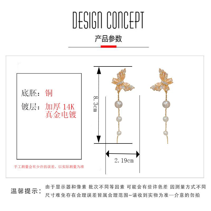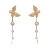 Zircon butterfly pearl tassel earrings (thick real gold plating)