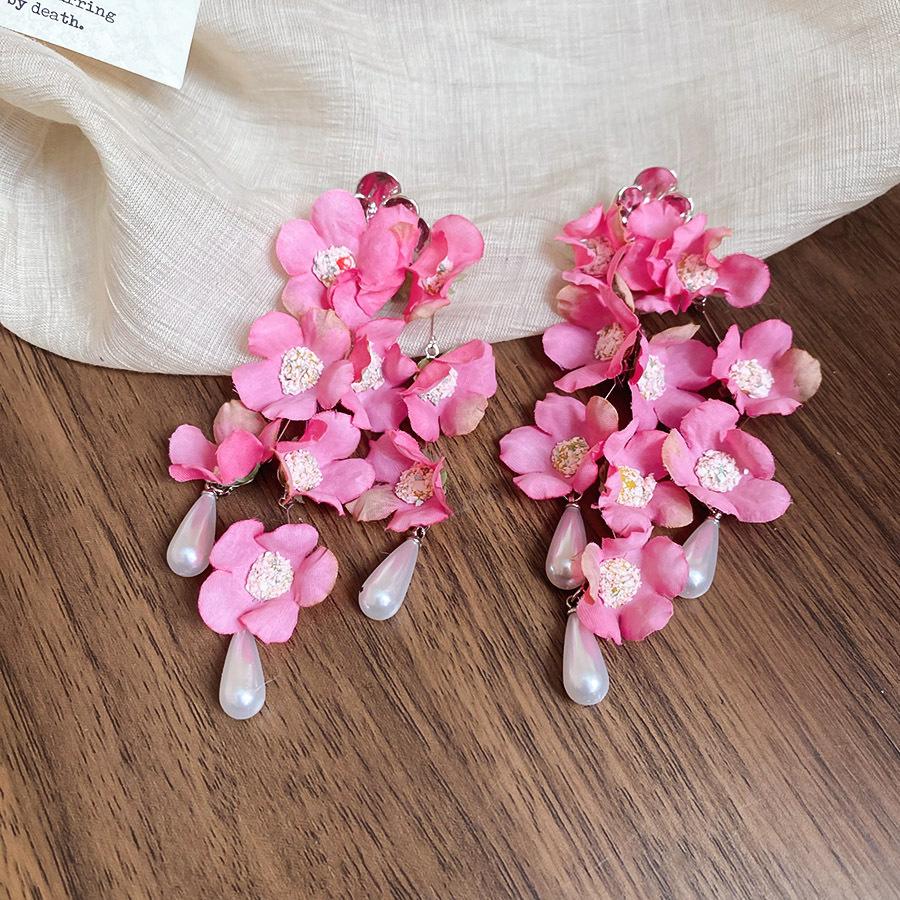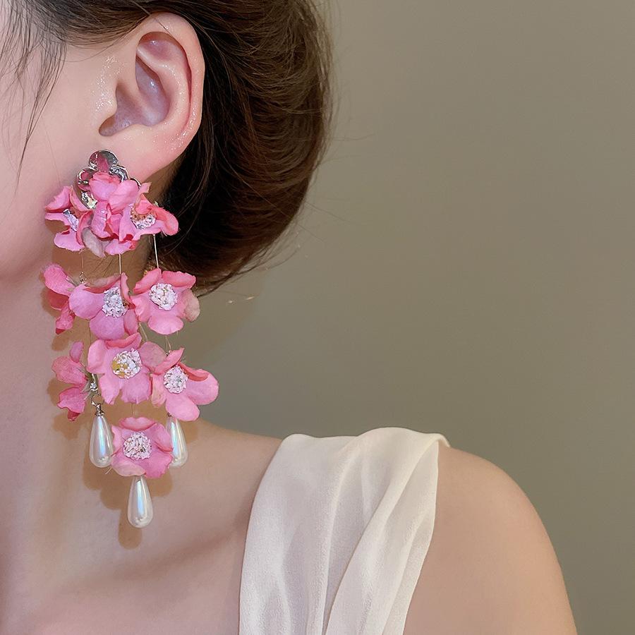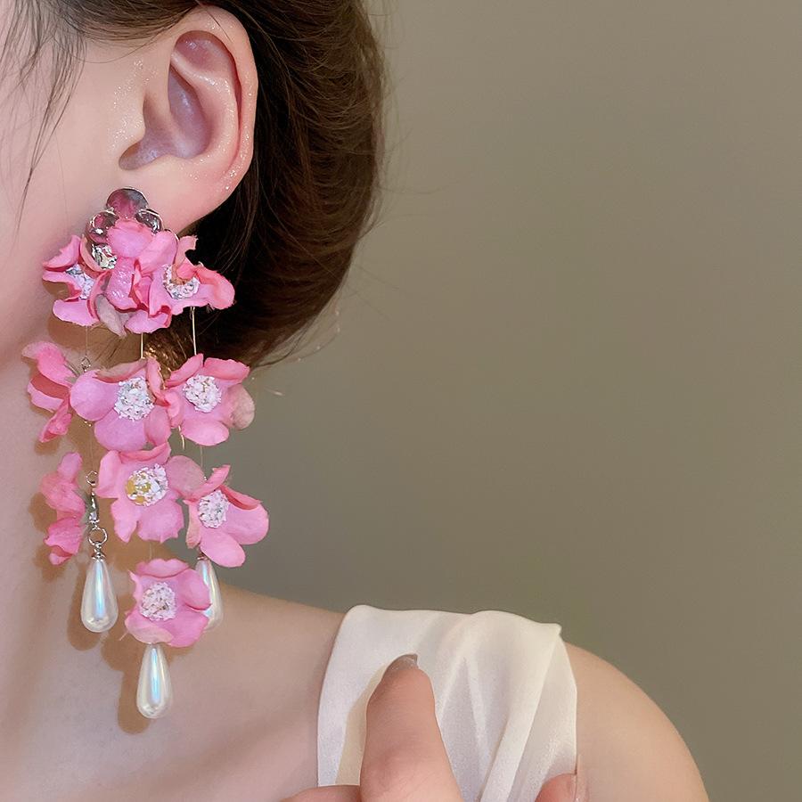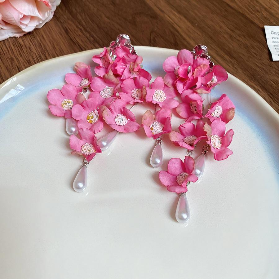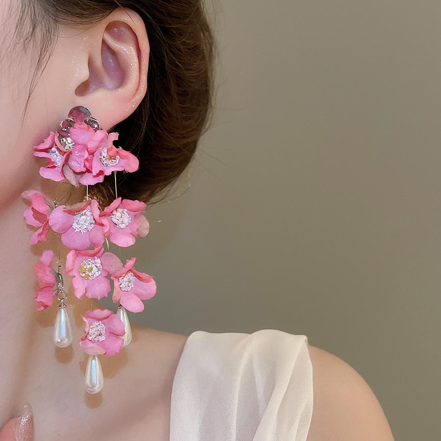 Pendientes de Borla de Flor de Tela Aguja de Plata Perla Pendientes de Temperamento Dulce y Suave Pendientes de Sentido Avanzado Sentido del Diseño Nicho