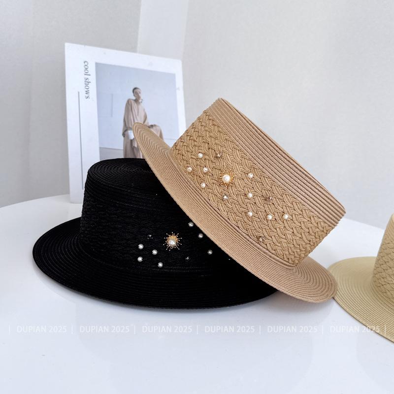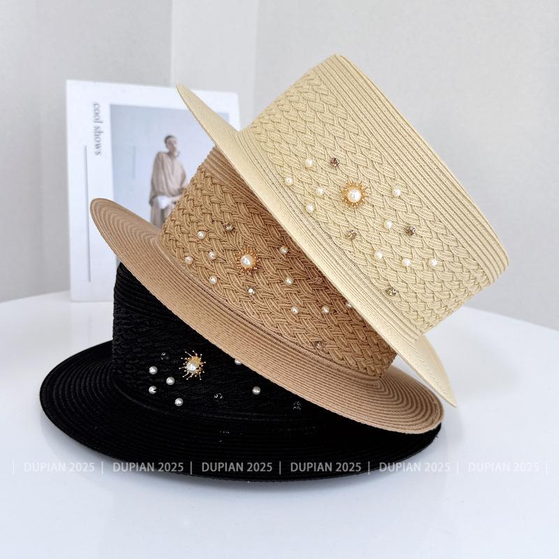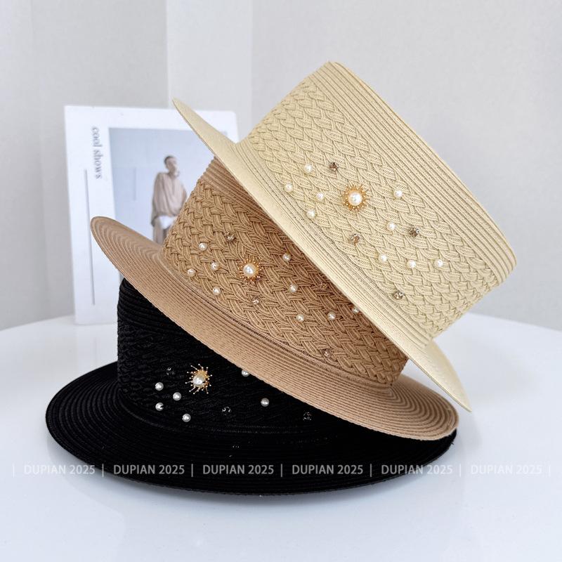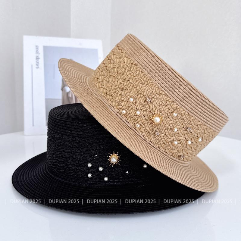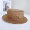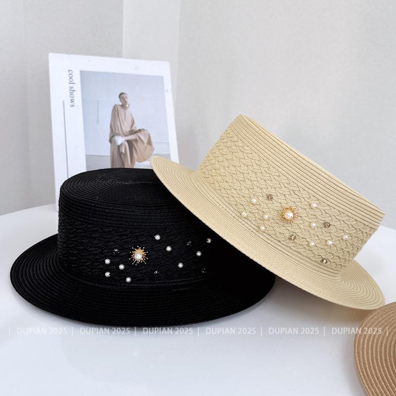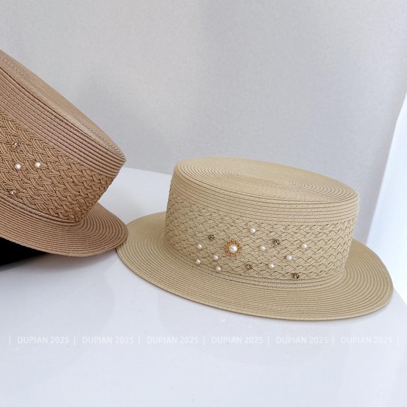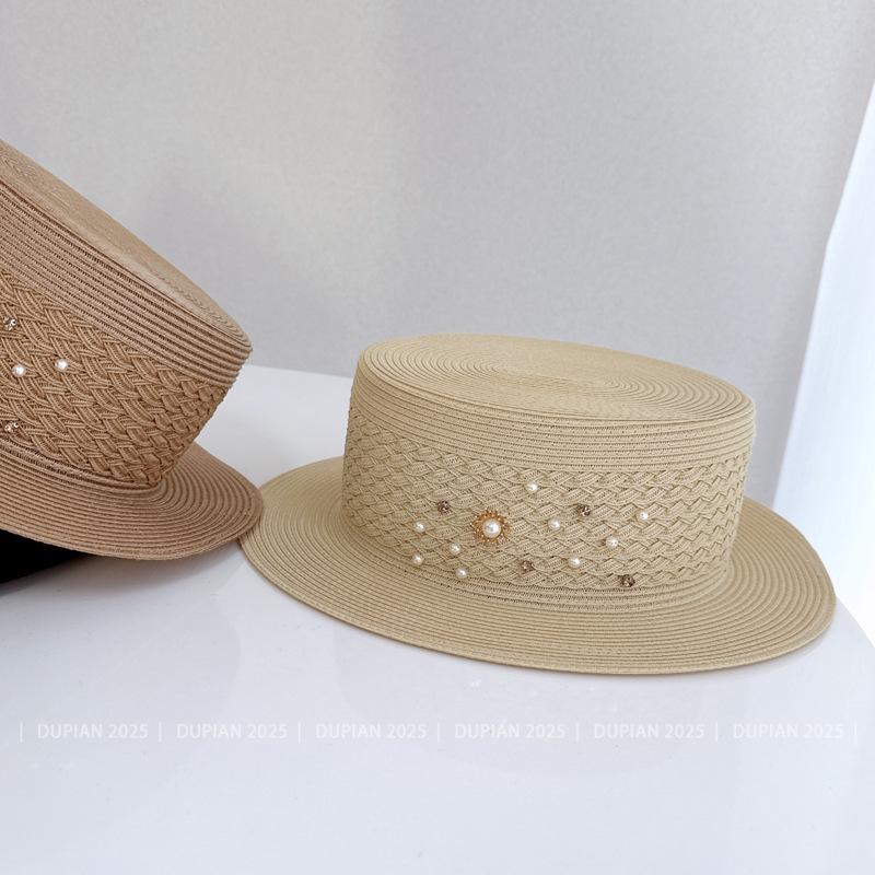 Sombrero de copa plana de flor Sun Pearl de la industria pesada francesa para mujer, sombrero de paja de verano con protección solar, transpirable, con patrón de pez, trenza de PP, sombrero para sombra