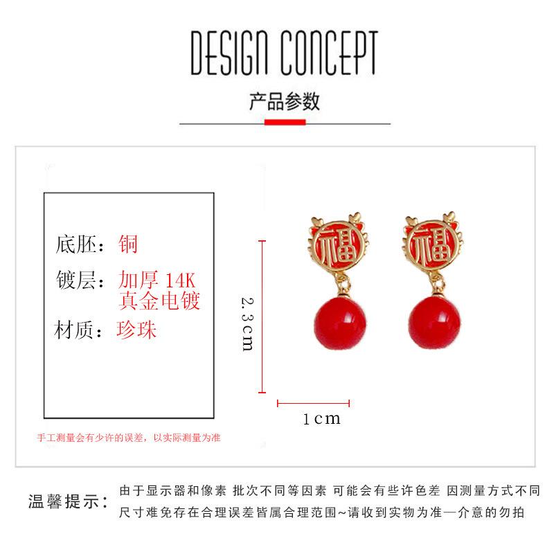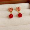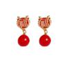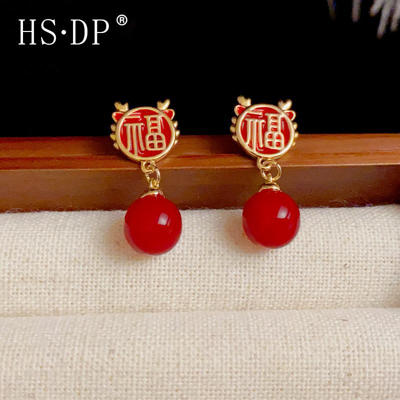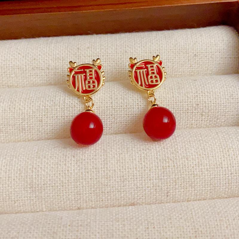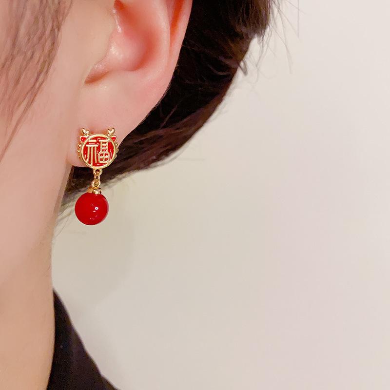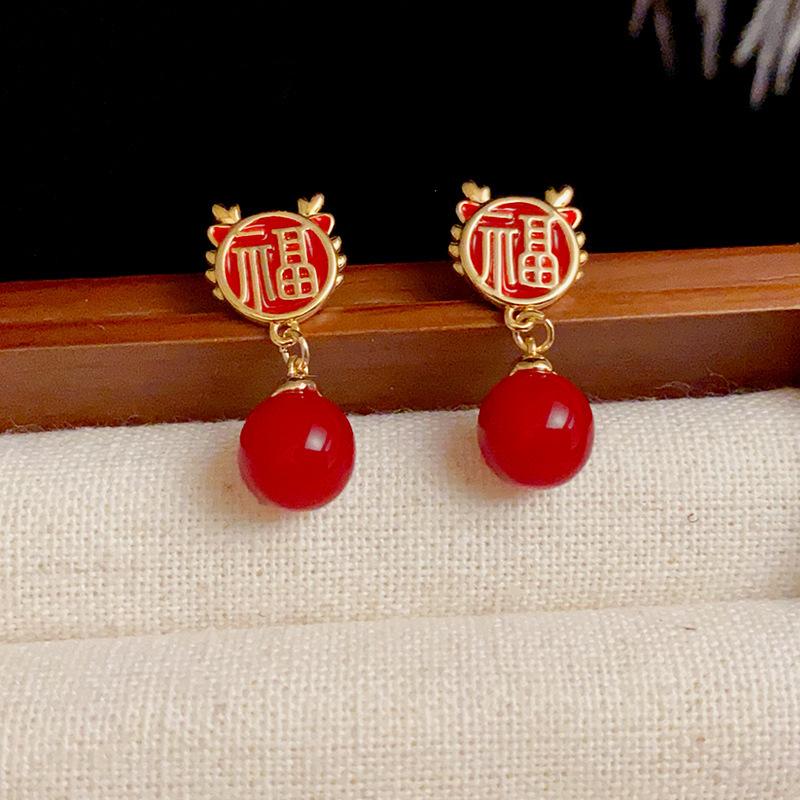 Pendientes elegantes de plata S925 con forma de aguja, con perlas rojas de la fortuna, para el Festival de Primavera, de diseño simple y ligero para mujer.