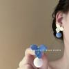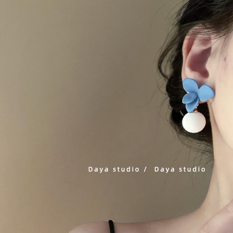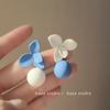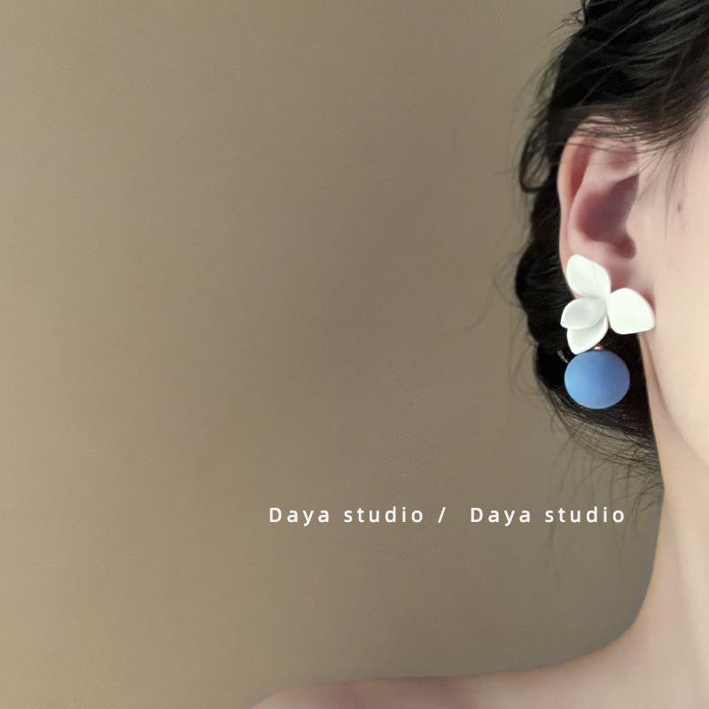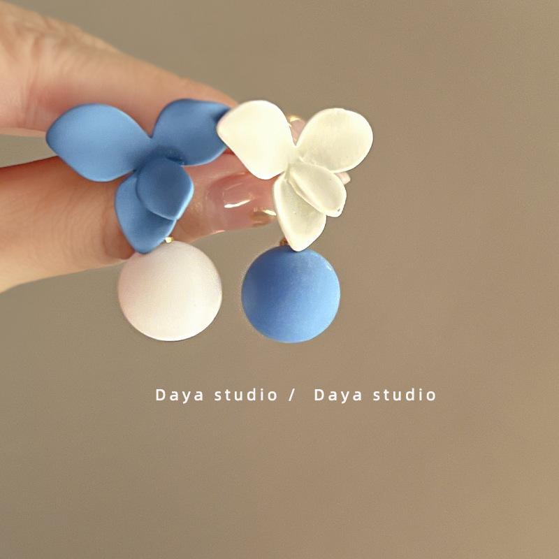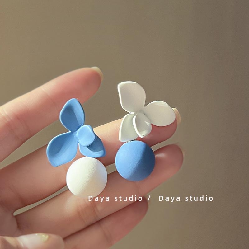 Aretes Asimétricos de Bola de Flores Contrastantes Azul Francés y Blanco Super Hada, Nicho de Alta Gama, Elegantes, Ins, Aretes Simples