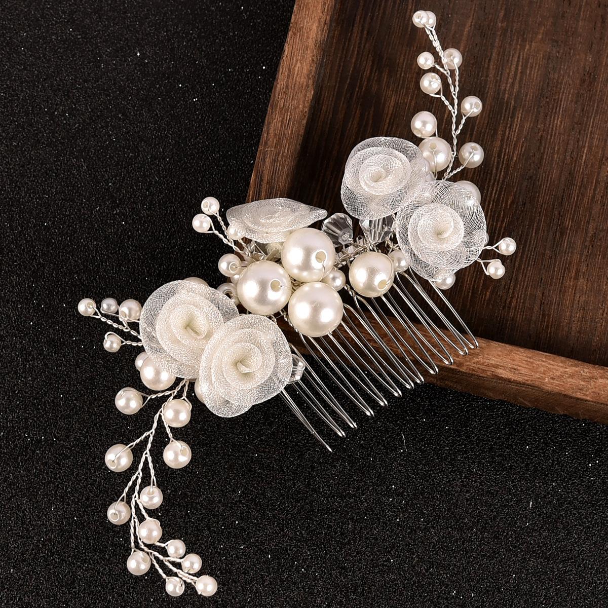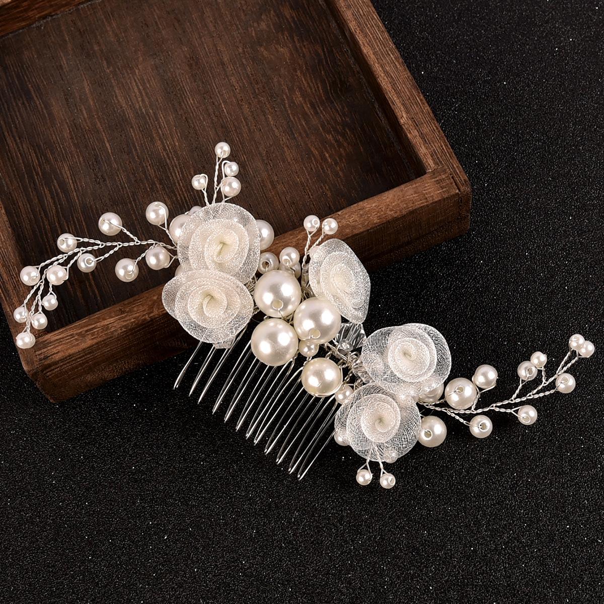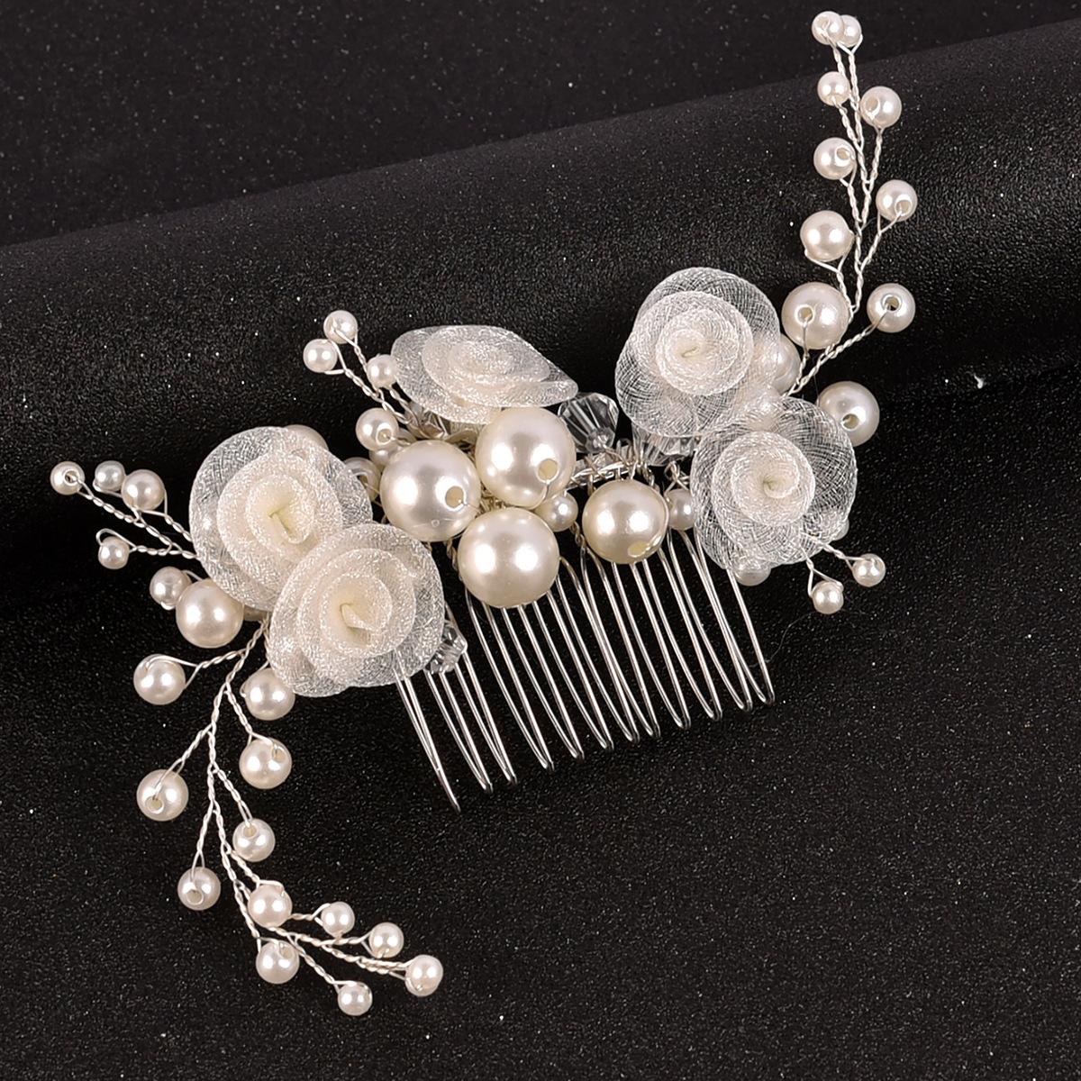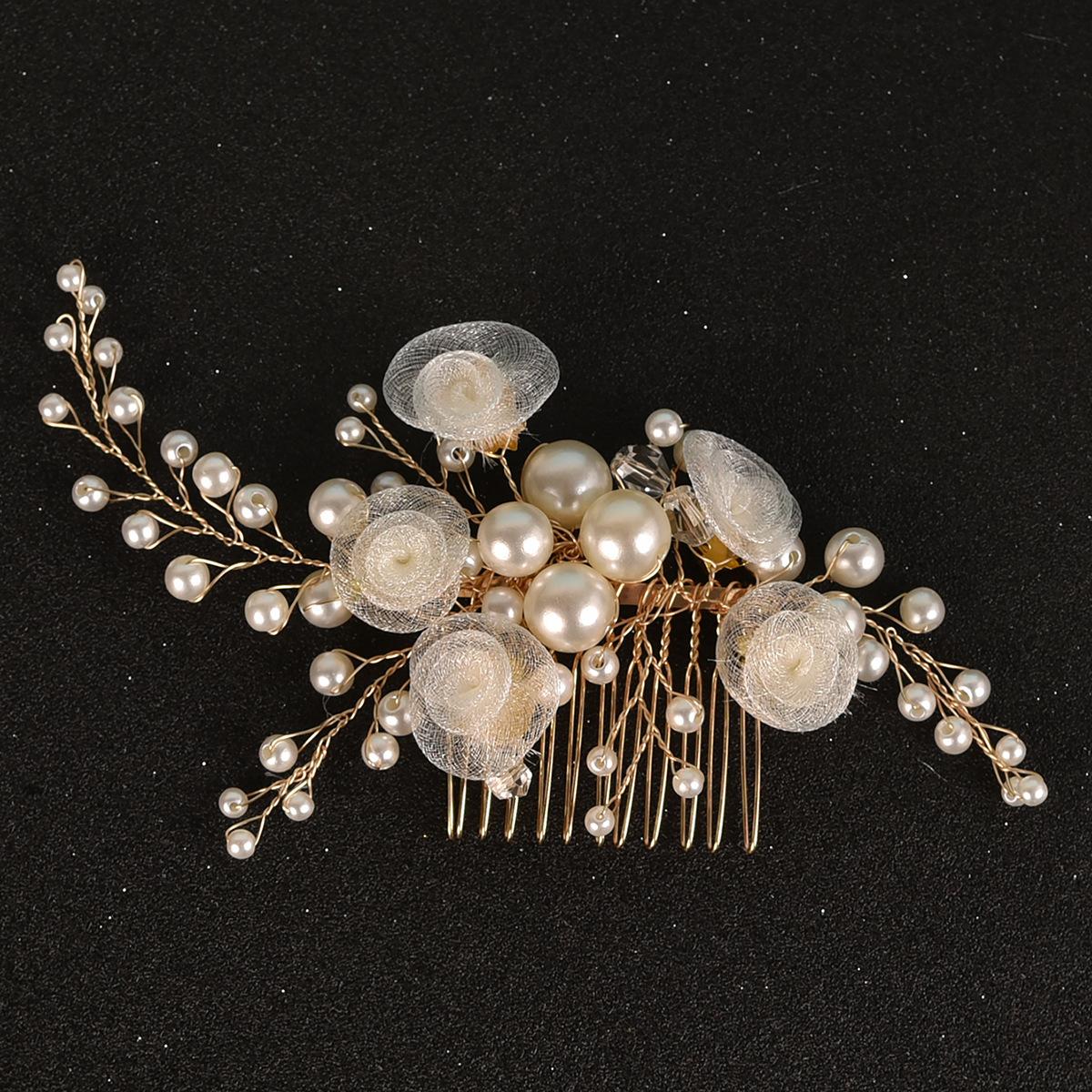 Peineta para el cabello con flor de gasa hecha a mano para novia transfronteriza, tocado, flor de perla, peineta tejida, accesorios para el cabello de boda, fabricantes, venta al por mayor