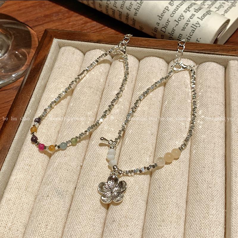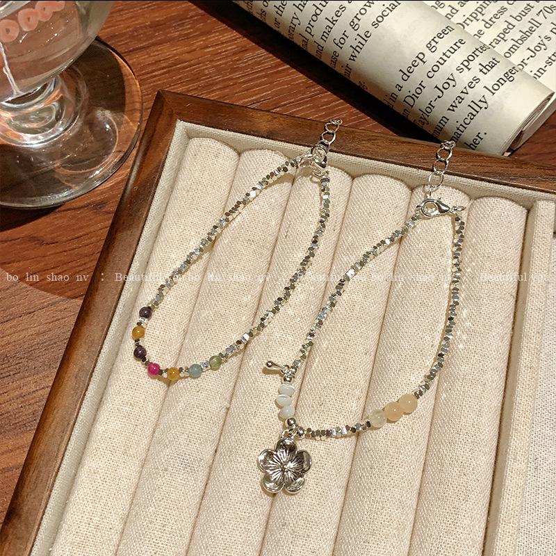 Broken silver tourmaline beaded bracelet, Broken silver flower pendant bracelet