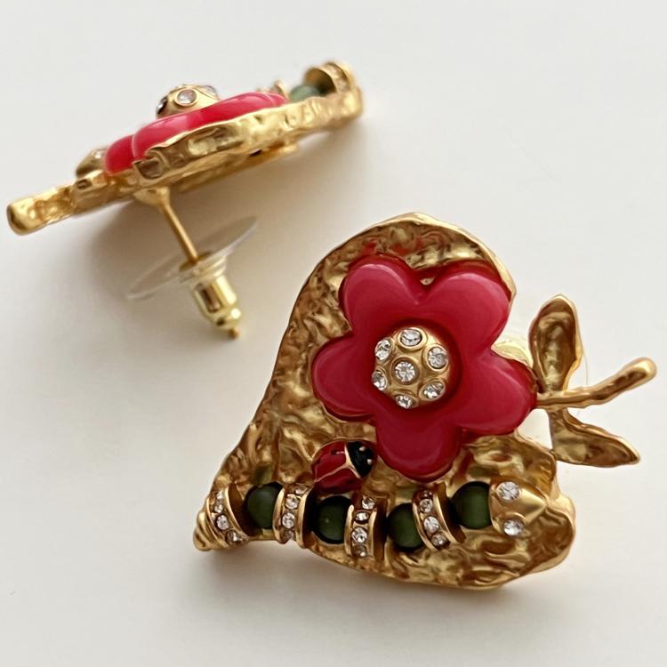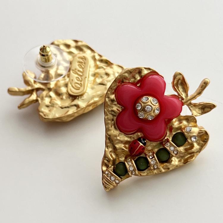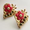 Compra Pendientes grandes con forma de aguja de plata y latón antiguo estilo francés con bola verde y diamantes de imitación y flor roja de fresa dorada de estilo europeo y americano. al por mayor en Joom.pro
