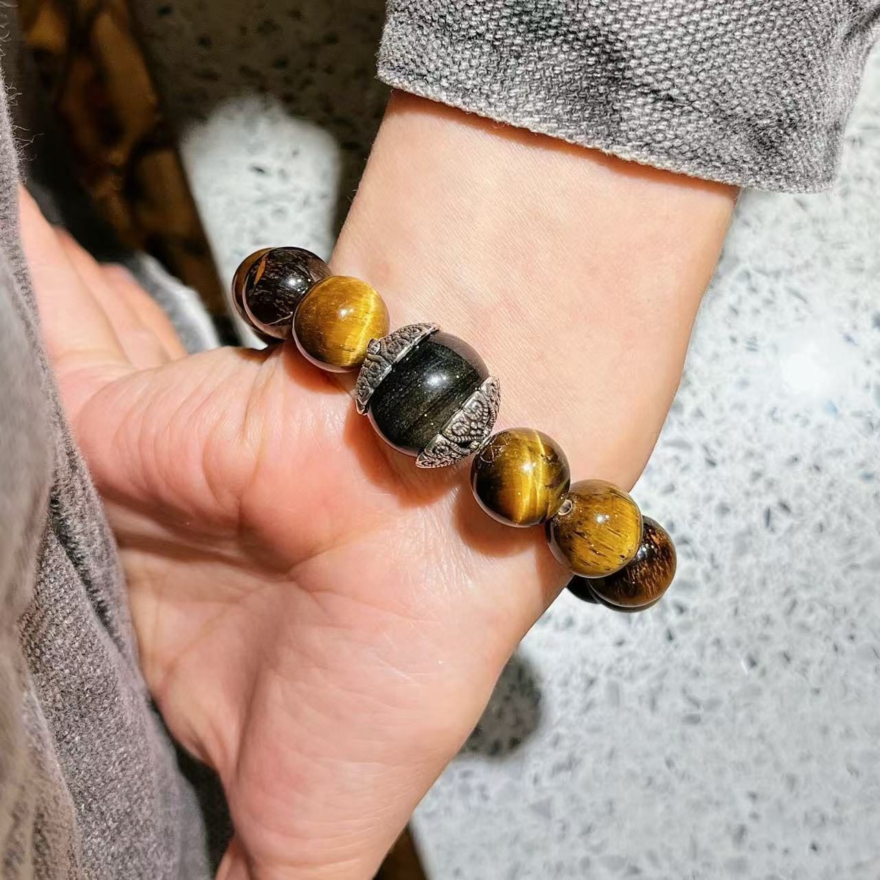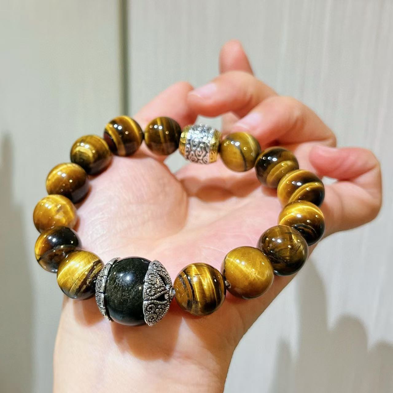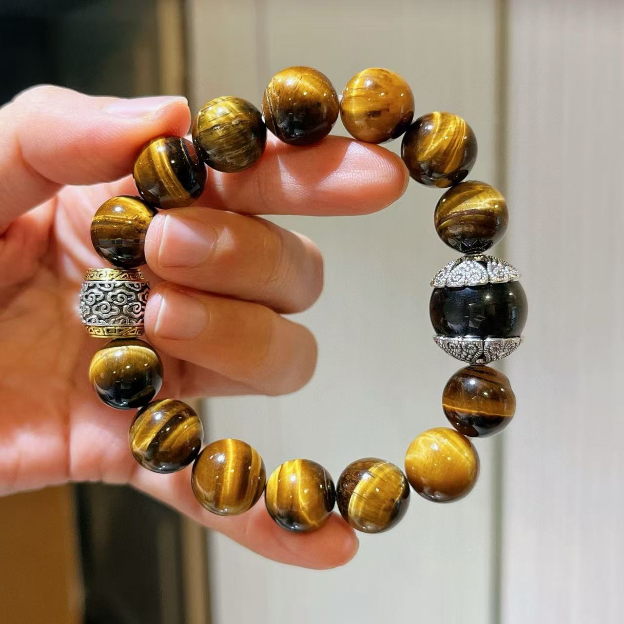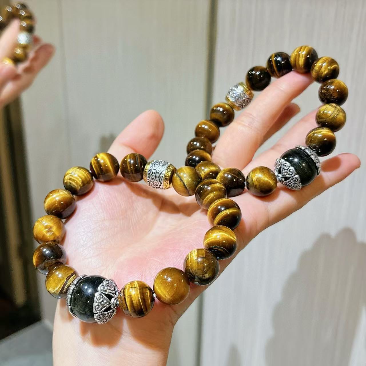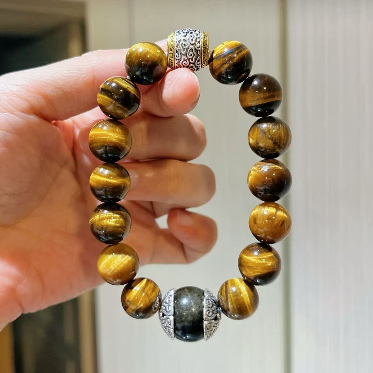 Pulsera de Ojo de Tigre Natural de Grano Grande de 12 mm Pulsera de Obsidiana Plateada de 14 mm de Contraste para Hombre con Sentido del Diseño